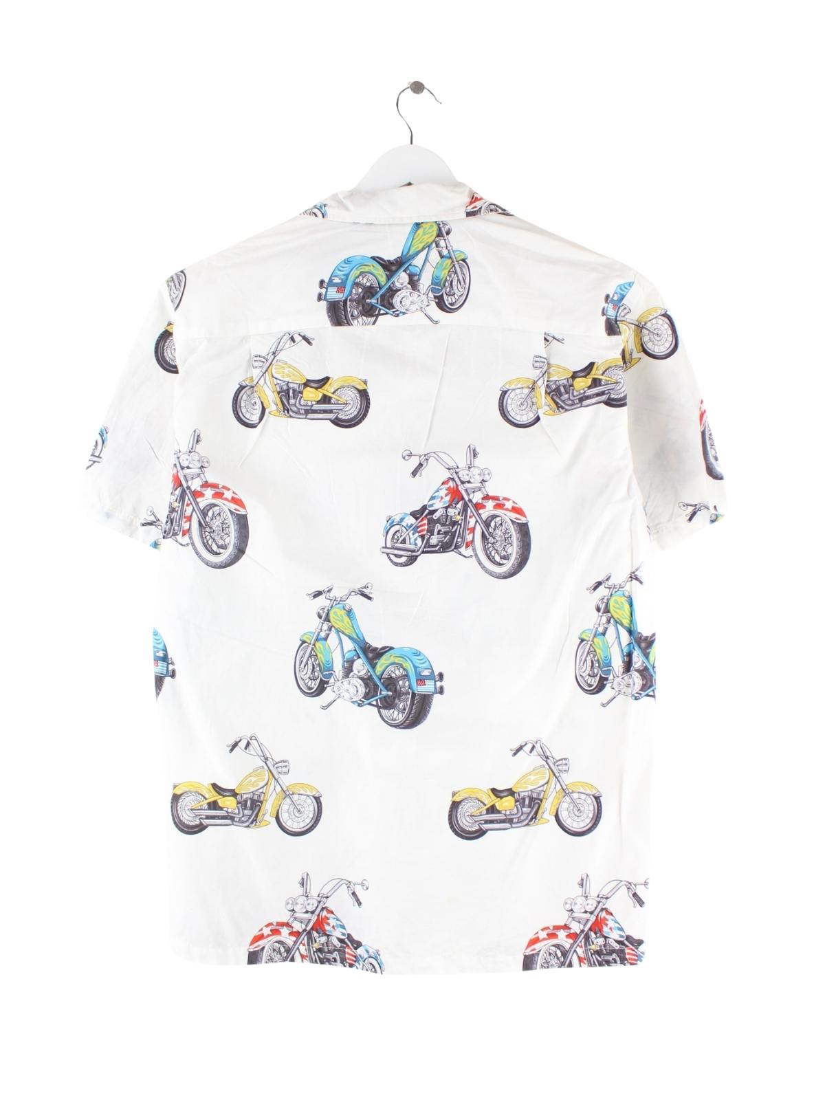 Weißes Vintage Freizeit Hemd aus den 90'ern in Größe M. Es ist aus Baumwolle angefertigt. Den Zustand würden wir als 'In Ordnung' bezeichnen (vergl. Bilder).Mit tollem Biker Print.