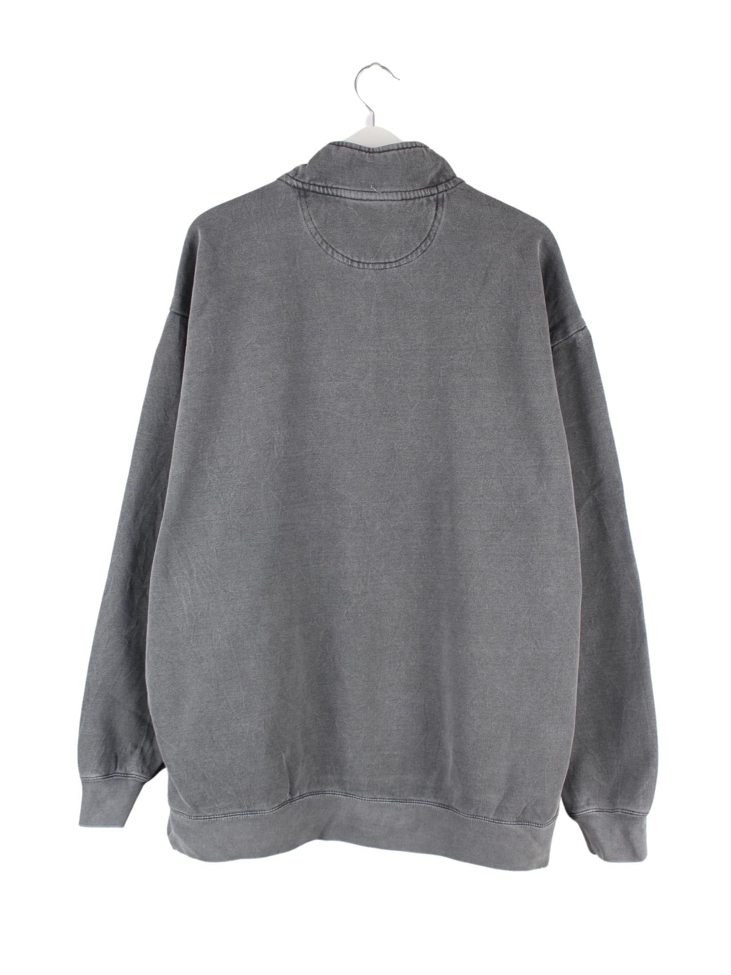 Vintage Sweater mit half Zip in Größe L. Er ist aus einer Baumwollmischung gemacht und in Grau zu haben.