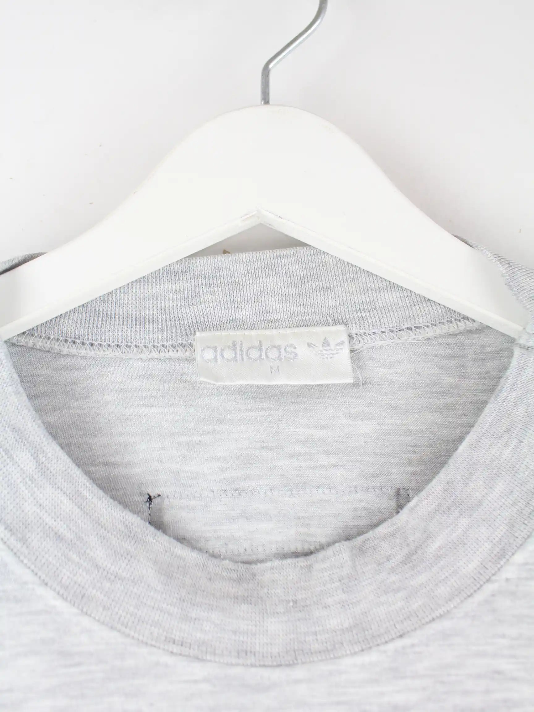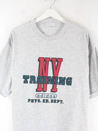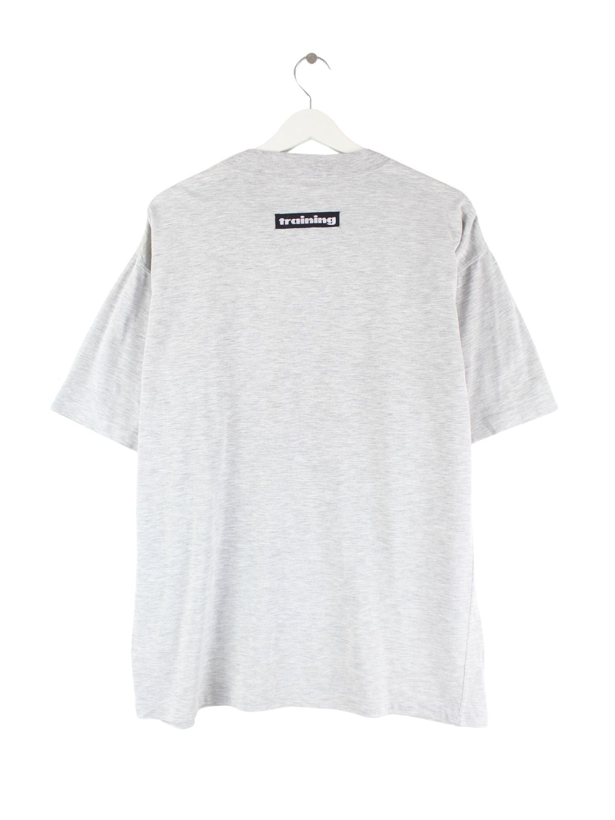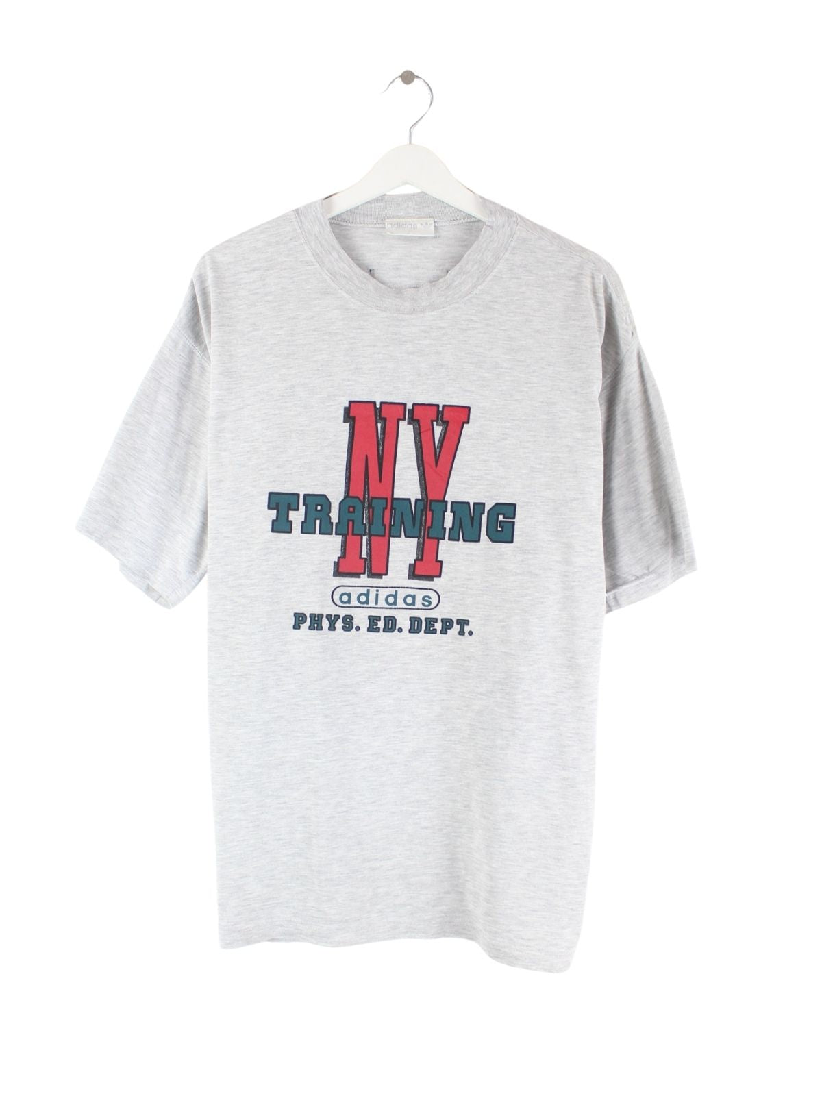 Graues T-Shirt der Brand Adidas aus den 80'ern in Größe L. Es ist aus Baumwolle und in gutem Zustand im Bestand. Mit seltenem Training Print.