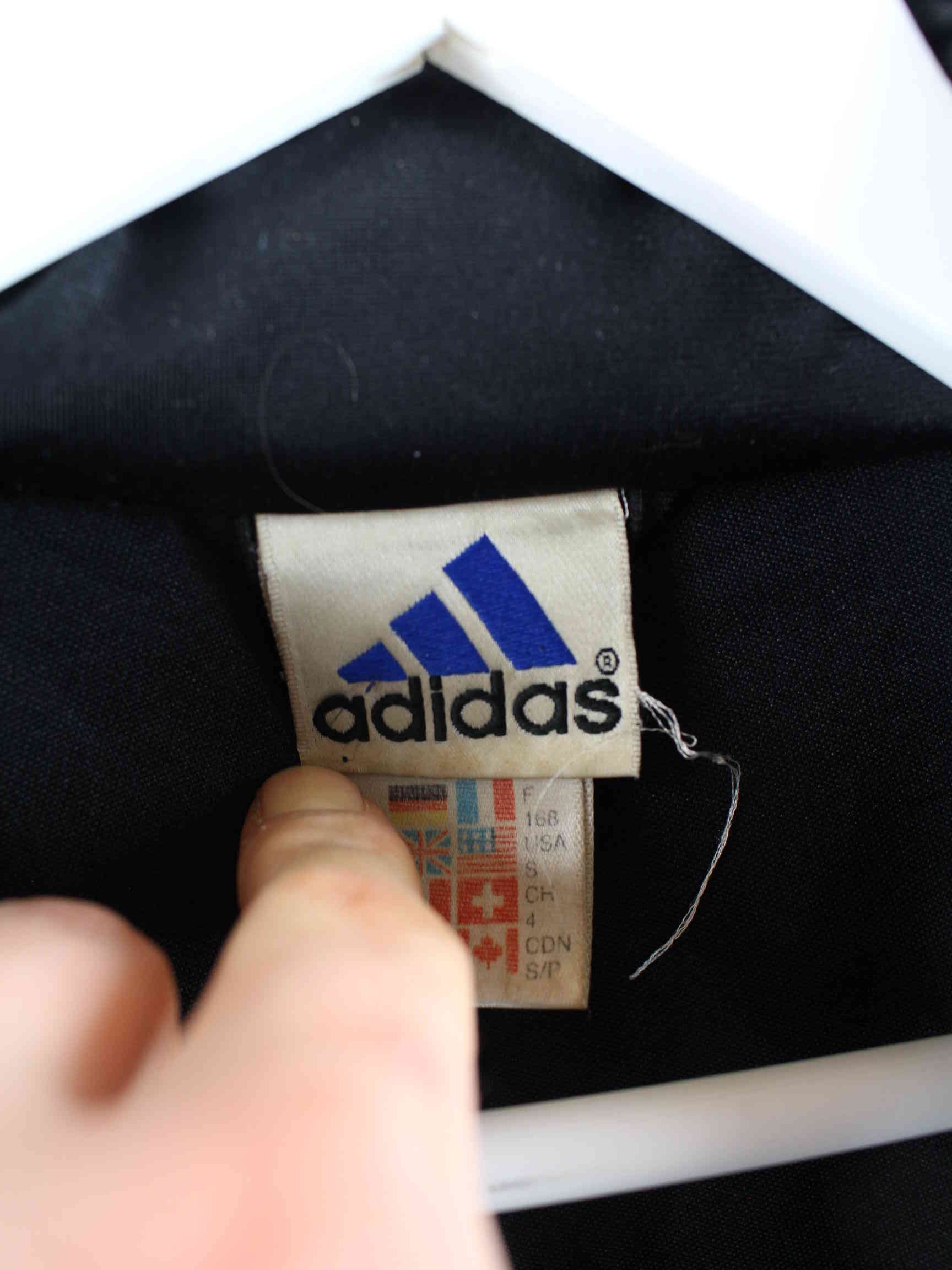 Trainingsjacke der Marke Adidas in Größe M aus den 90'ern. Sie ist aus Synthetik hergestellt und in Schwarz im Bestand.