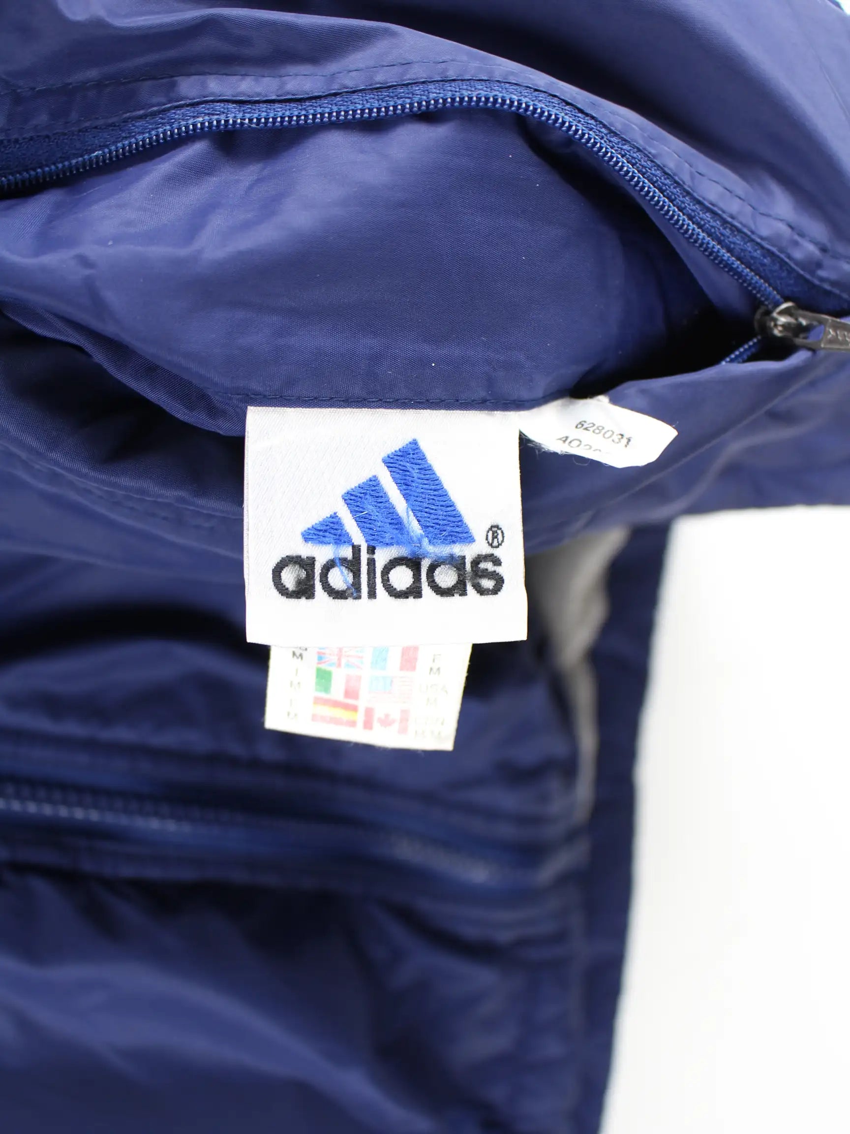Blaue Jacke vom Label Adidas aus den 90'ern in Größe XL. Sie ist aus Synthetik gefertigt. Den Zustand würden wir als 'In Ordnung' bezeichnen (vergl. Bilder).