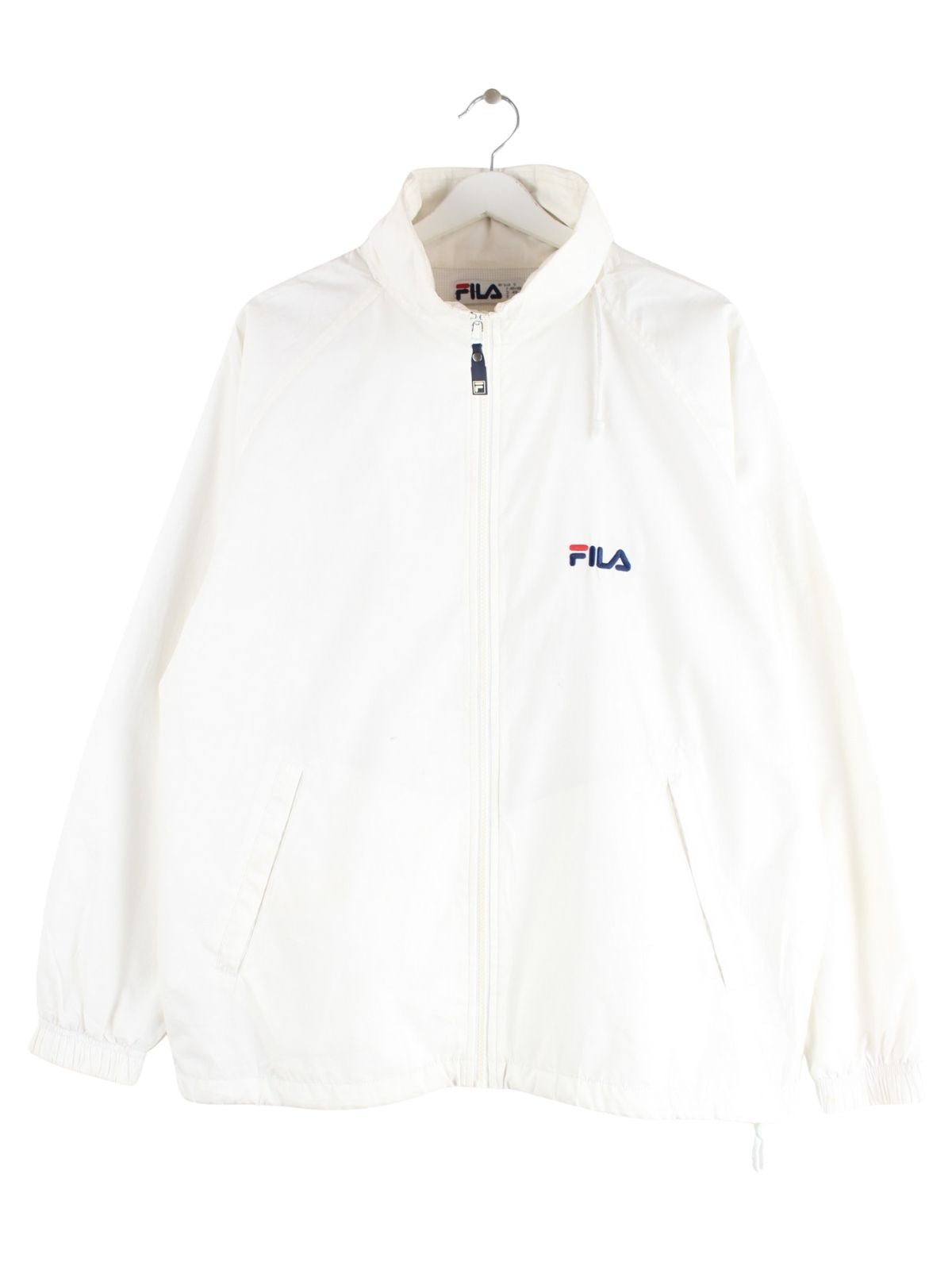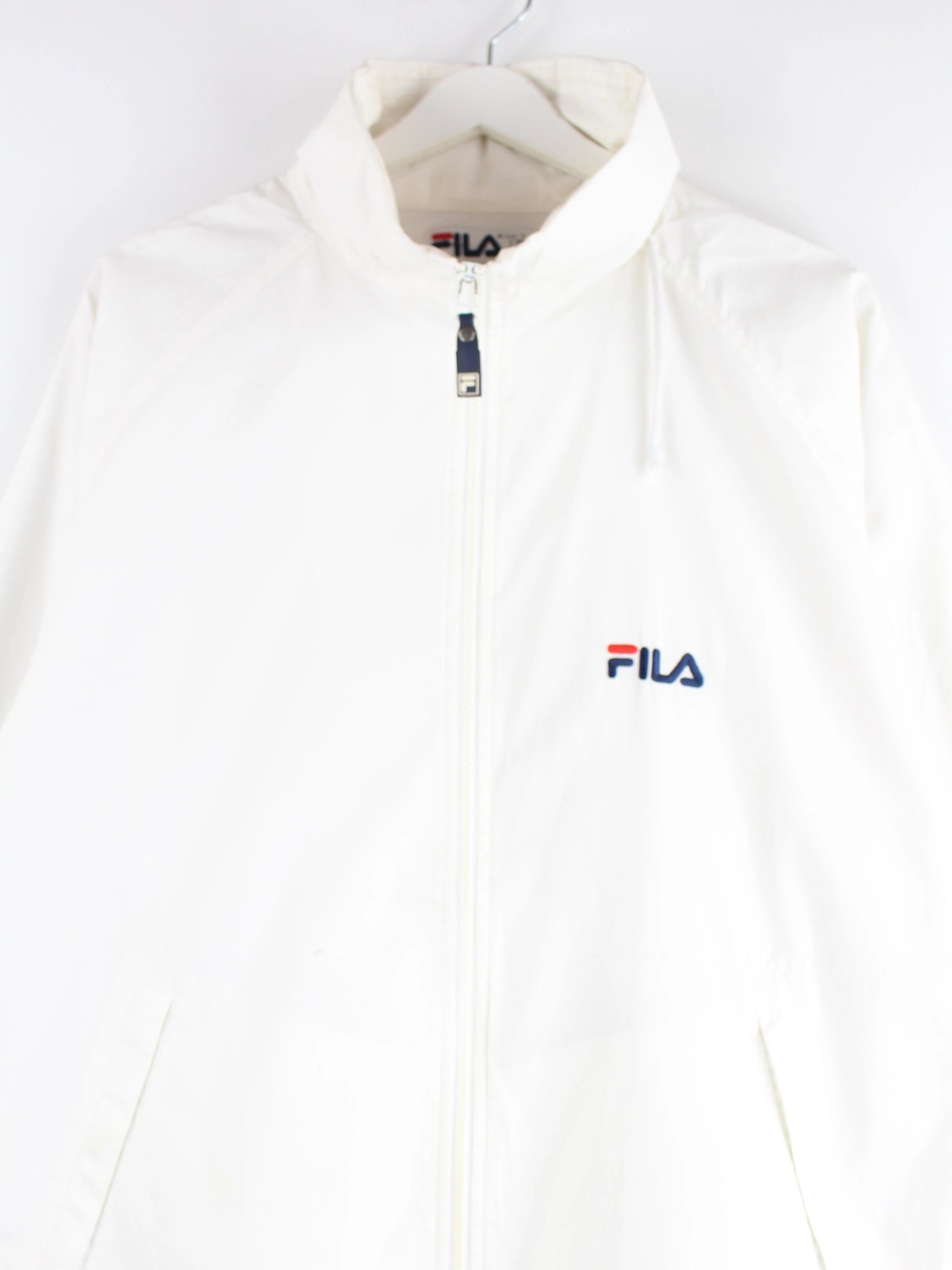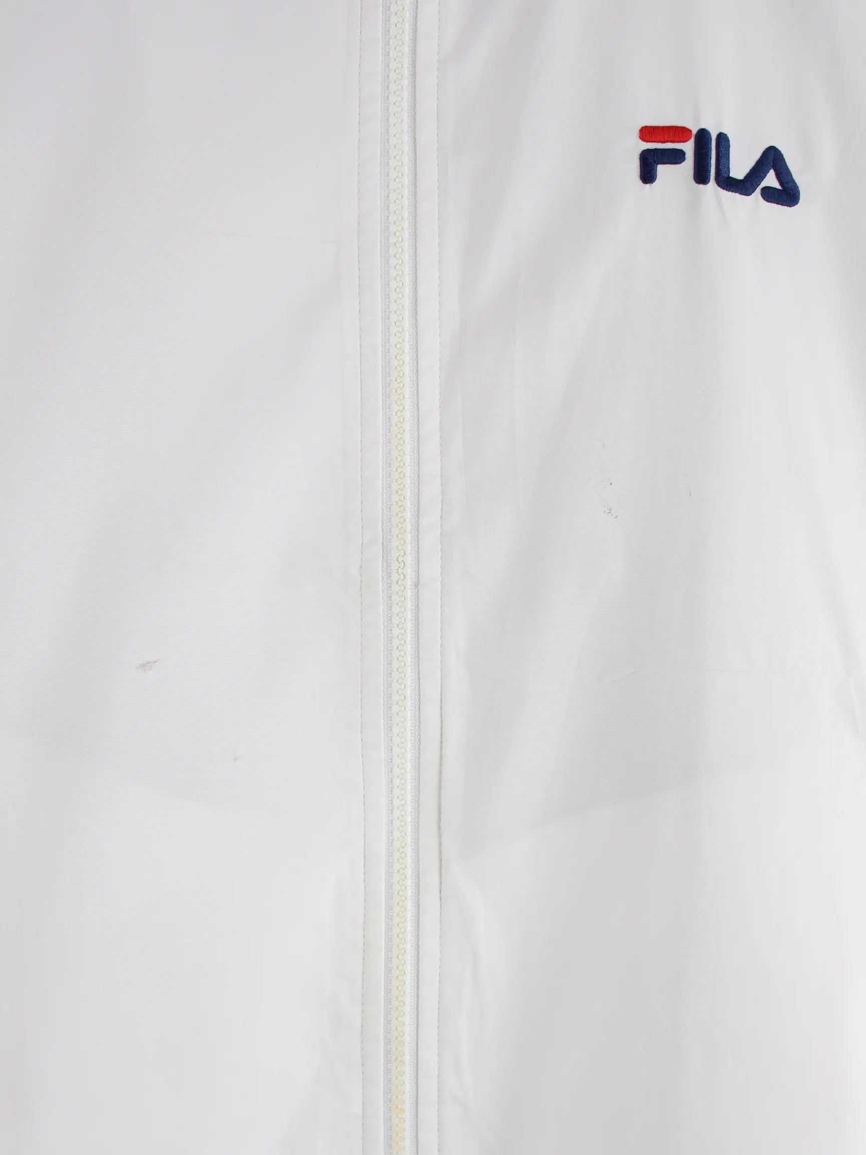 Weiße Trainingsjacke der Marke Fila aus den 90'ern in Größe XL. Sie ist aus Synthetik produziert. Den Zustand würden wir als 'In Ordnung' bezeichnen (vergl. Bilder).Mit seltenem Vintage Print.