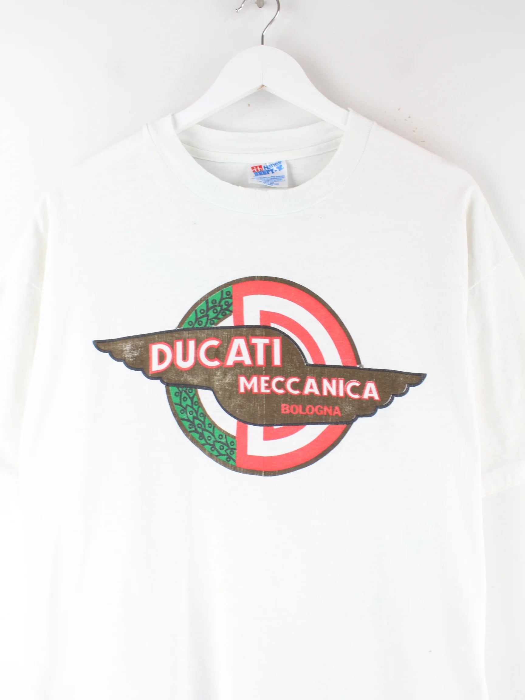 T-Shirt der Marke Hanes in Größe XL aus den 90'ern. Es ist aus Baumwolle hergestellt und in Weiß im Angebot. Mit tollem Ducati Print.