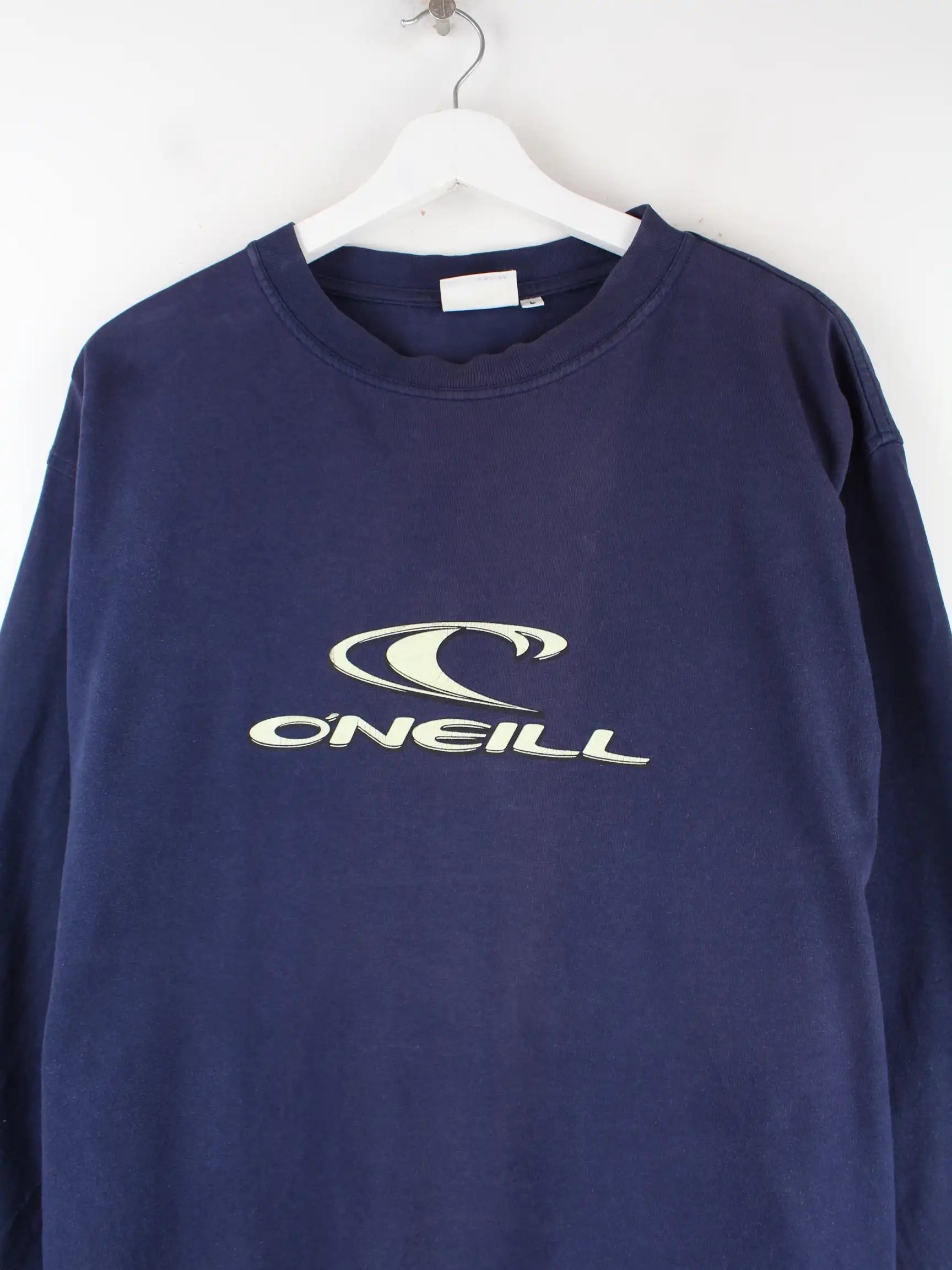 Sweatshirt vom Label O'Neill in Größe L aus den 90'ern. Es ist aus Baumwolle hergestellt und in Blau lieferbar. Mit seltenem Vintage Print.
