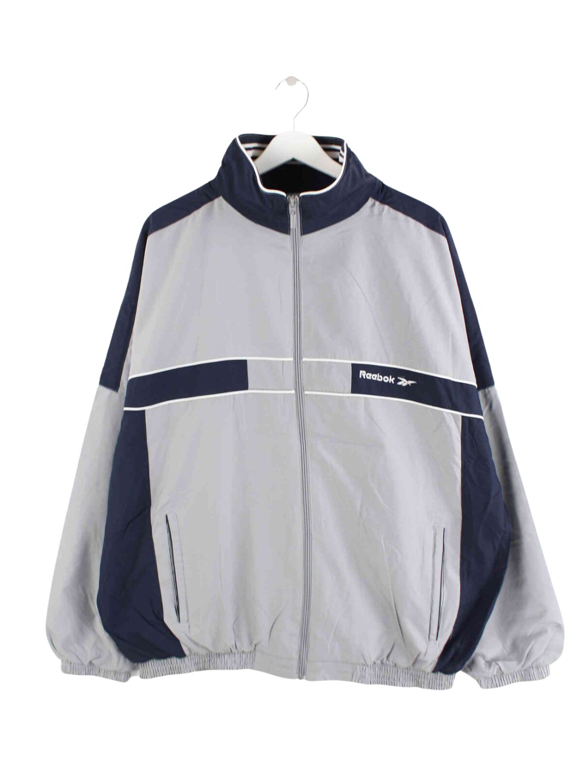 Graue Trainingsjacke mit gesticktem Logo vom Brand Reebok aus den 90'ern in Größe XL. Sie ist aus Synthetik hergestellt und in sehr gutem Zustand in Stock.