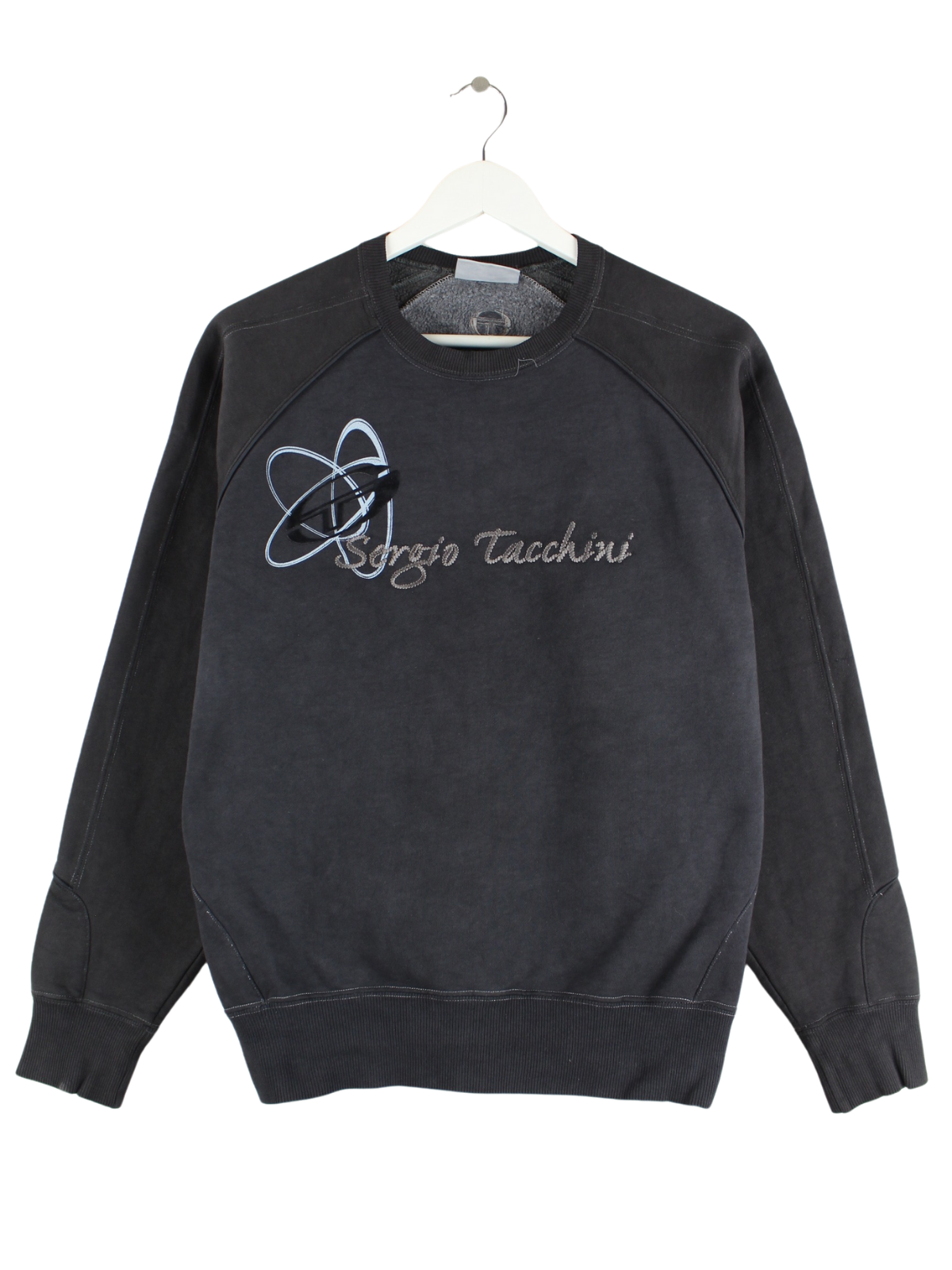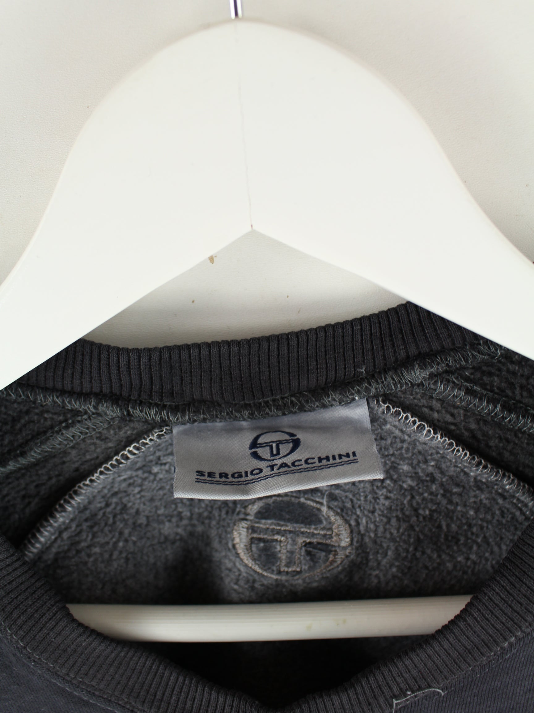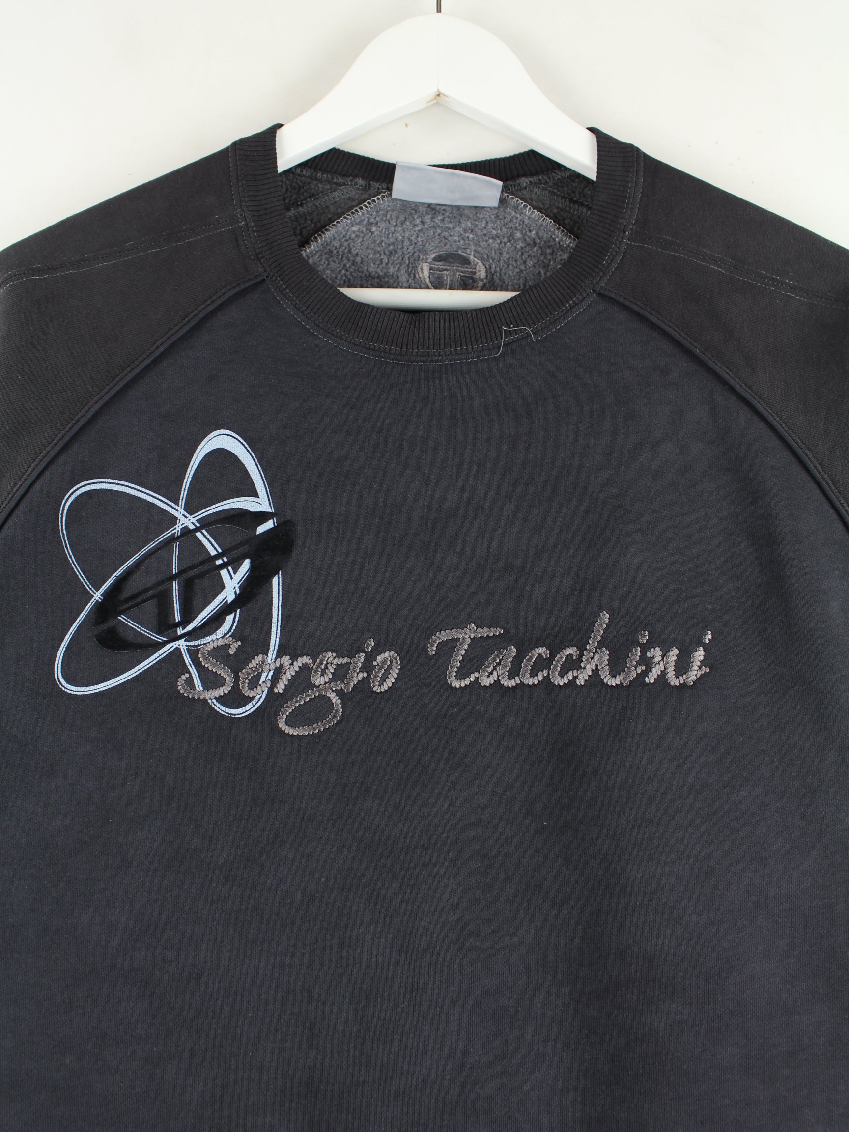 Schwarzer Sweater mit Stickereien des Labels Sergio Tacchini aus den 90'ern in Größe M. Er ist aus einer Baumwollmischung gemacht und in gutem Zustand bei uns zu bekommen.