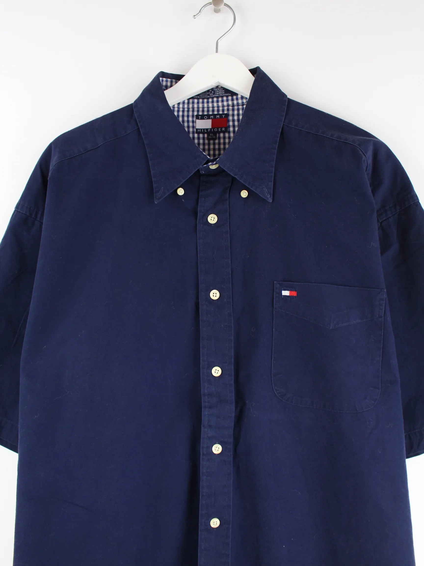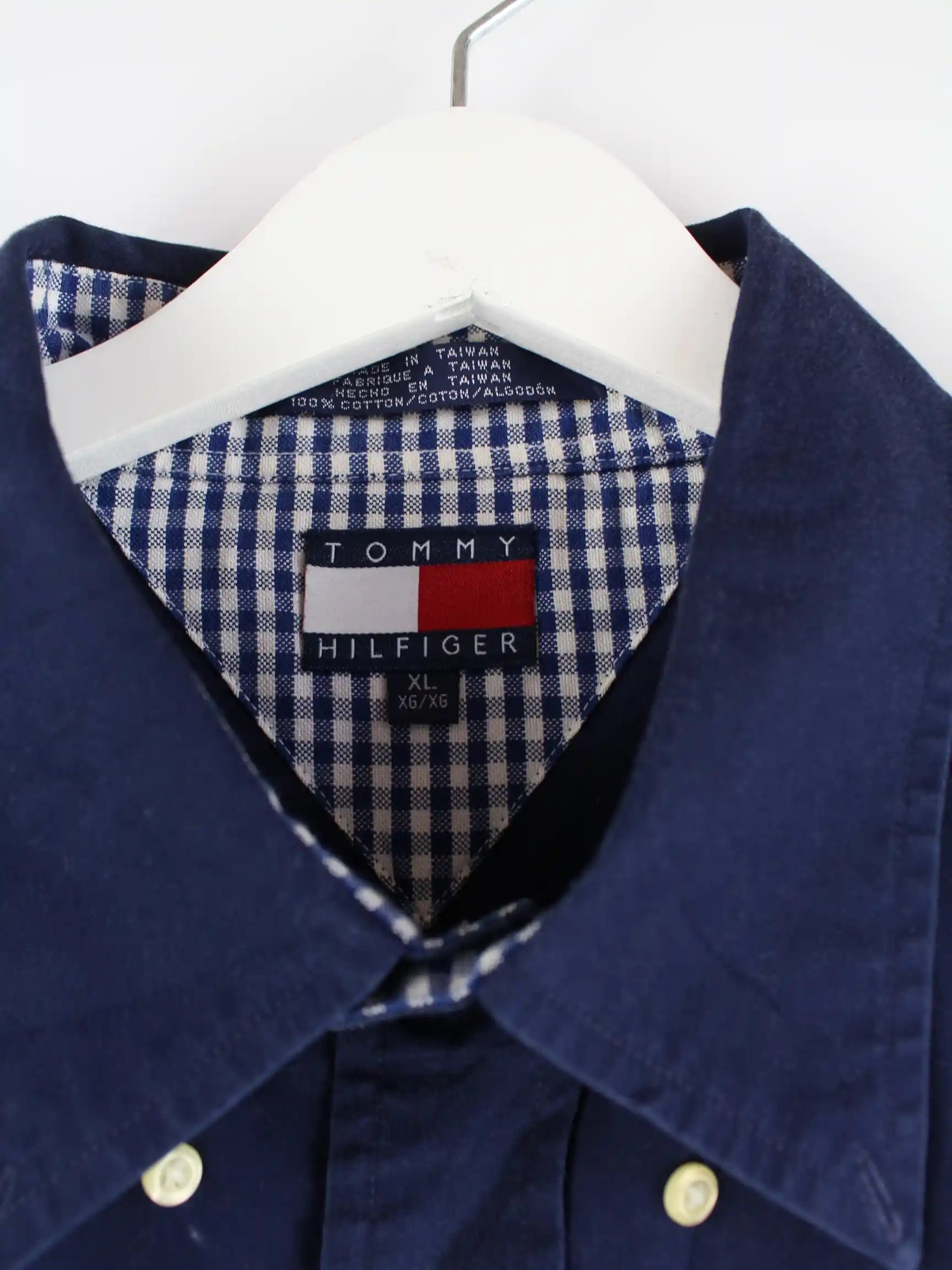Blaues Vintage Freizeithemd vom Label Tommy Hilfiger aus den 90'ern in Größe XL. Es ist aus Baumwolle und in sehr gutem Zustand vorrätig.