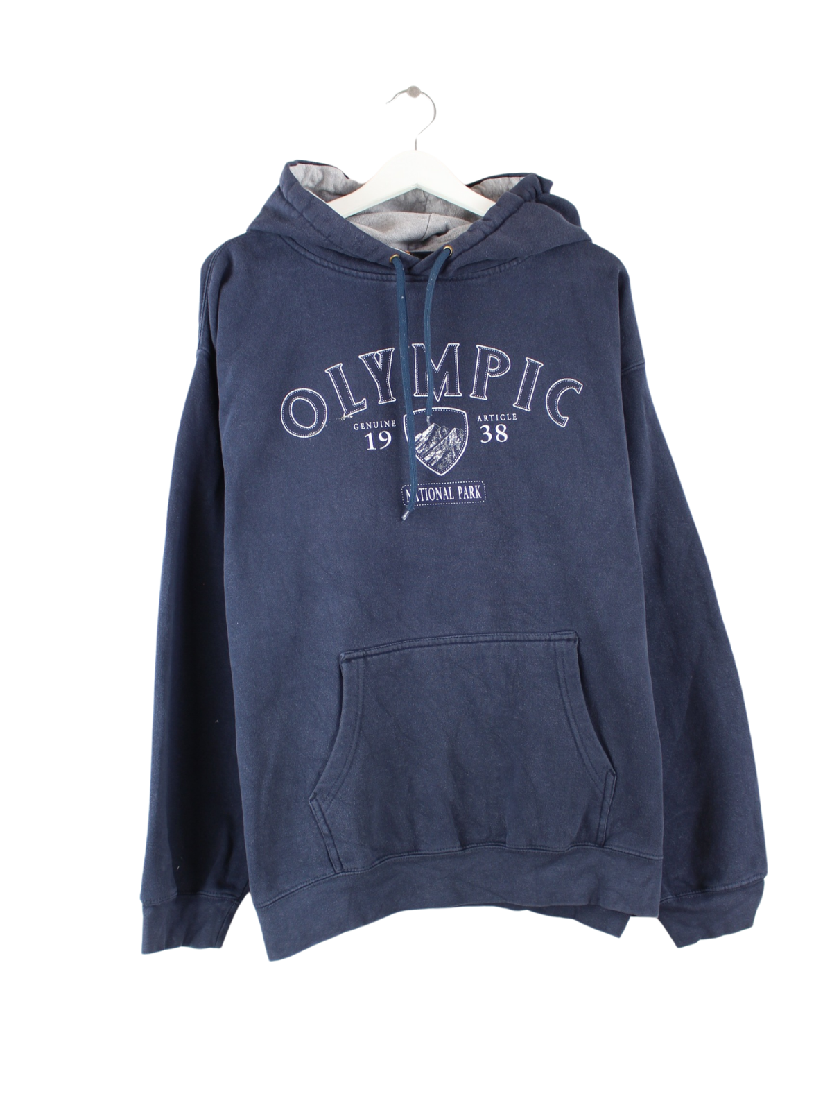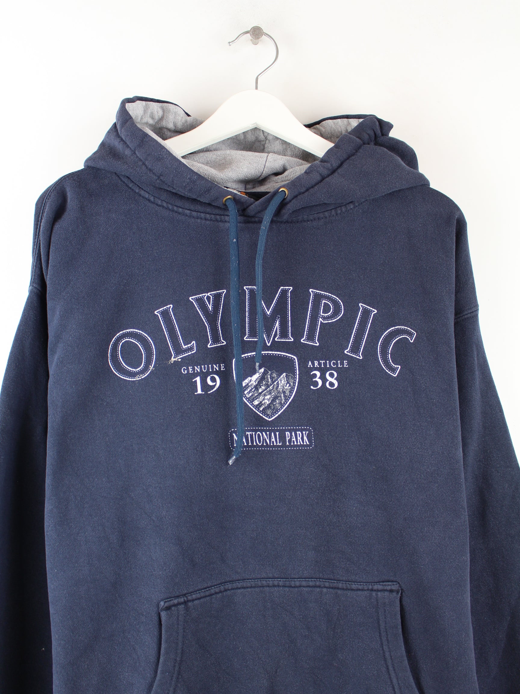 Vintage Hoodie in Größe XXL. Er ist aus Baumwolle gemacht und in Blau bei uns zu bekommen. Mit seltenem Olympic Print.
