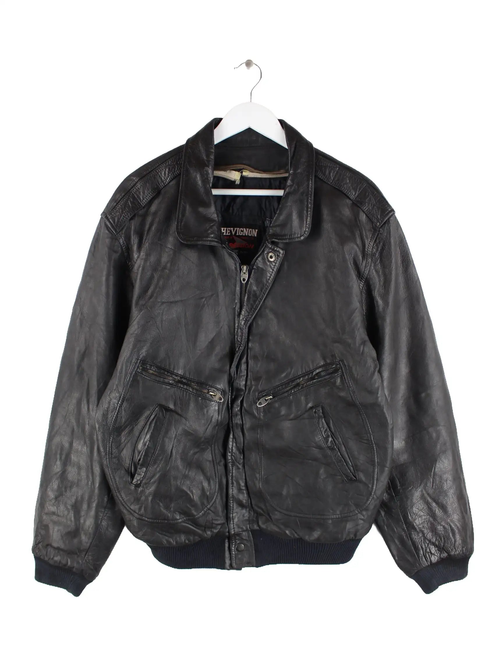 Jacke aus dem Hause Chevignon in Größe XL aus den 90'ern. Sie ist aus Leder und in Schwarz lieferbar.