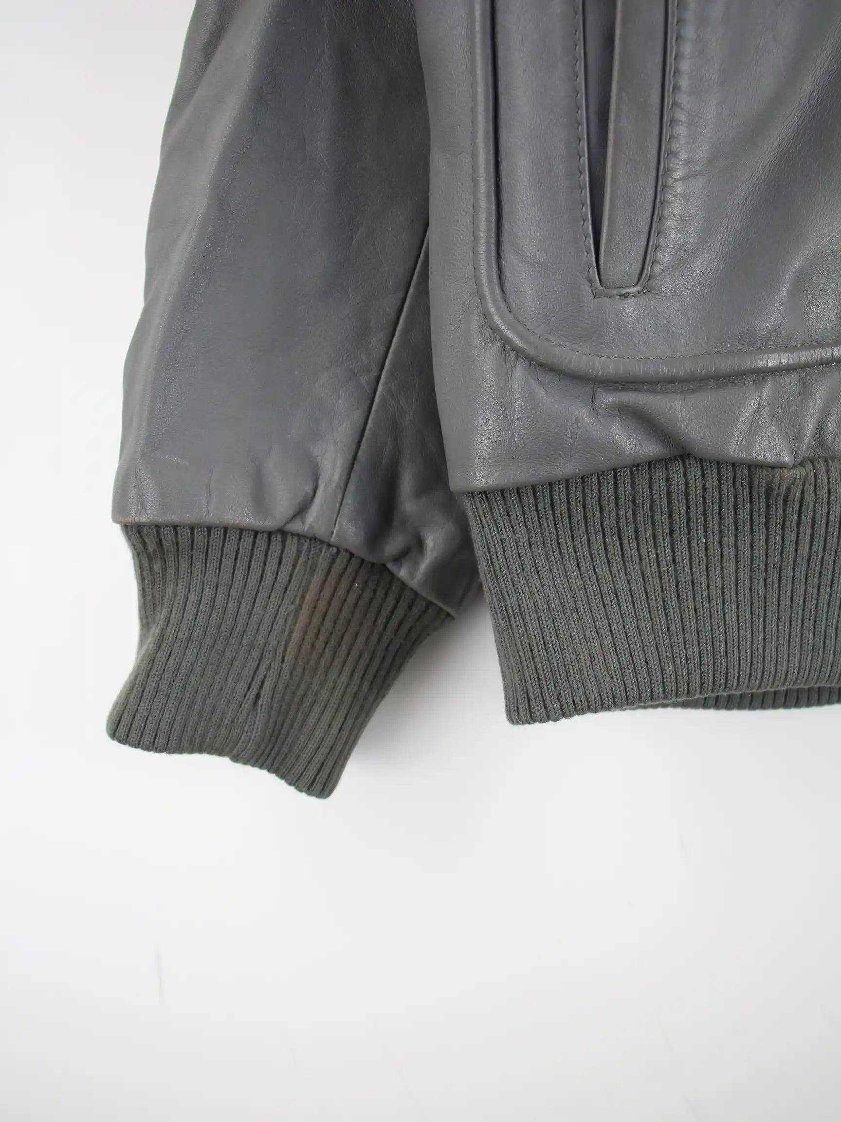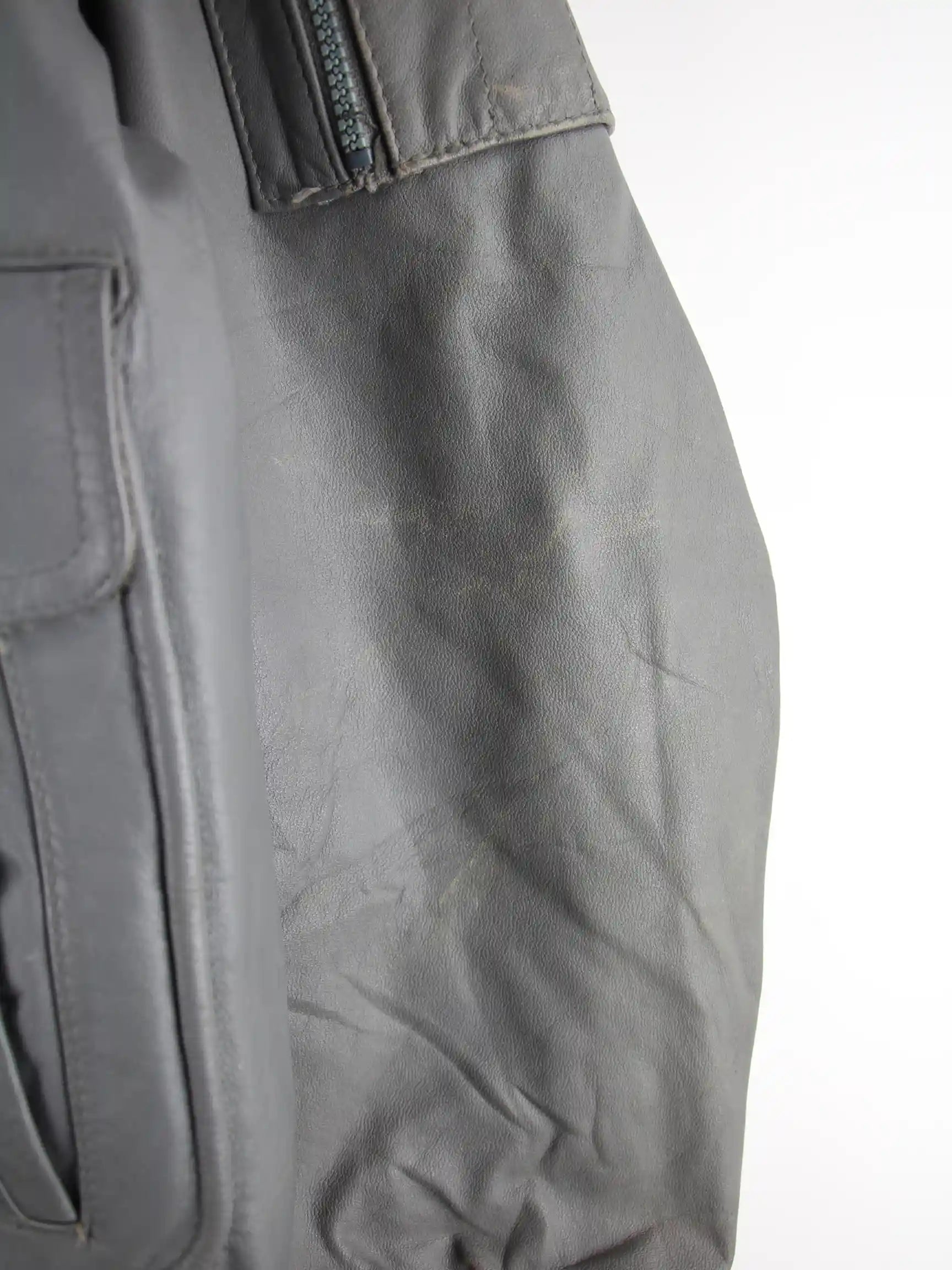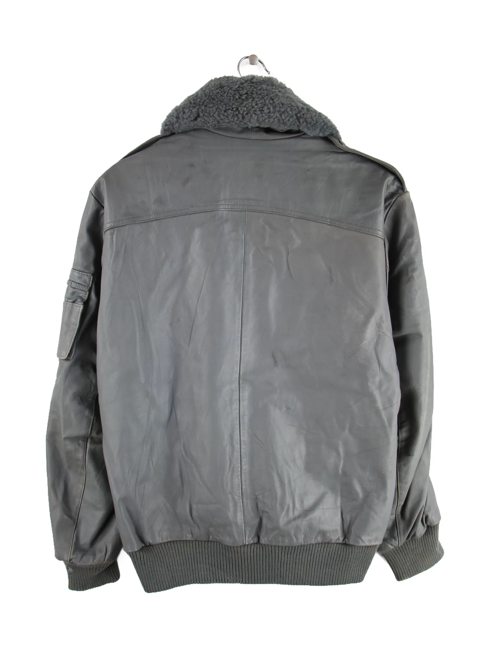 Graue Vintage Jacke in Größe S. Sie ist aus Leder gemacht. Den Zustand würden wir als 'In Ordnung' bezeichnen (vergl. Bilder).