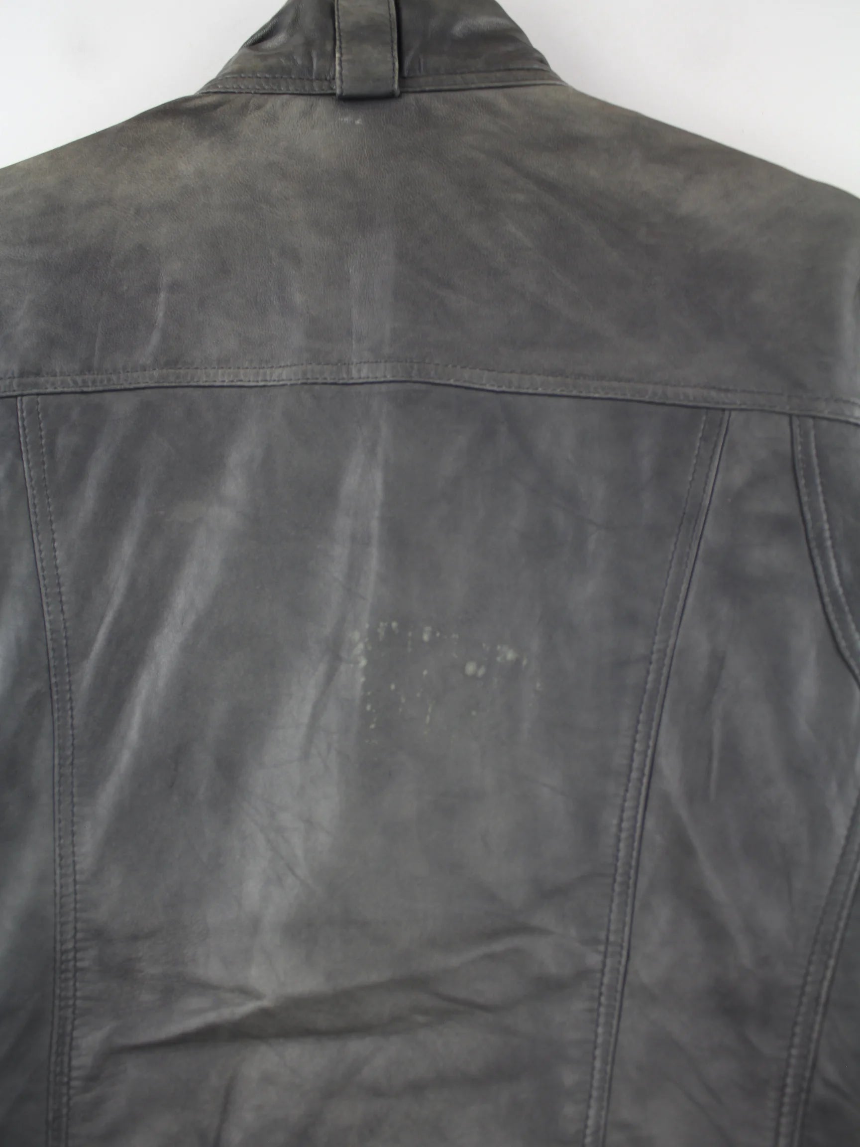 Vintage Jacke in Größe XL aus den 90'ern. Sie ist aus Leder hergestellt und in Grau vorrätig.