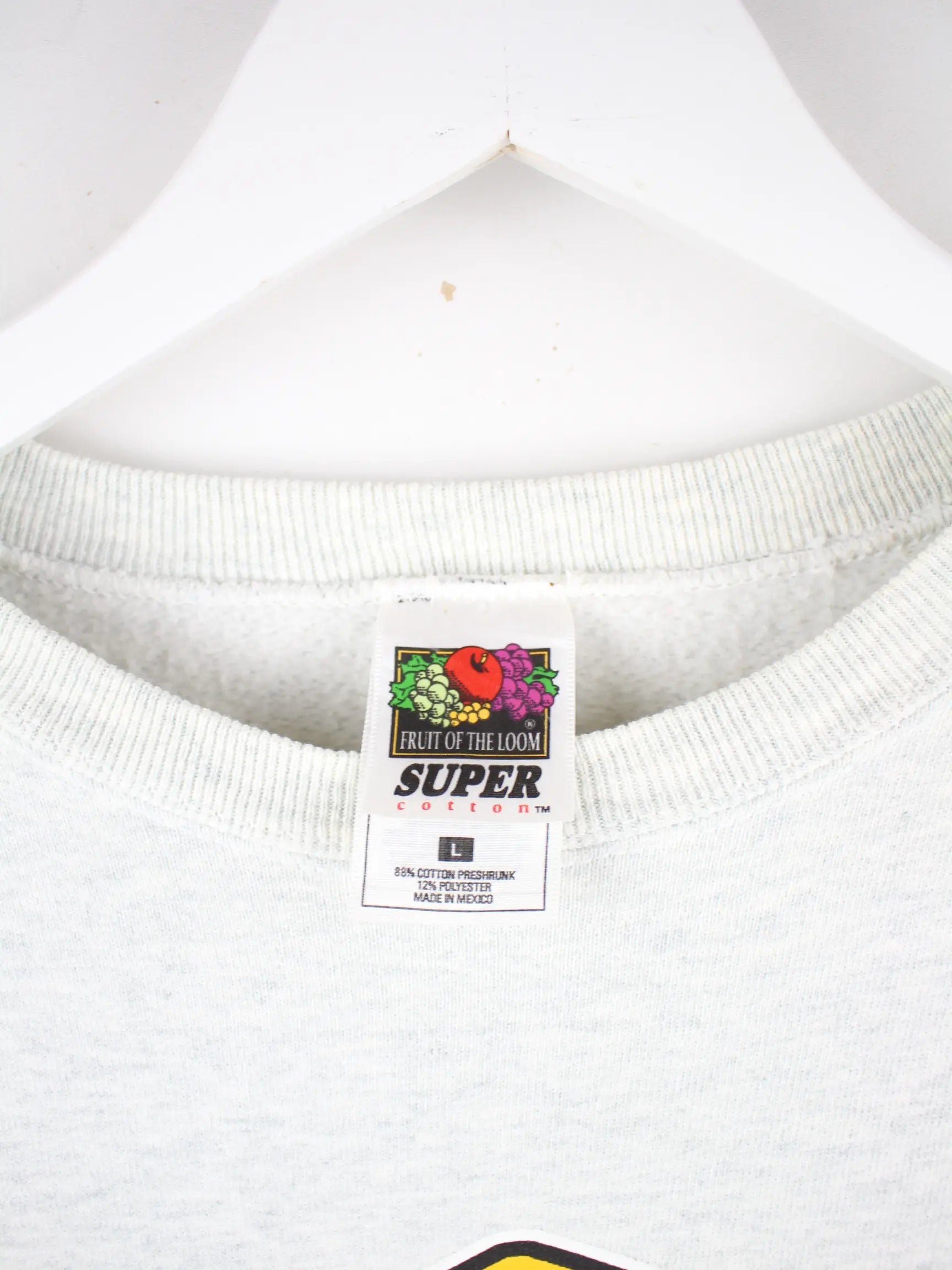 Sweater der Marke Fruit of the Loom in Größe L aus den 90'ern. Er ist aus einer Baumwollmischung gemacht und in Grau im Angebot. Mit tollem Brewings Print.