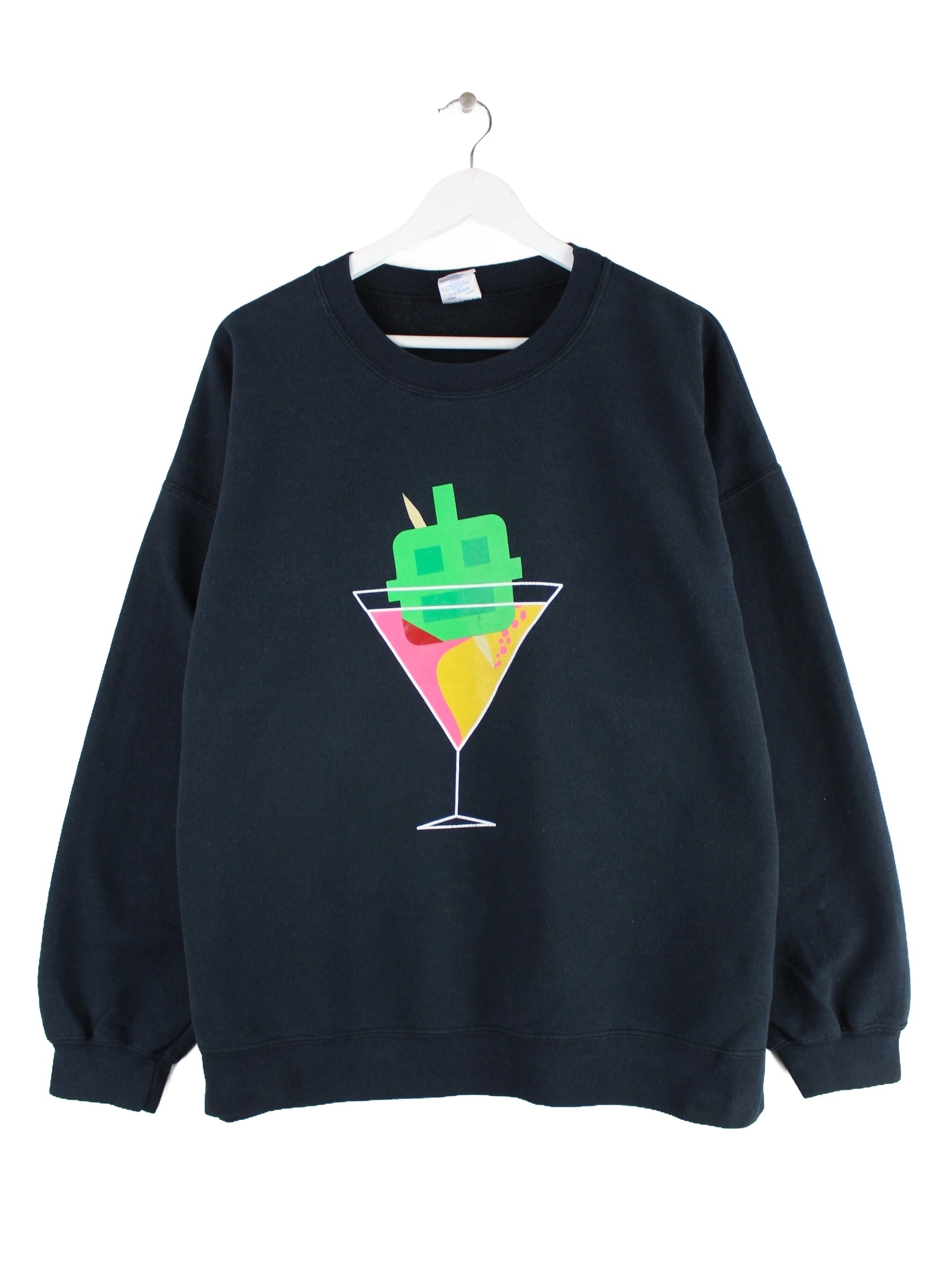 Schwarzer Sweater vom Label Gildan in Größe XL. Er ist aus einer Baumwollmischung hergestellt und in sehr gutem Zustand bei uns vorrätig. Mit schickem Cocktail Print.