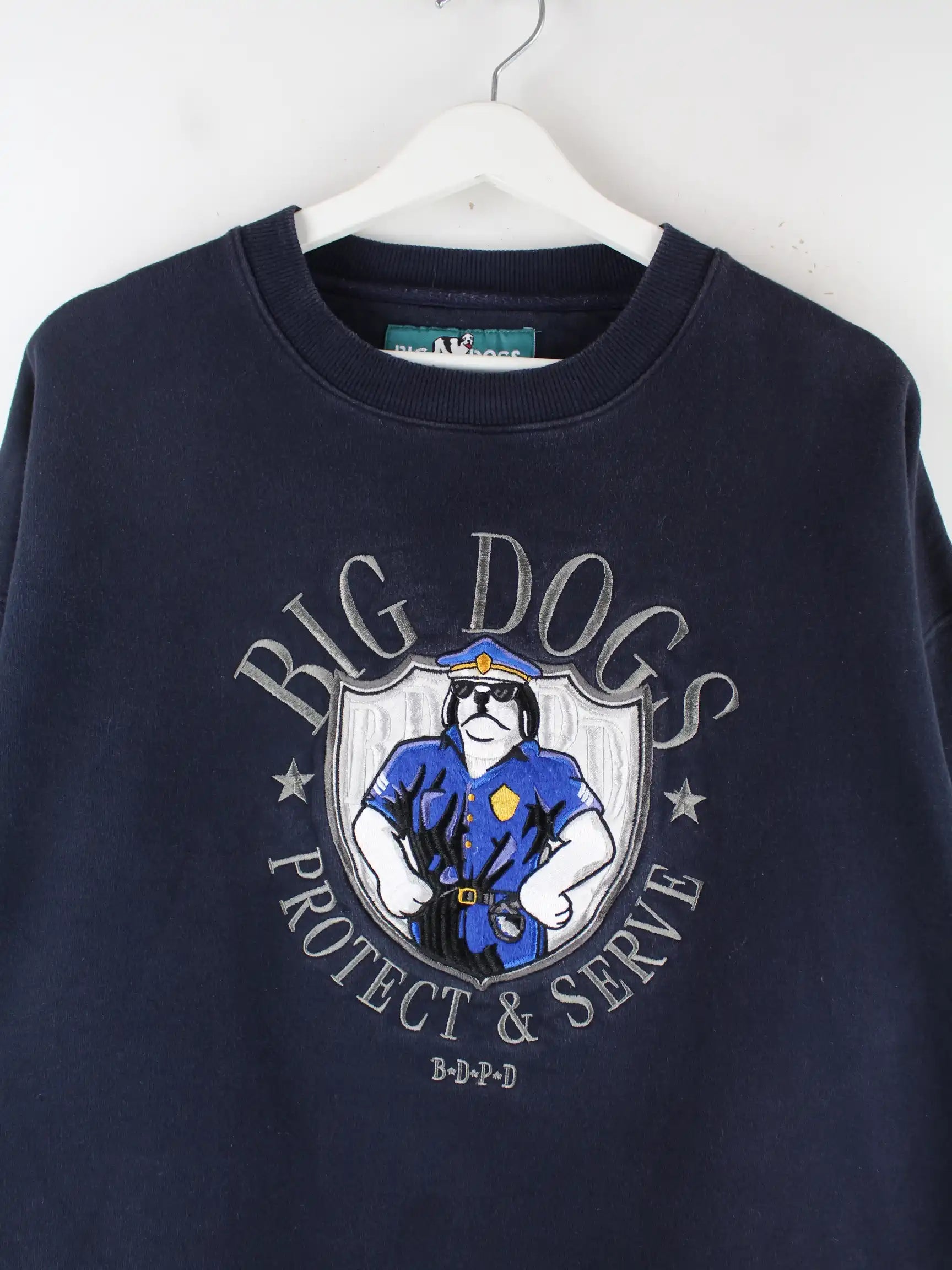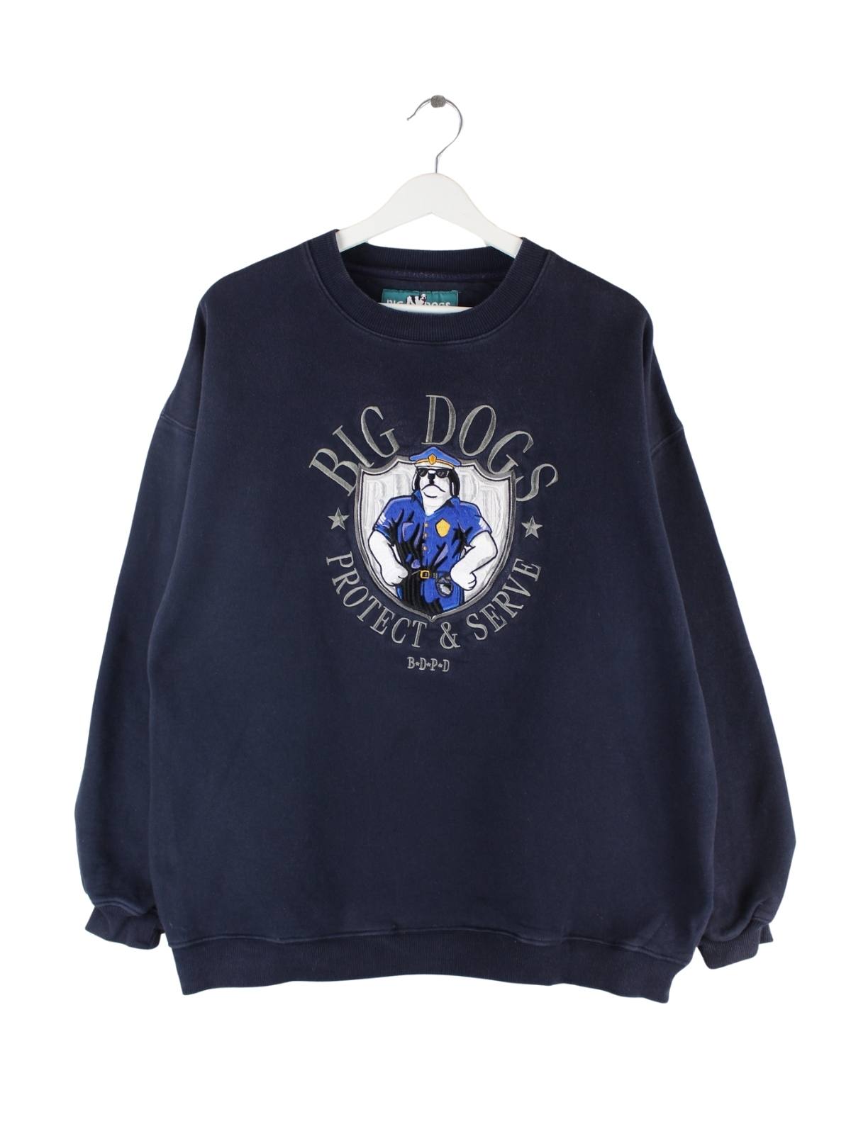 Schwarzer Sweater mit gestickten Motiven der Brand Big Dogs in Größe XL. Er ist aus einer Baumwollmischung angefertigt und in sehr gutem Zustand bei uns vorrätig.