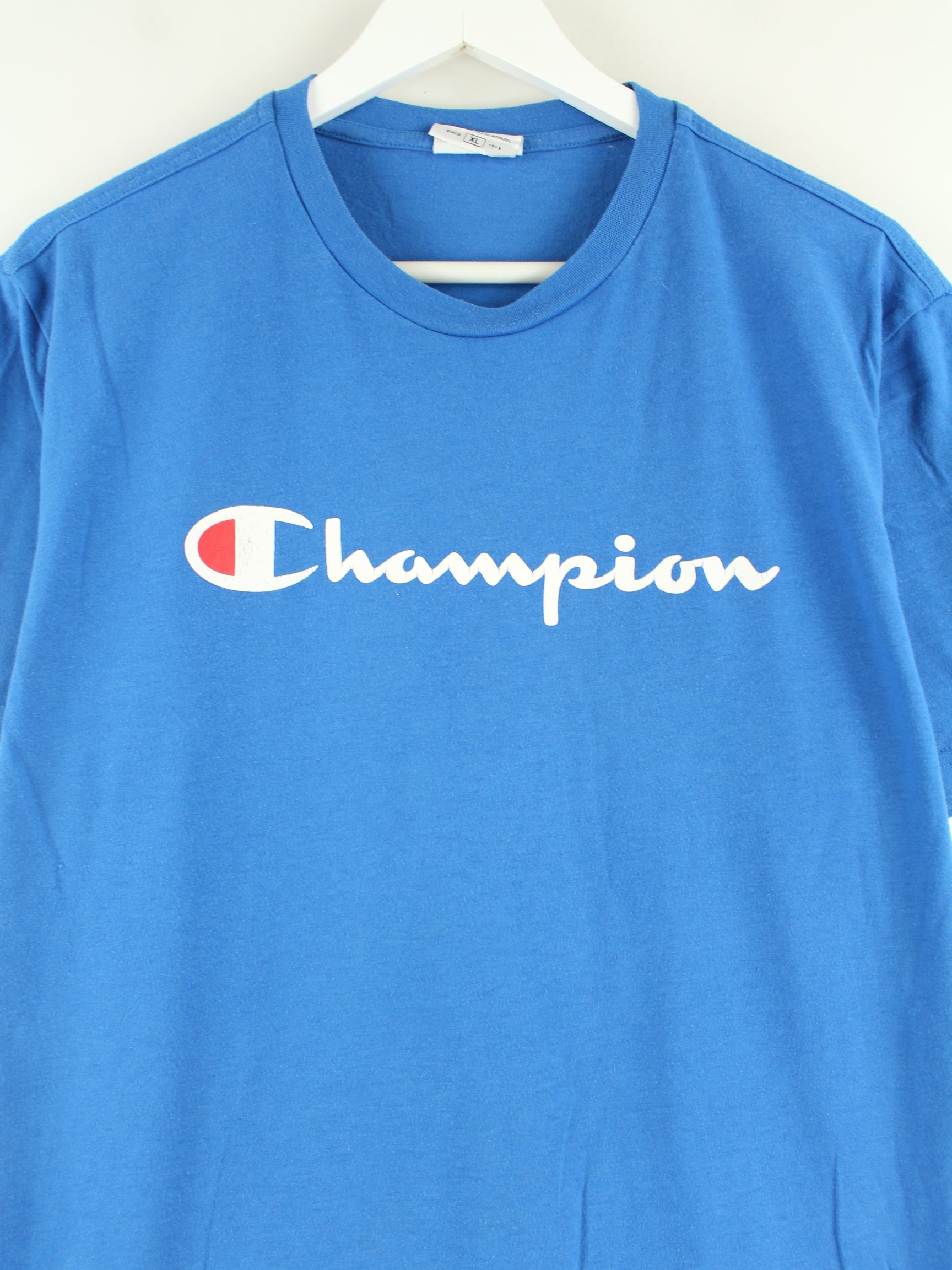 Blaues T-Shirt vom Brand Champion in Größe XL. Es ist aus Baumwolle hergestellt und in gutem Zustand bei uns vorrätig. Mit schönem Logo Print.