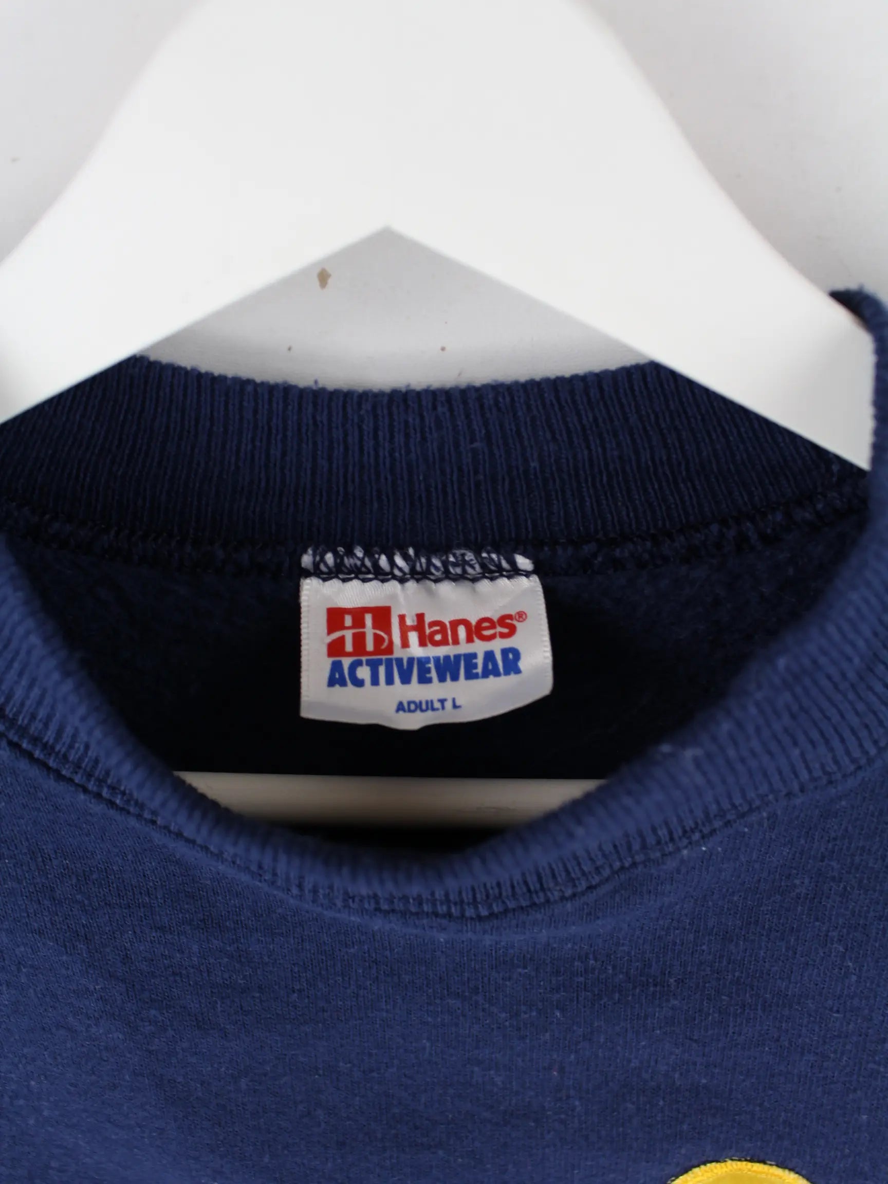 Blauer Sweater mit Stickereien vom Label Hanes in Größe L. Er ist aus einer Baumwollmischung hergestellt und in sehr gutem Zustand auf Lager.