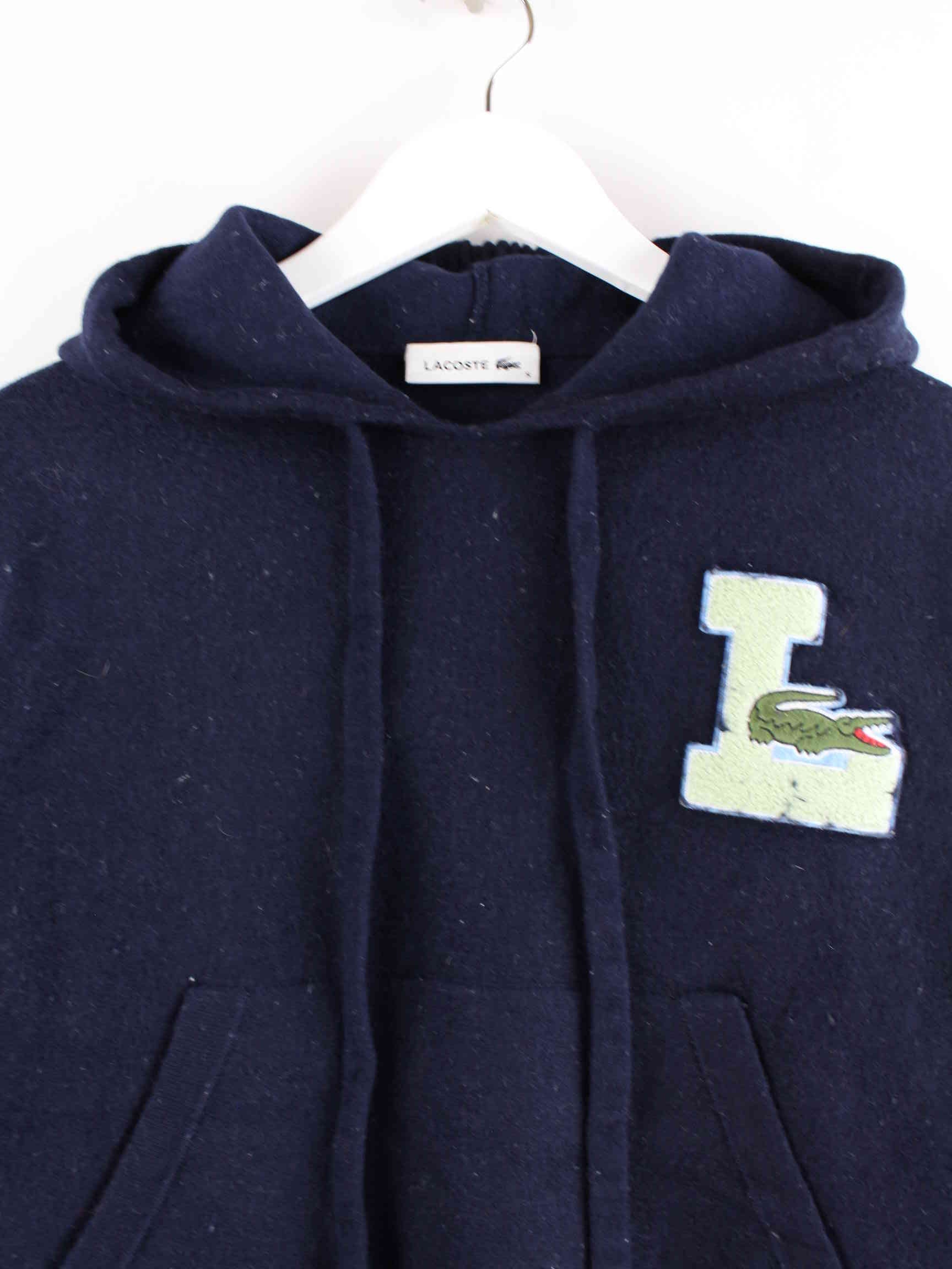 Blauer Hoodie mit gesticktem Logo vom Label Lacoste in Größe XS. Er ist aus einer Baumwollmischung produziert und in sehr gutem Zustand bei uns zu bekommen.