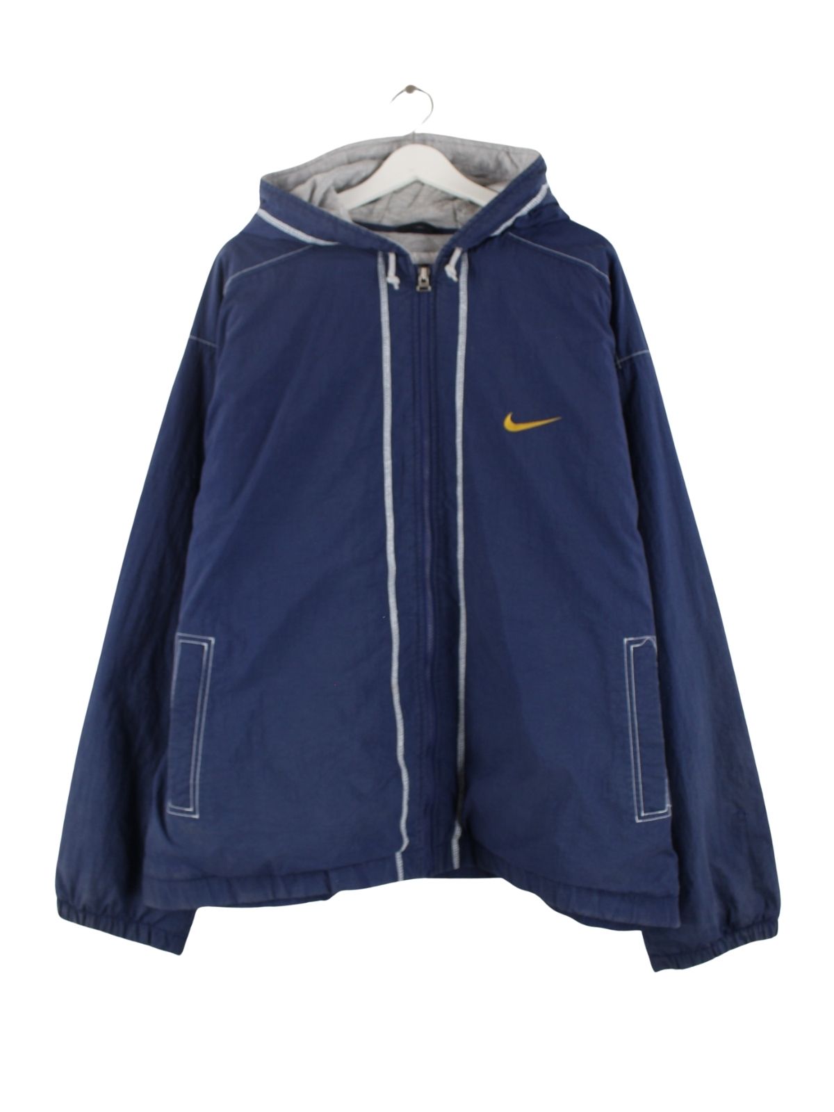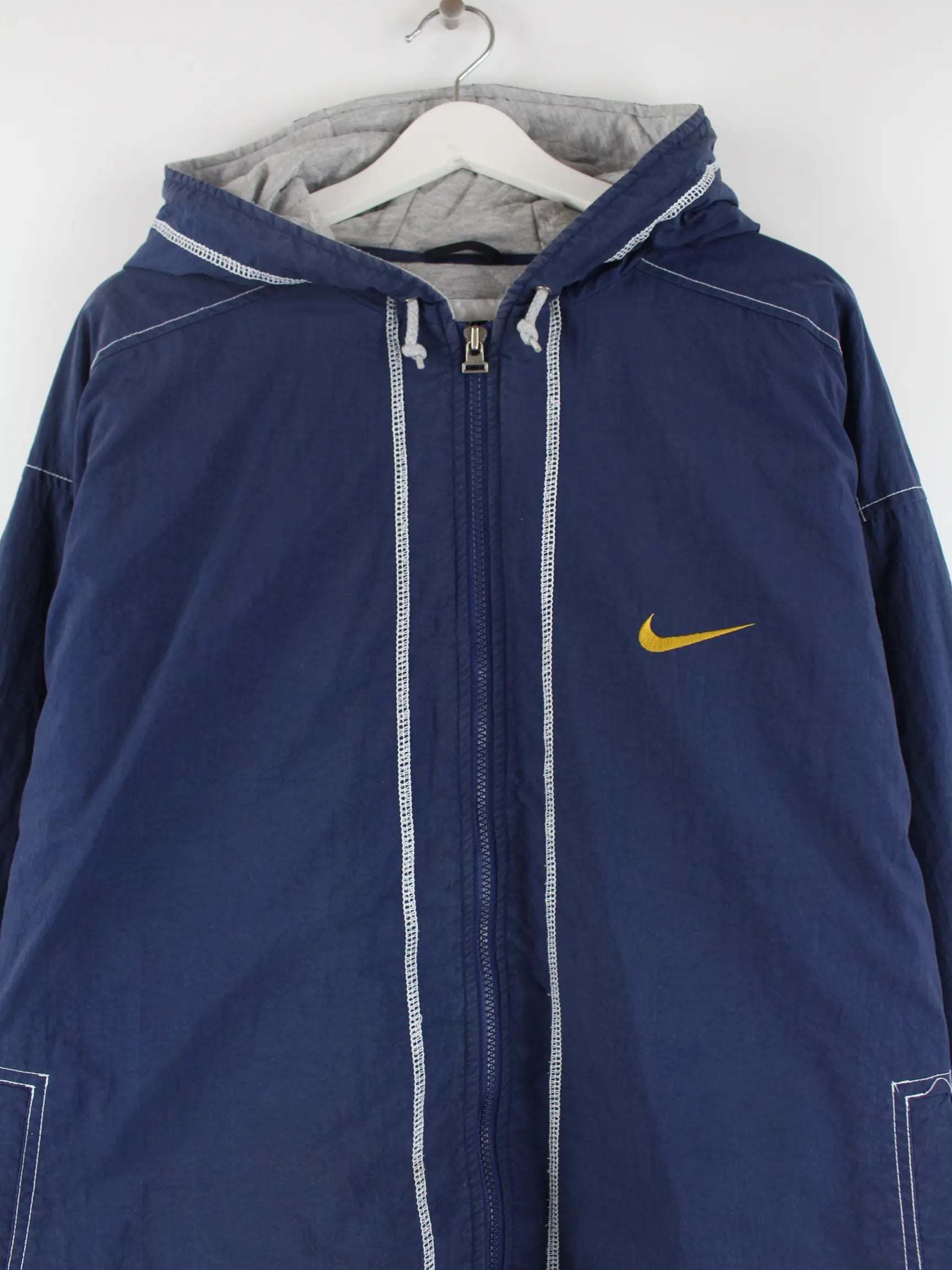 Blaue Jacke von Nike aus den 90'ern in Größe XXL. Sie ist aus Synthetik gemacht. Den Zustand würden wir als 'In Ordnung' bezeichnen (vergl. Bilder).