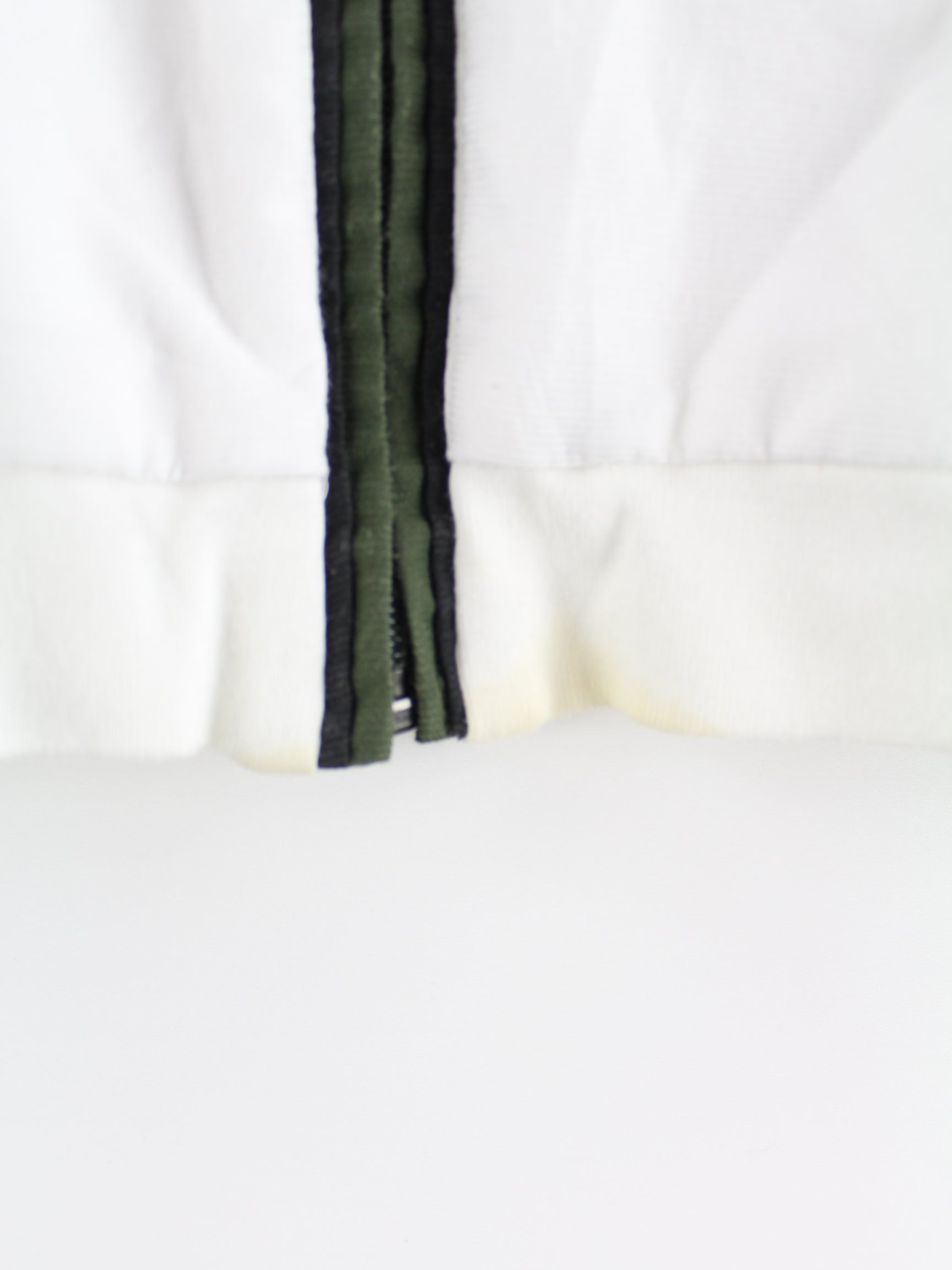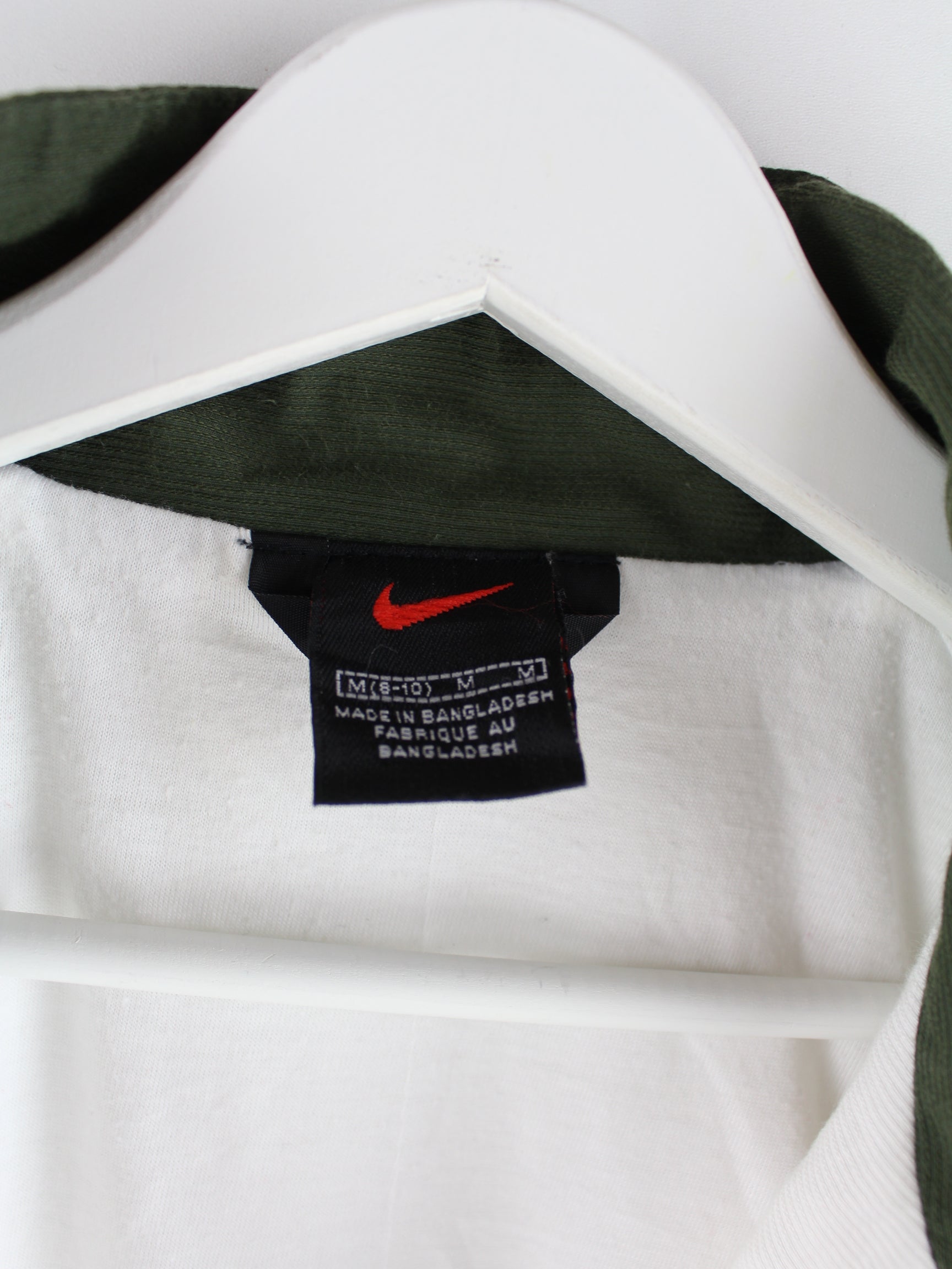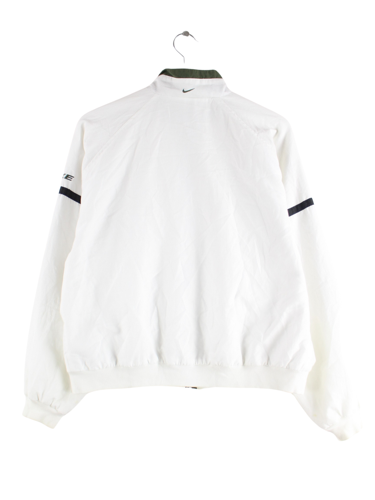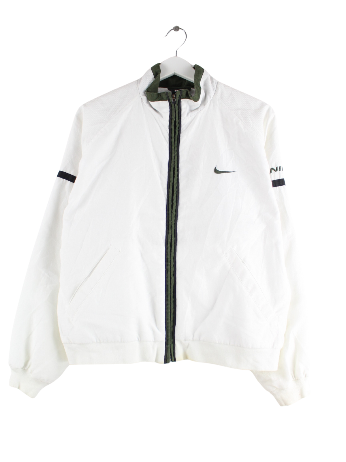 Weiße Trainingsjacke mit Stick der Marke Nike aus den 90'ern in Größe S. Sie ist aus Synthetik gefertigt und in gutem Zustand auf Lager.