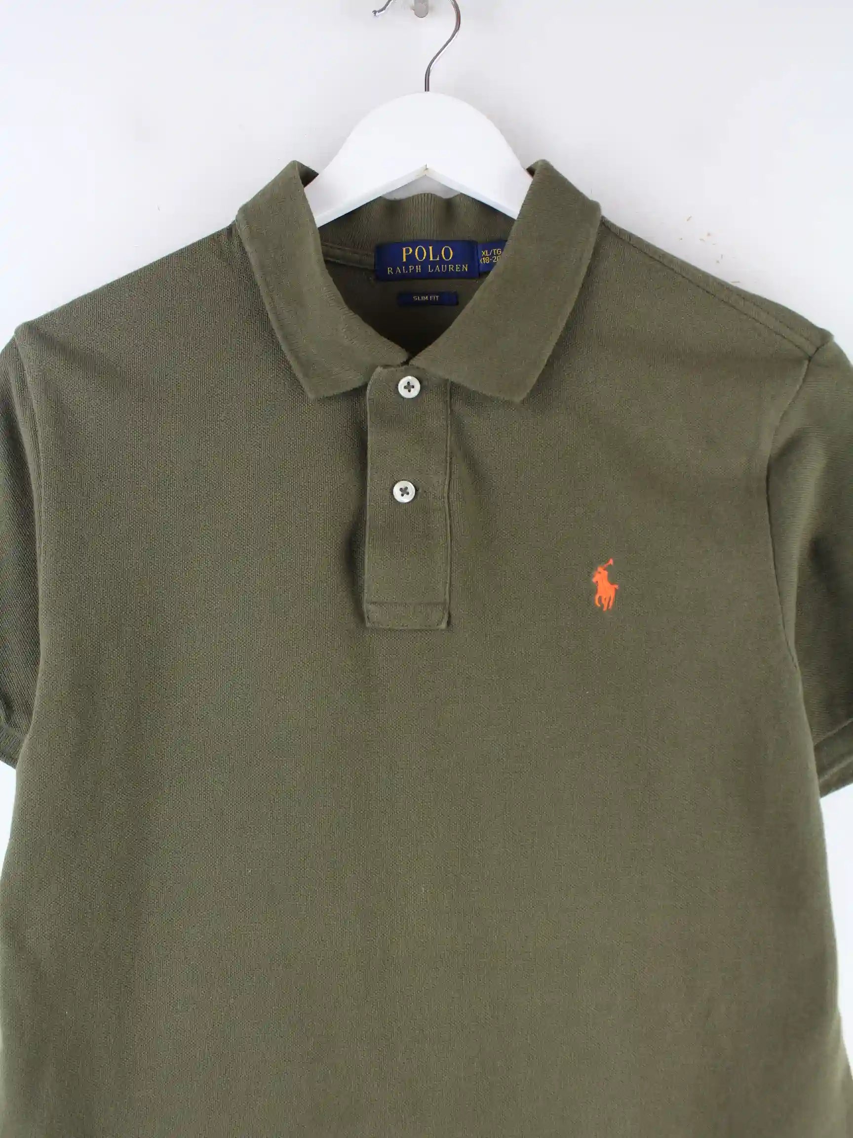 Grünes Poloshirt der Marke Ralph Lauren mit orangenem Logo. Es ist in Größe XL (18-20) und entspricht etwas einer Größe M.
