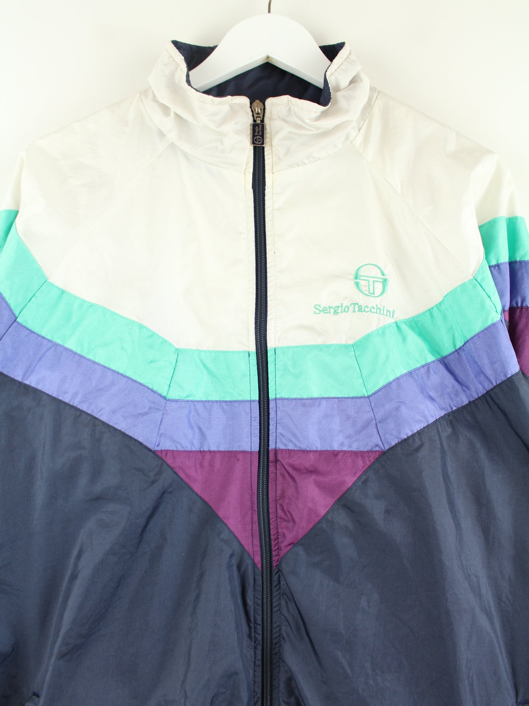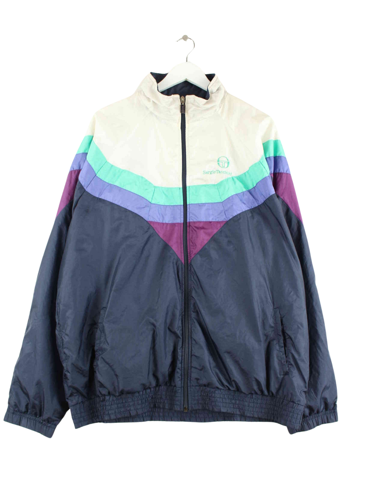 Blaue Trainingsjacke von Sergio Tacchini aus den 90'ern in Größe XL. Sie ist aus Synthetik gemacht und in sehr gutem Zustand bei uns zu bekommen.