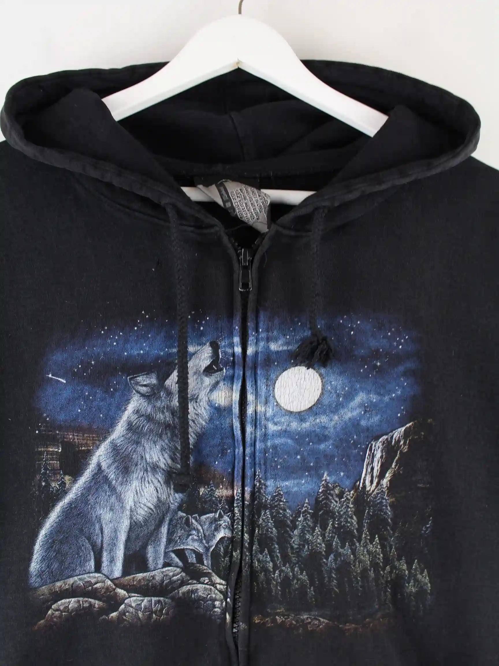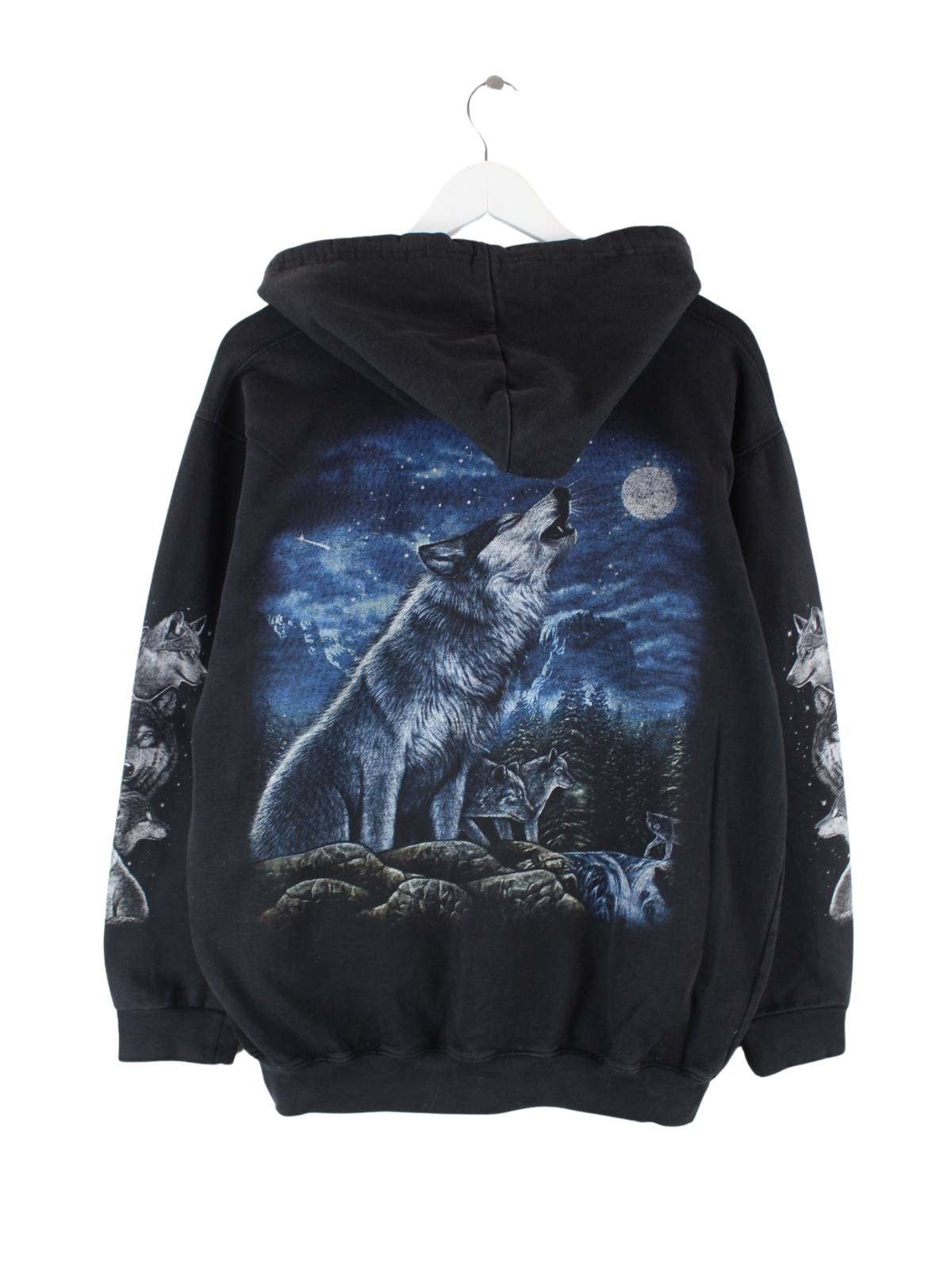 Schwarzer Vintage Hoodie mit Zip in Größe XL. Er ist aus einer Baumwollmischung und in gutem Zustand auf Lager. Mit seltenem Wolf Print.