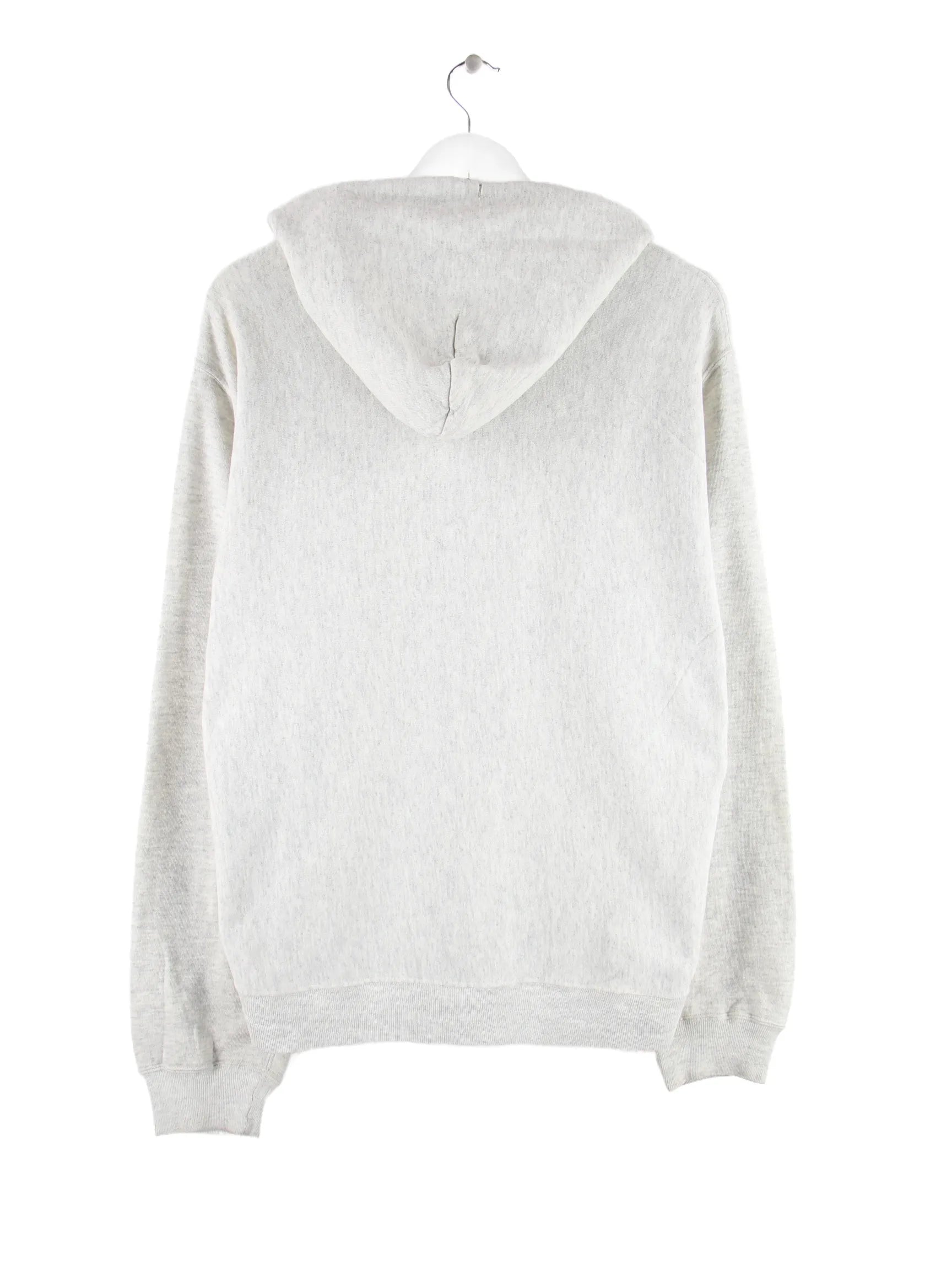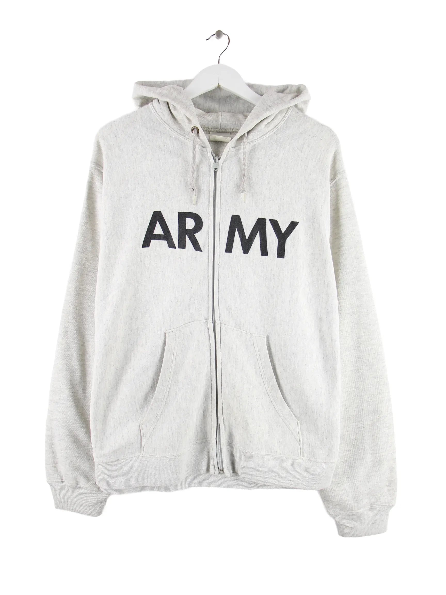Vintage Hoodie mit durchgehendem Reißverschluß in Größe L. Er ist aus einer Baumwollmischung gemacht und in Grau im Bestand. Mit chiquem Army Print.