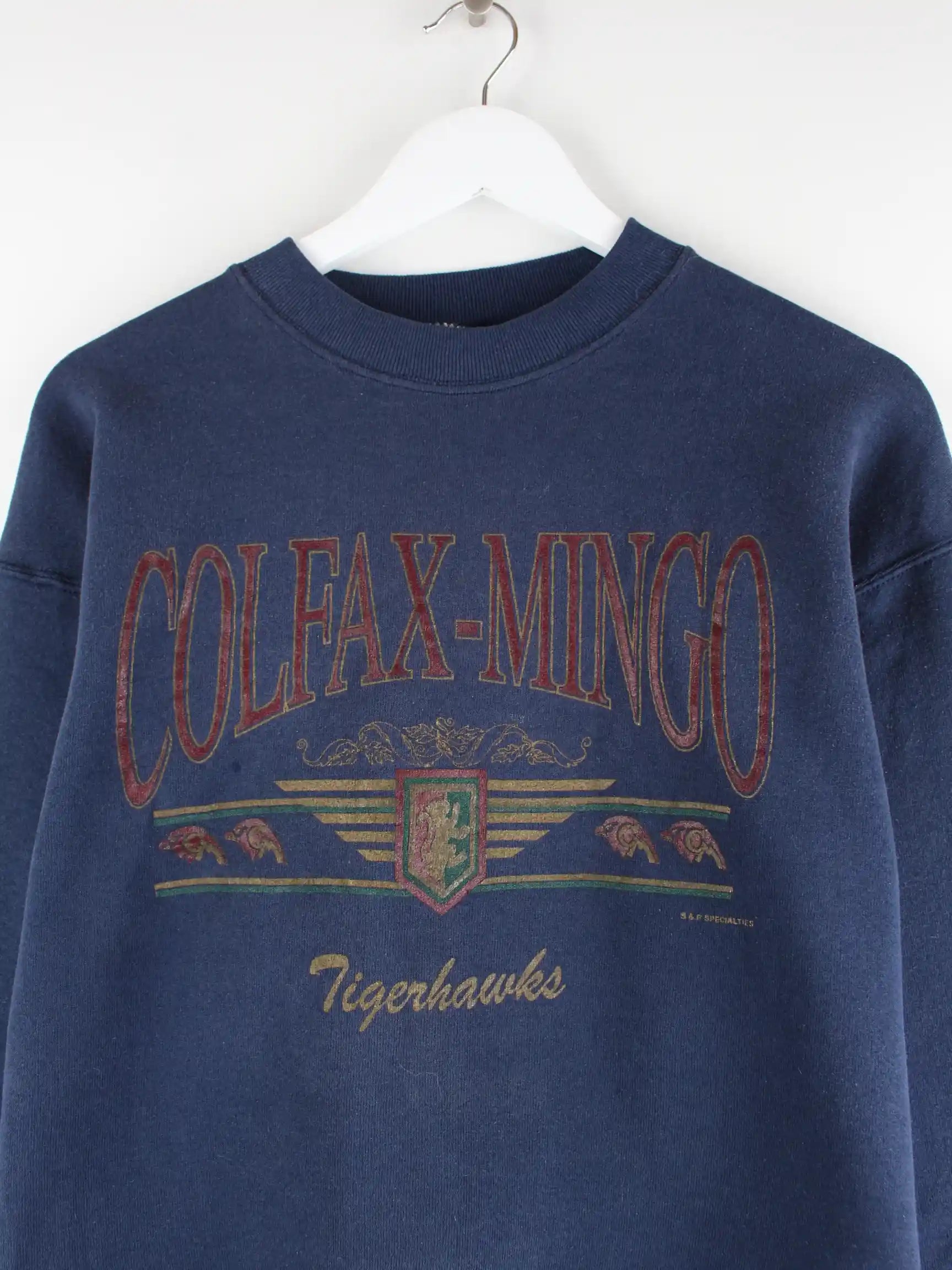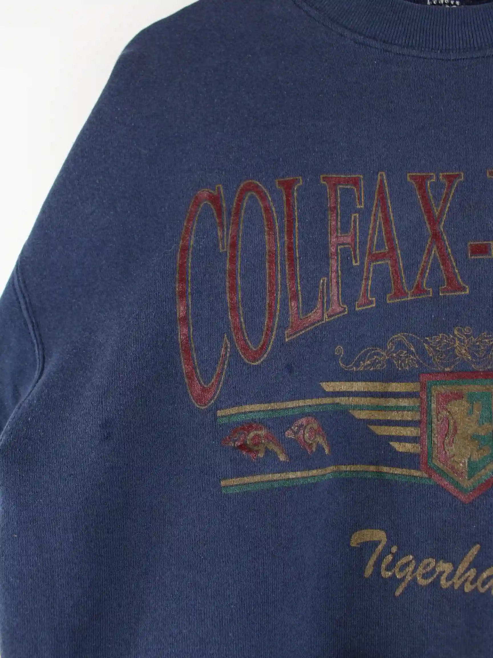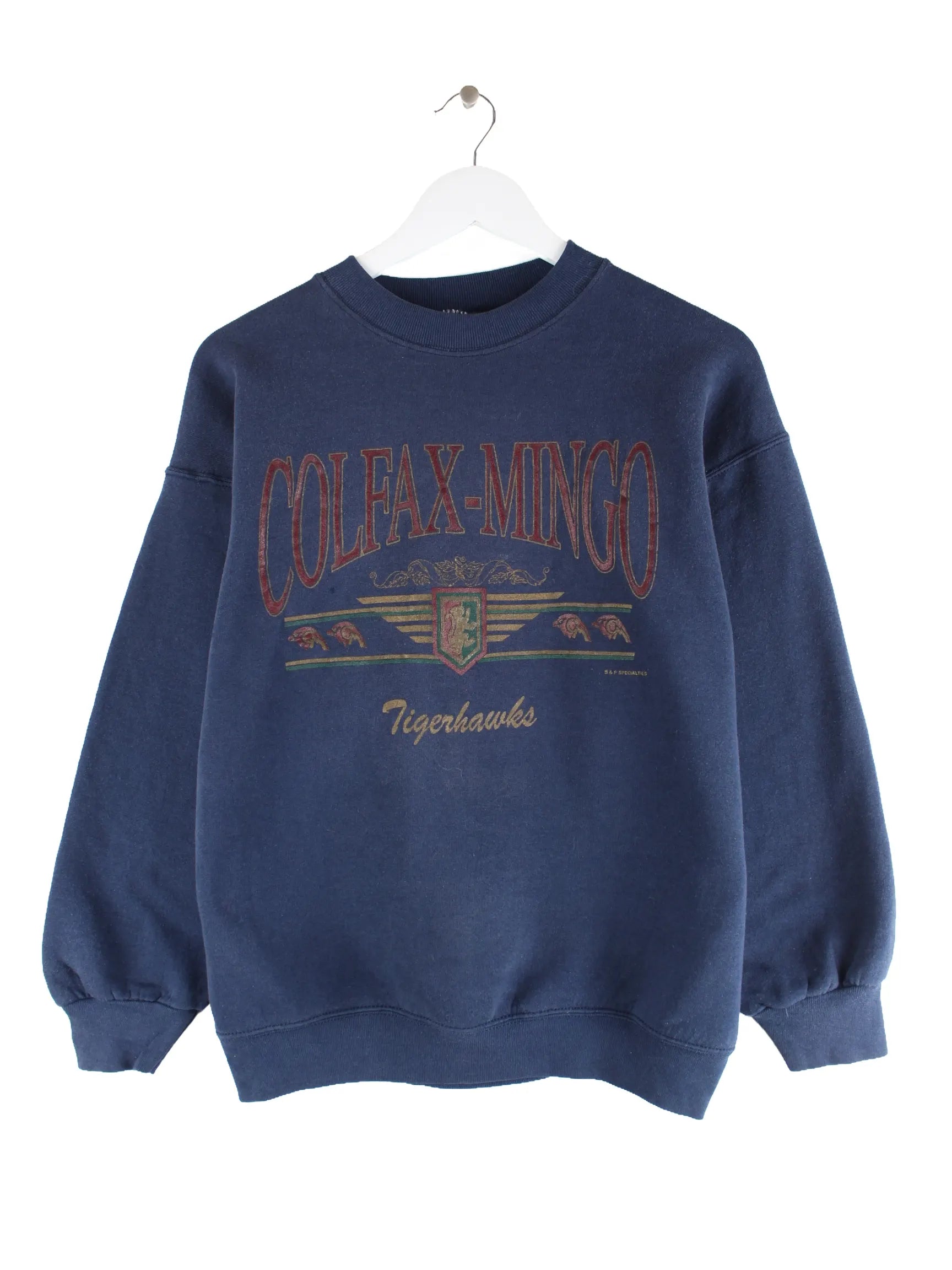 Sweater des Labels Fruit of the Loom in Größe L aus den 90'ern. Er ist aus einer Baumwollmischung gefertigt und in Blau in Stock. Mit tollem Tigerhawks Print.