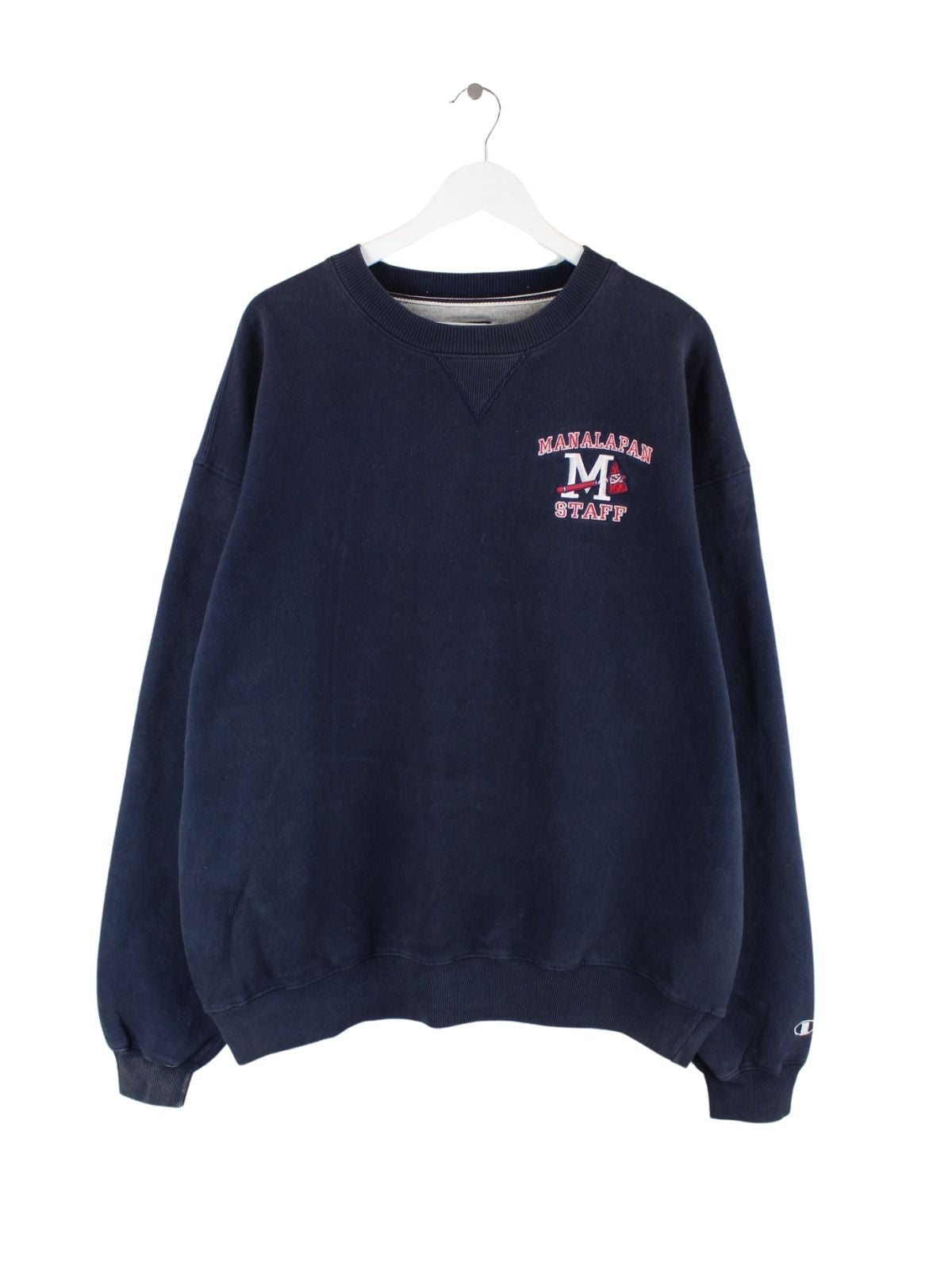 Blauer Sweater mit Stick vom Label Champion in Größe XL. Er ist aus einer Baumwollmischung . Den Zustand würden wir als 'In Ordnung' bezeichnen (vergl. Bilder).