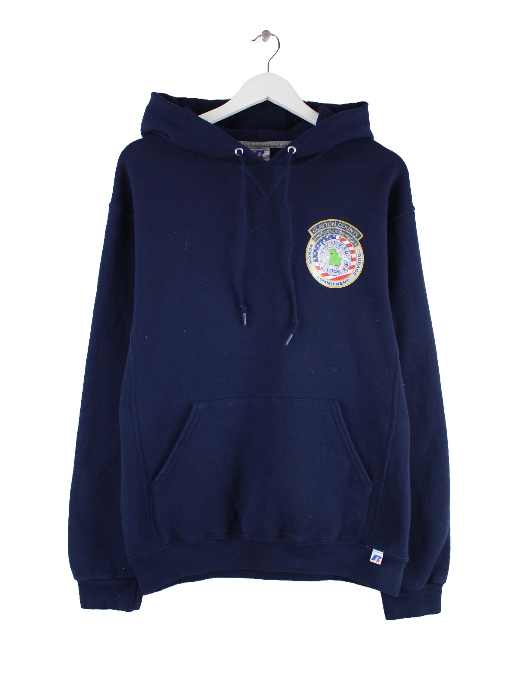Blauer Hoodie aus dem Hause Russell Athletic in Größe M. Er ist aus einer Baumwollmischung gemacht und in gutem Zustand lieferbar. Mit chiquem Service Print.
