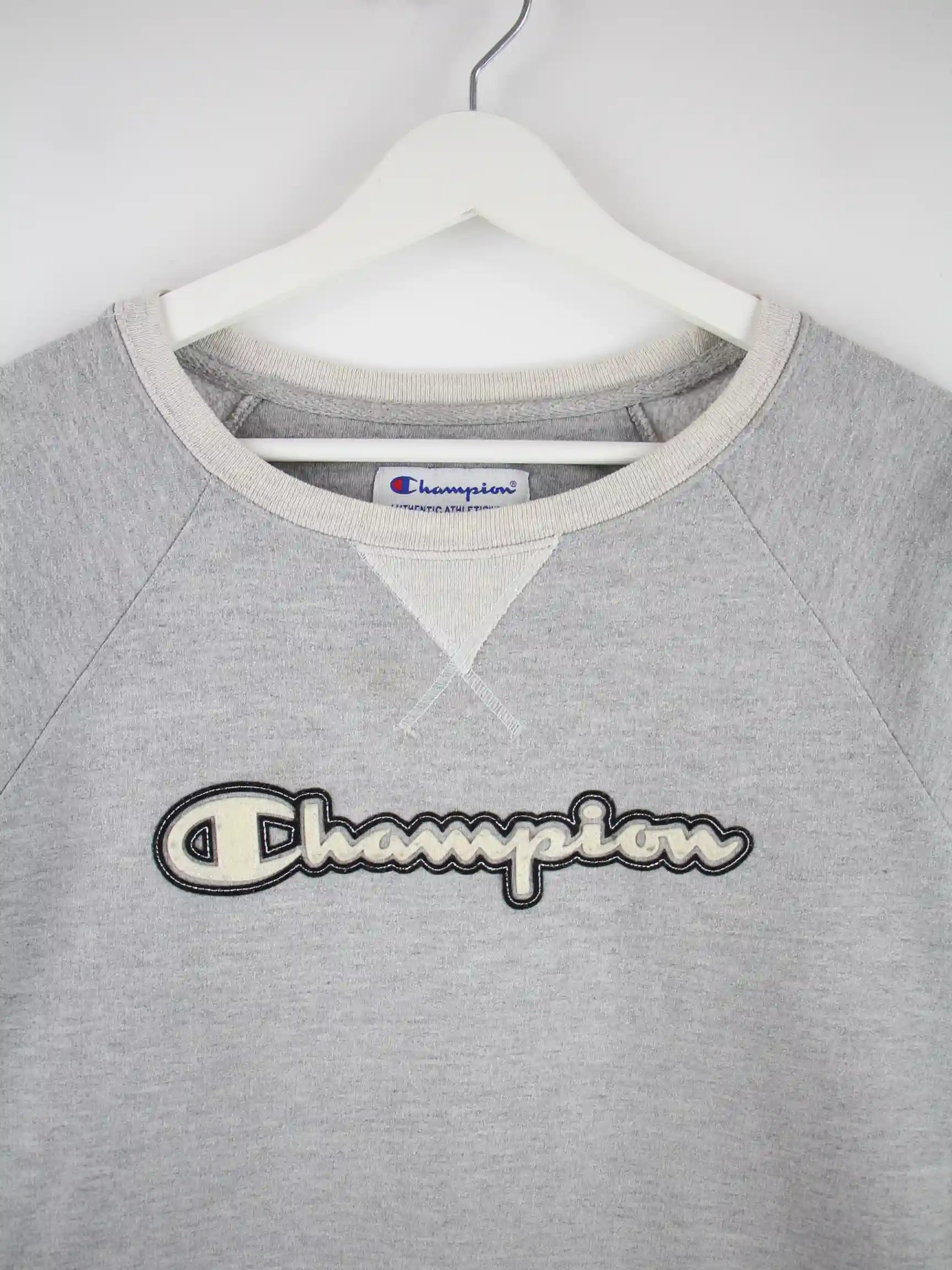 Grauer Sweater aus dem Hause Champion in Größe S. Er ist aus einer Baumwollmischung angefertigt und in gutem Zustand in Stock.