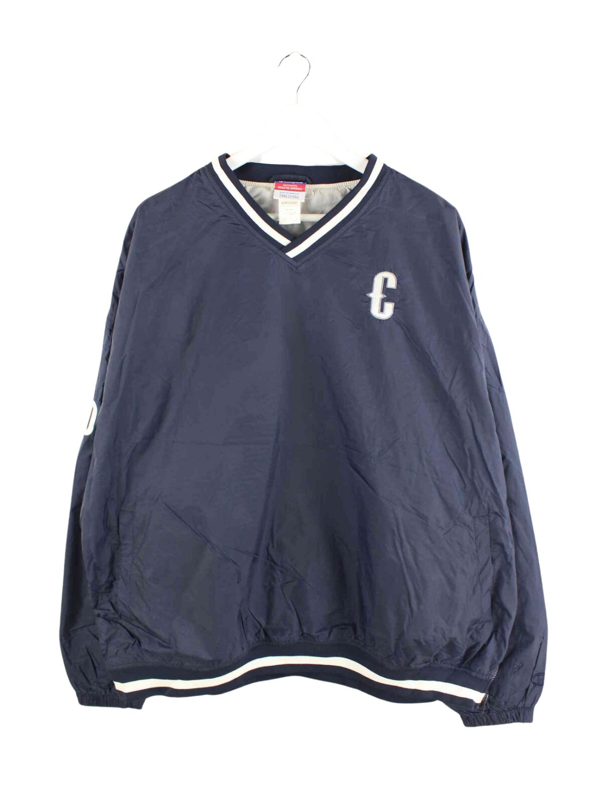 Blauer Sweater der Brand Champion aus Anfang der 2000'er in Größe 3XL. Er ist aus Synthetik produziert und in gutem Zustand zu bekommen. Mit schönem Clippers Print.