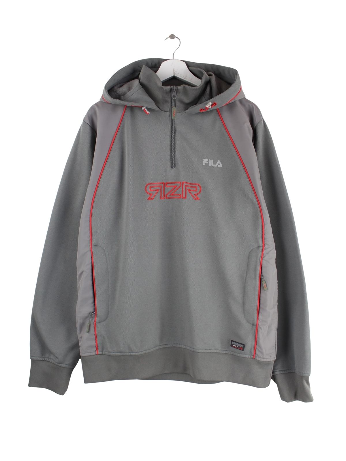Hoodie aus dem Hause Fila mit Stickereien und half Zip in Größe L. Er ist aus Synthetik hergestellt und in Grau bei uns zu bekommen.