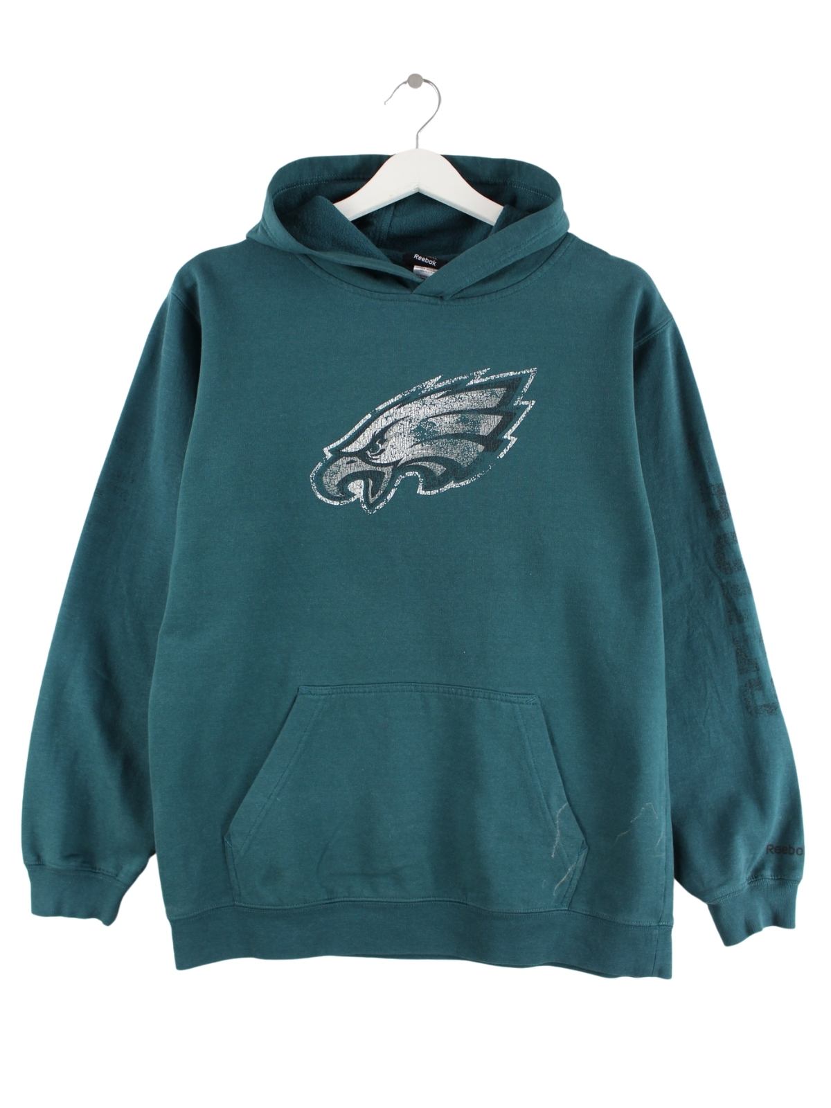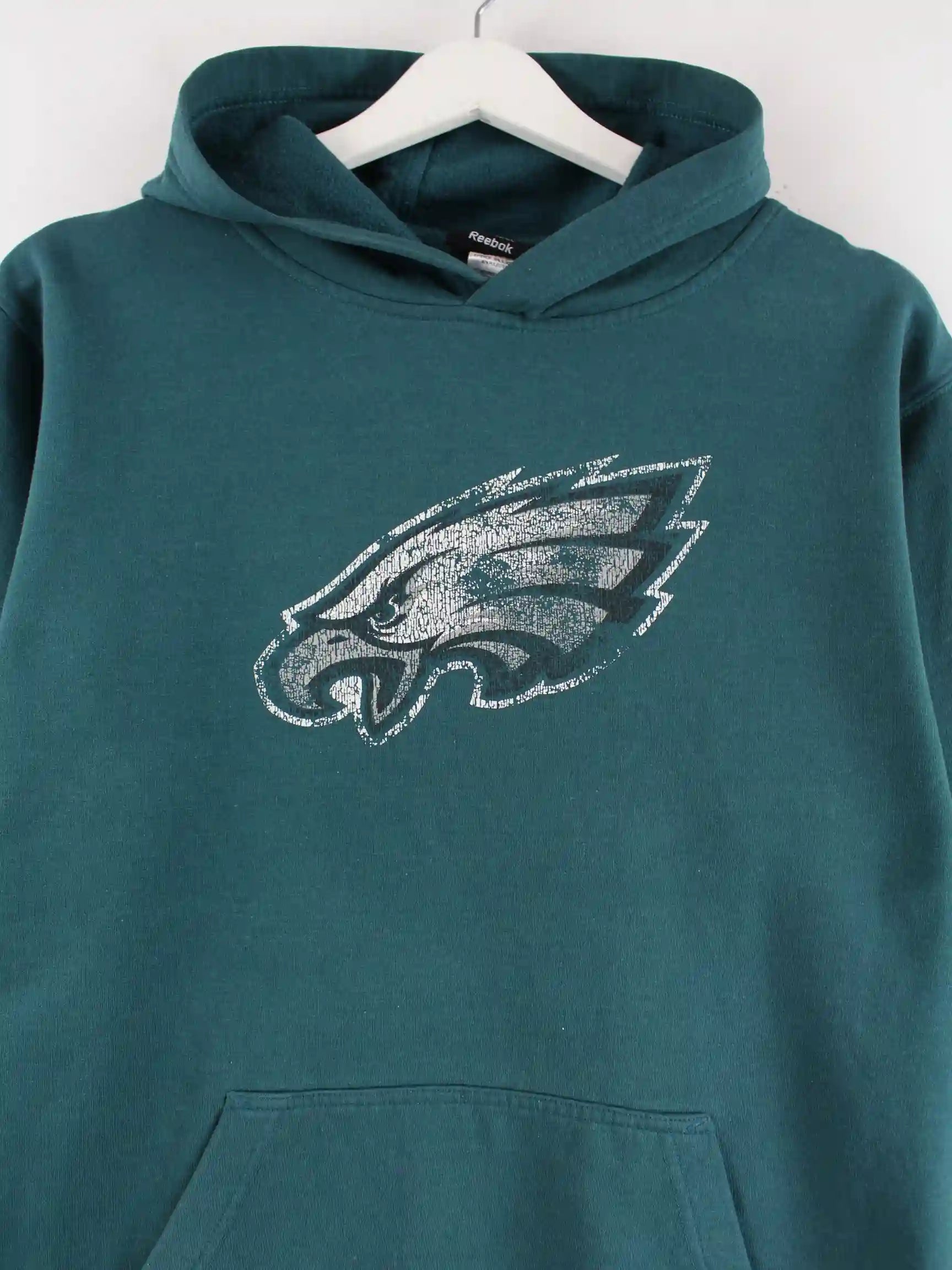 Hoodie von Reebok in Größe L. Er ist aus einer Baumwollmischung angefertigt und in Grün vorrätig. Mit schönem Eagles Print.