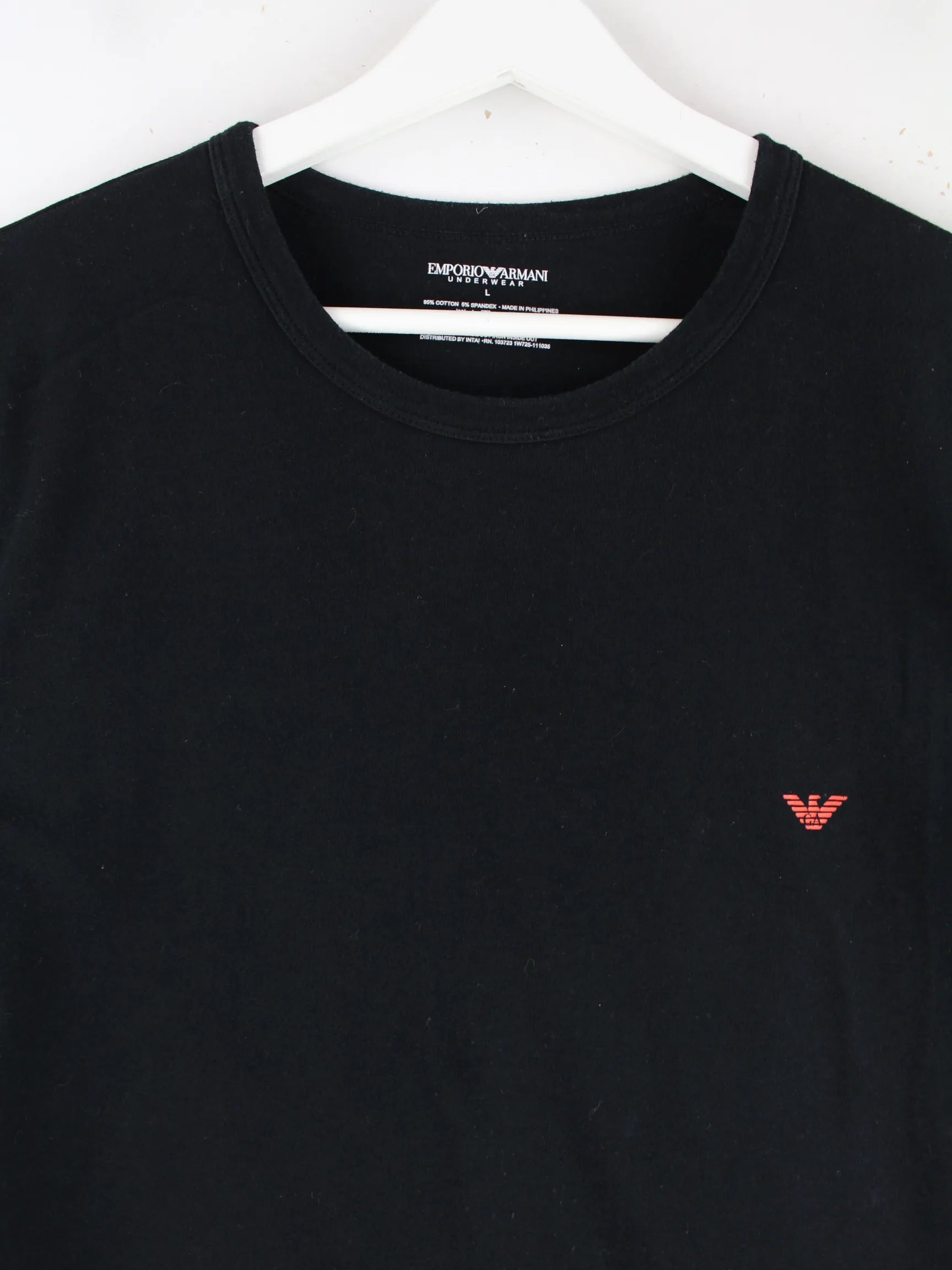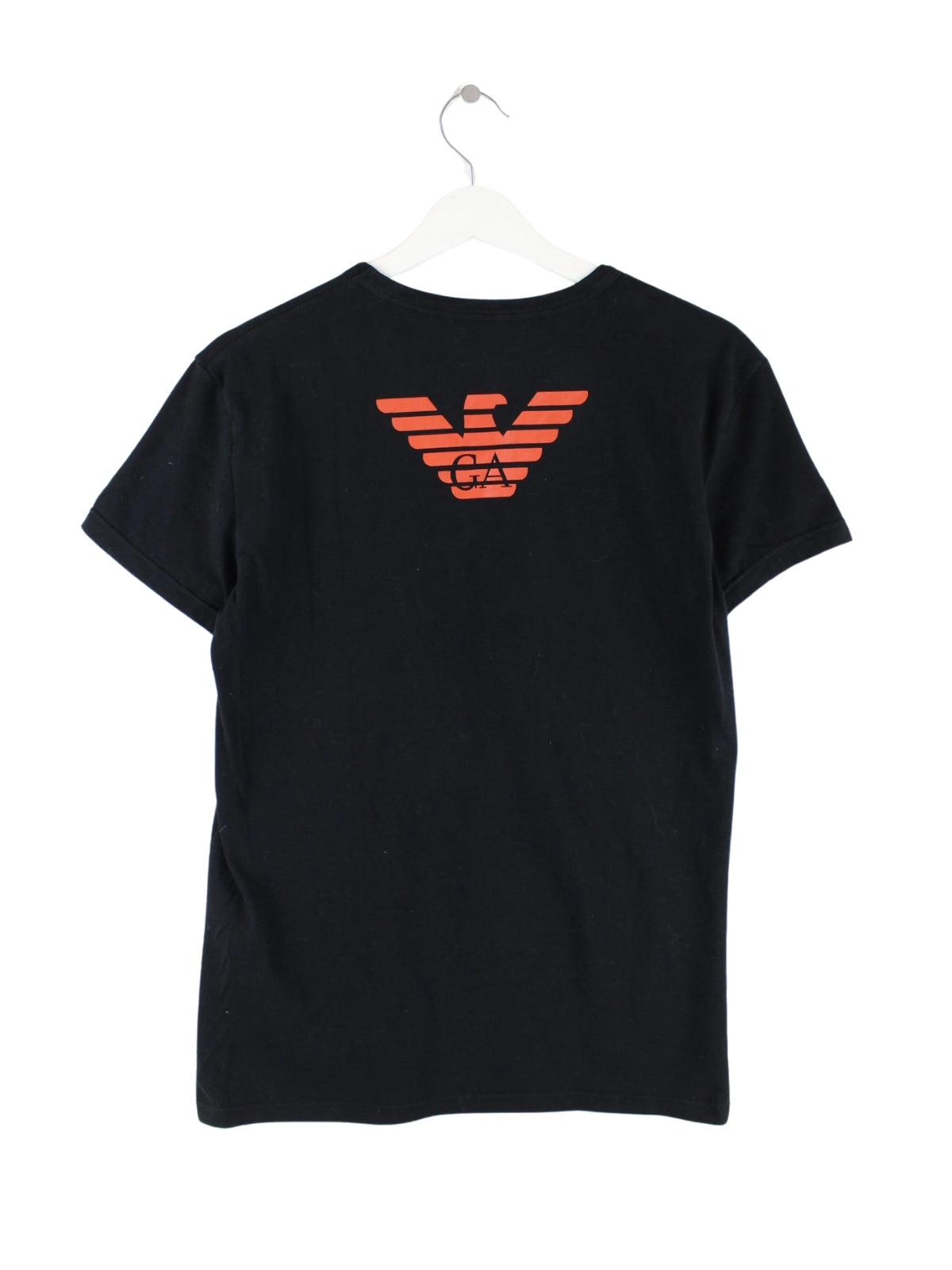 T-Shirt vom Label Armani in Größe L. Es ist aus einer Baumwollmischung angefertigt und in Schwarz zu haben.