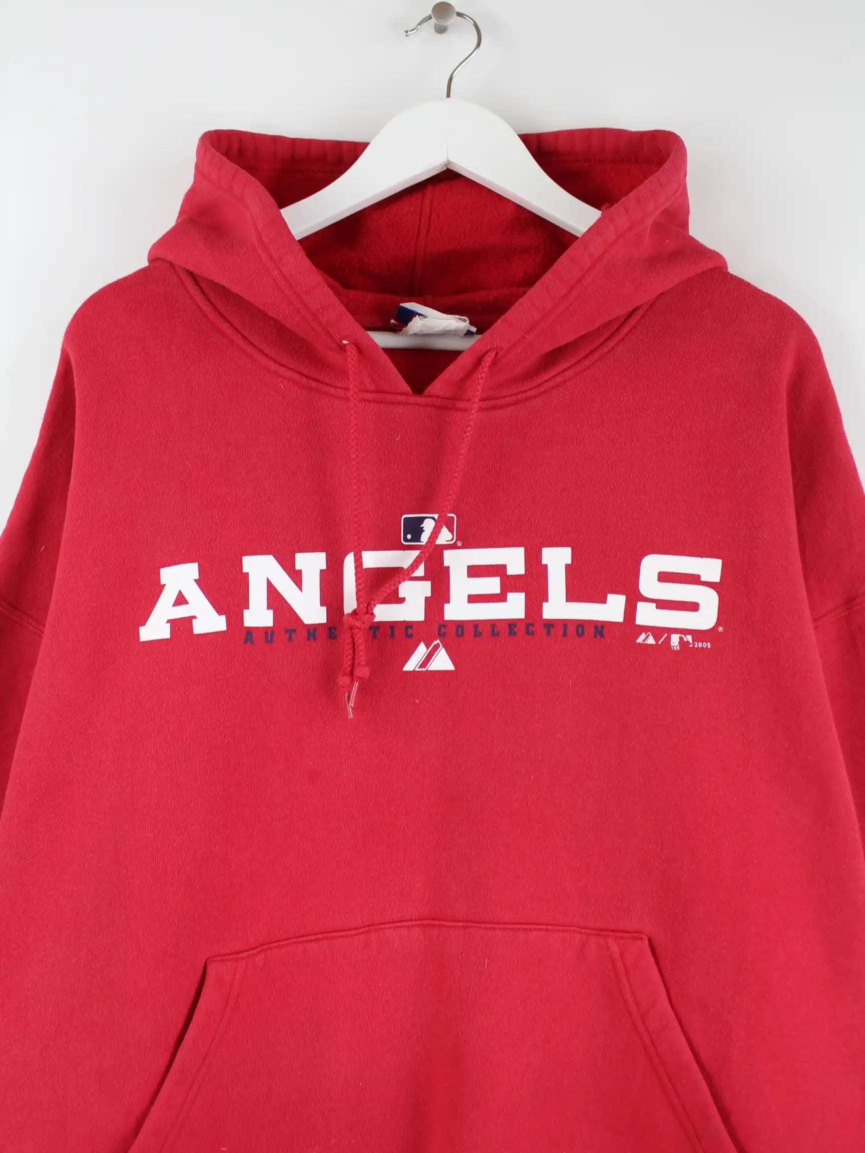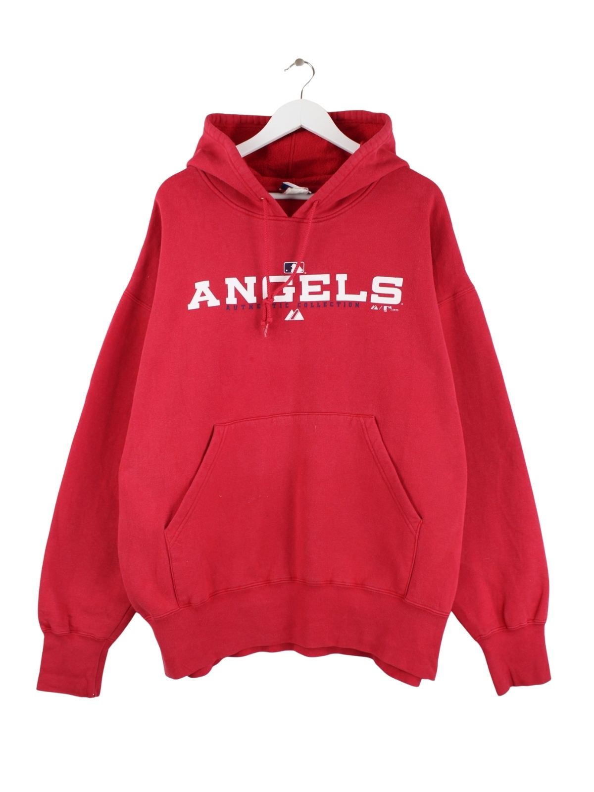Roter Hoodie der Brand Majestic in Größe XXL. Er ist aus einer Baumwollmischung gemacht. Den Zustand würden wir als 'In Ordnung' bezeichnen (vergl. Bilder).Mit seltenem Angels Print.