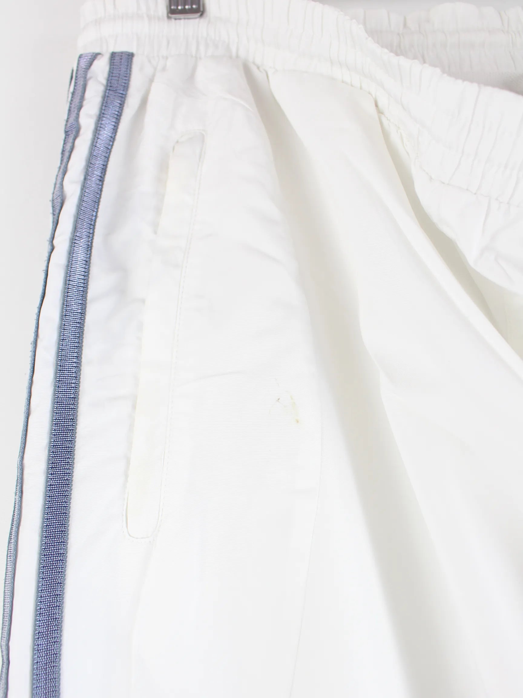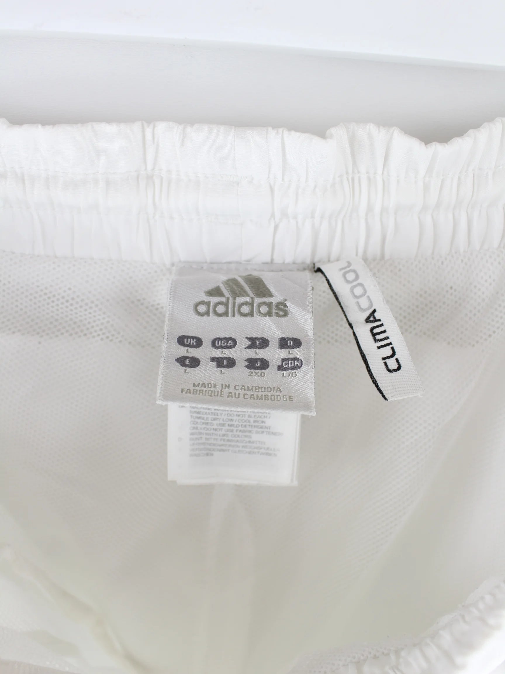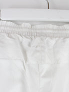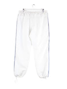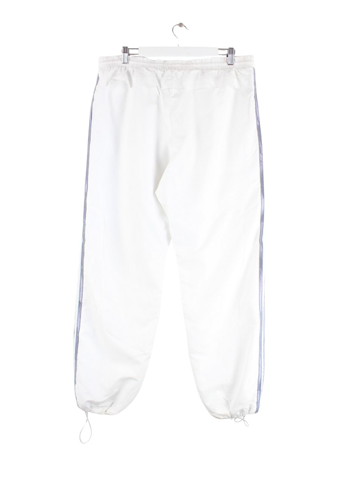 Weiße Track Pants der Brand Adidas in Größe L. Sie sind aus Synthetik gefertigt. Den Zustand würden wir als 'In Ordnung' bezeichnen (vergl. Bilder).