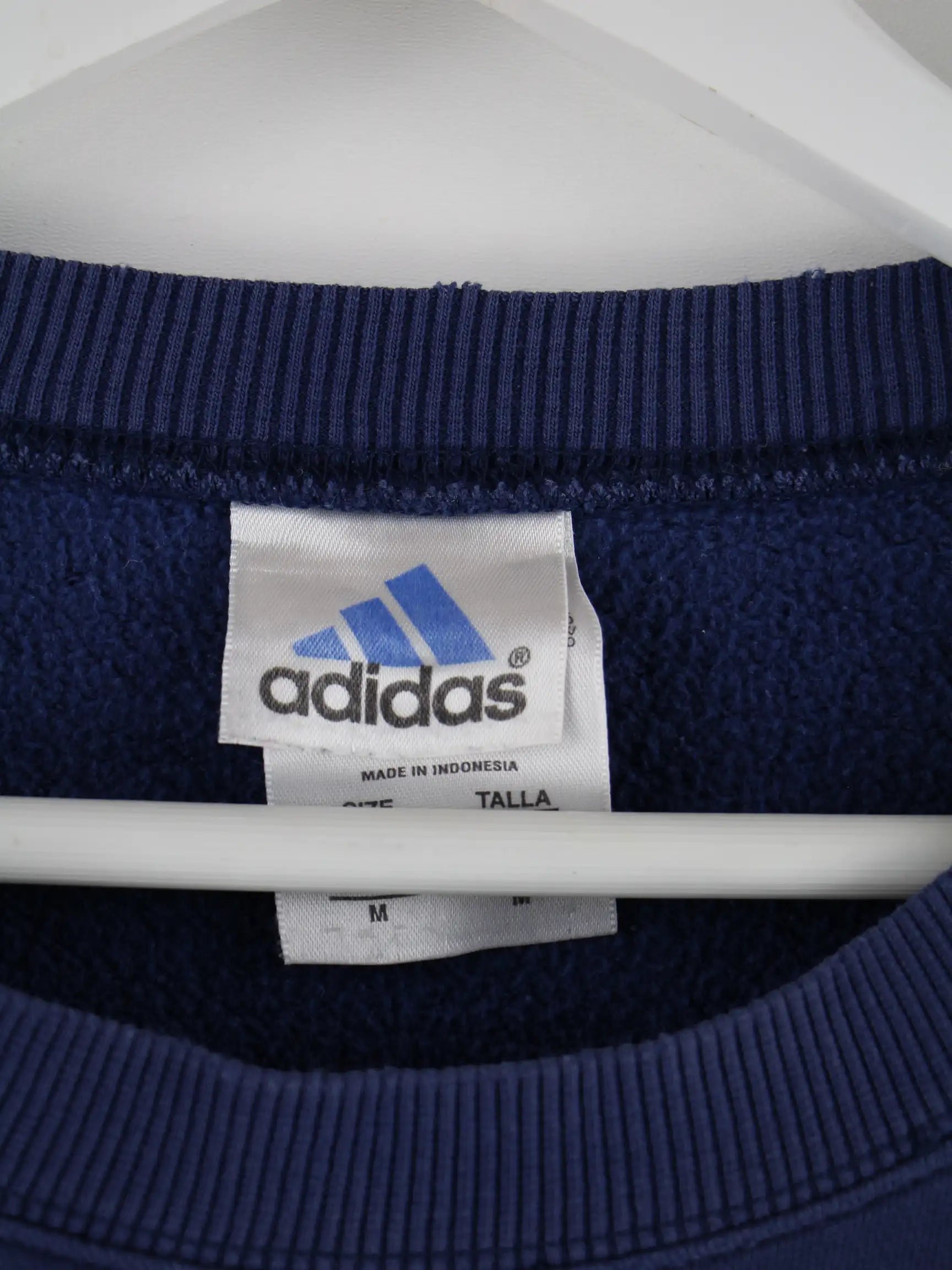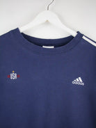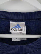 Sweater vom Label Adidas in Größe M aus den 90'ern. Er ist aus einer Baumwollmischung gefertigt und in Blau bei uns zu bekommen.