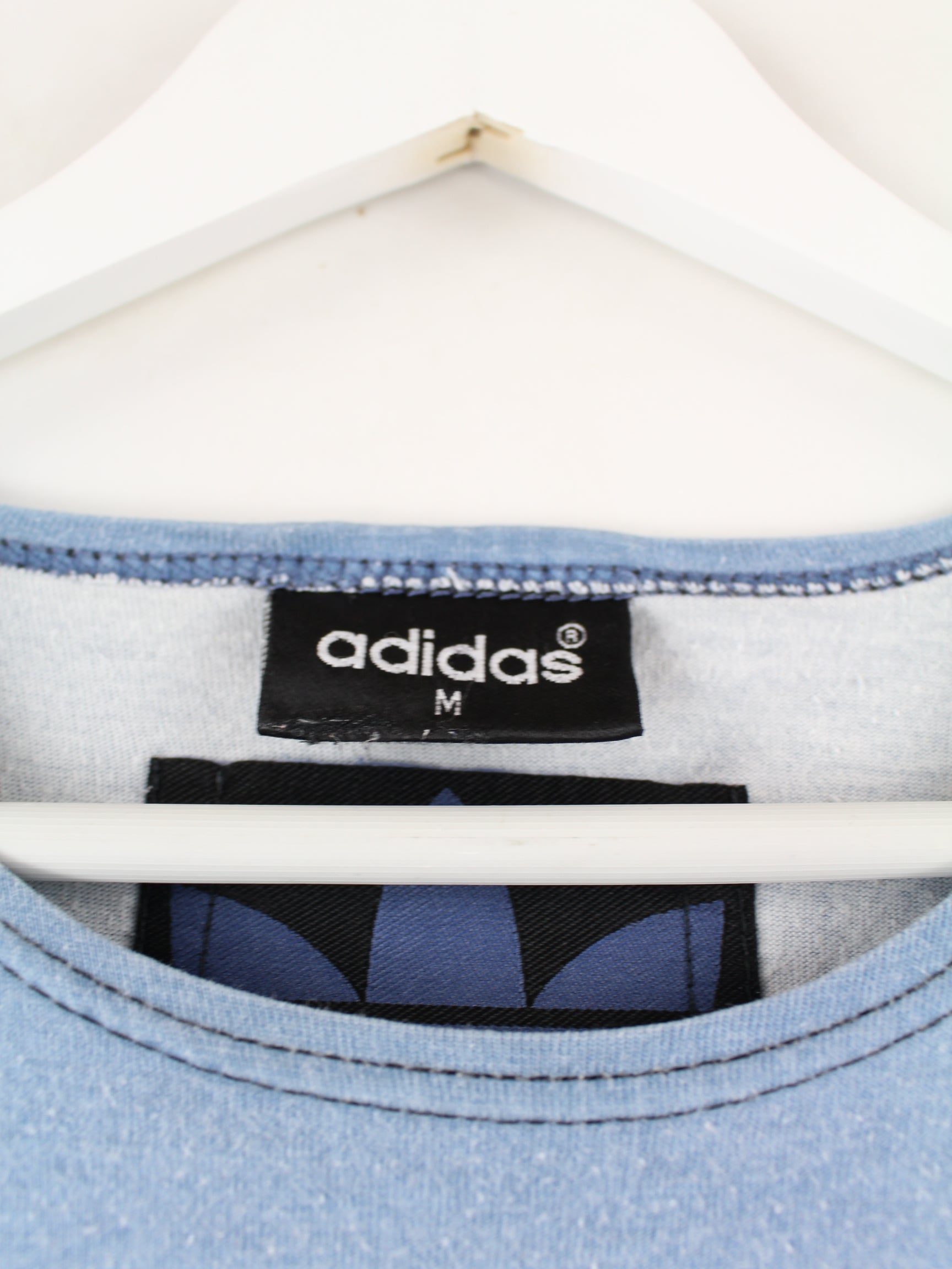 Blaues T-Shirt von Adidas aus den 90'ern in Größe M. Es ist aus Baumwolle gefertigt und in sehr gutem Zustand zu bekommen. Mit chiquem Trefoil Print.
