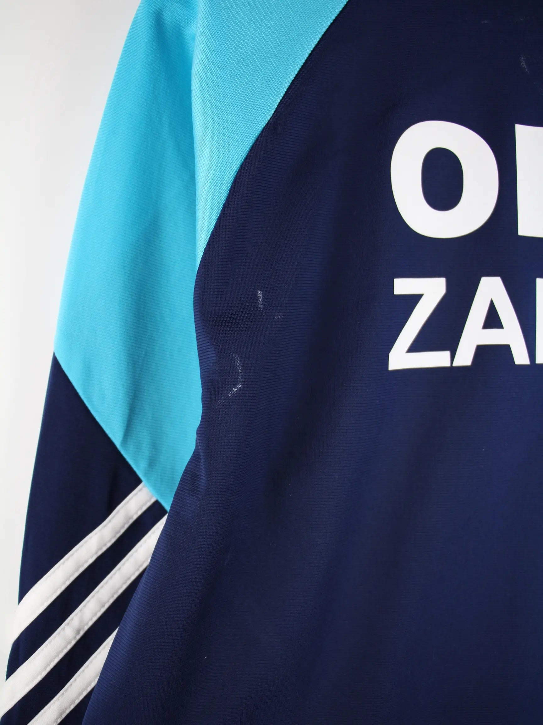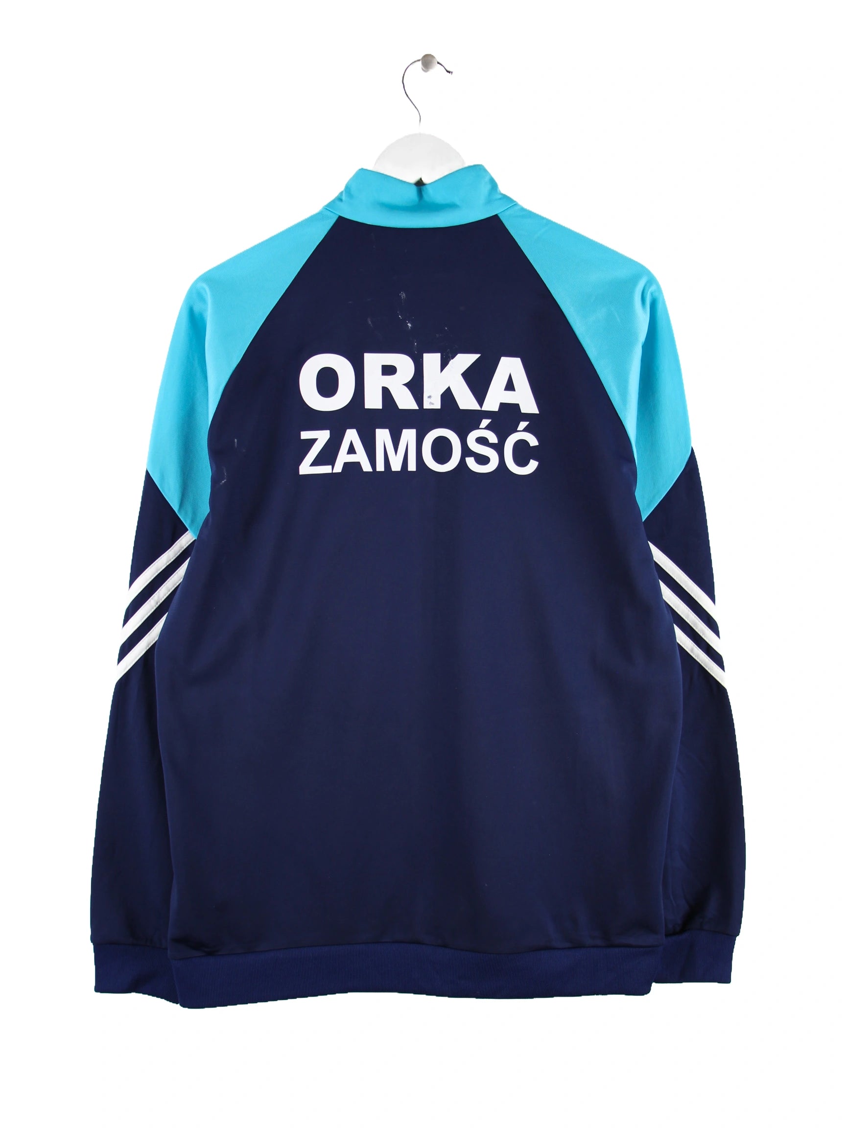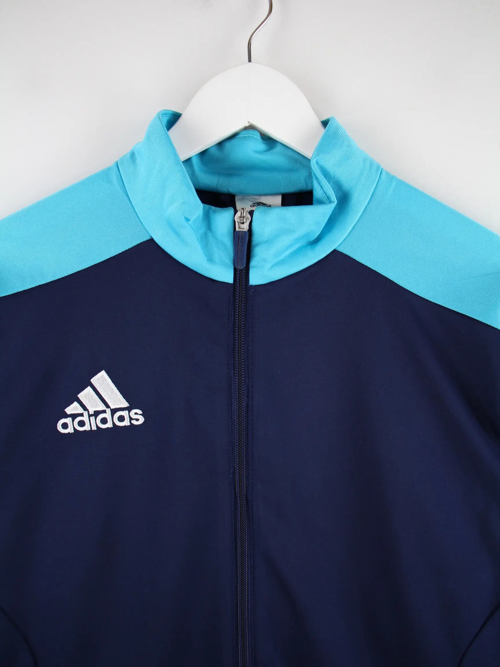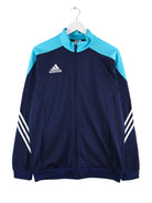 Blaue Trainingsjacke vom Label Adidas in Größe M. Sie ist aus Synthetik . Den Zustand würden wir als 'In Ordnung' bezeichnen (vergl. Bilder).Mit schickem Print.