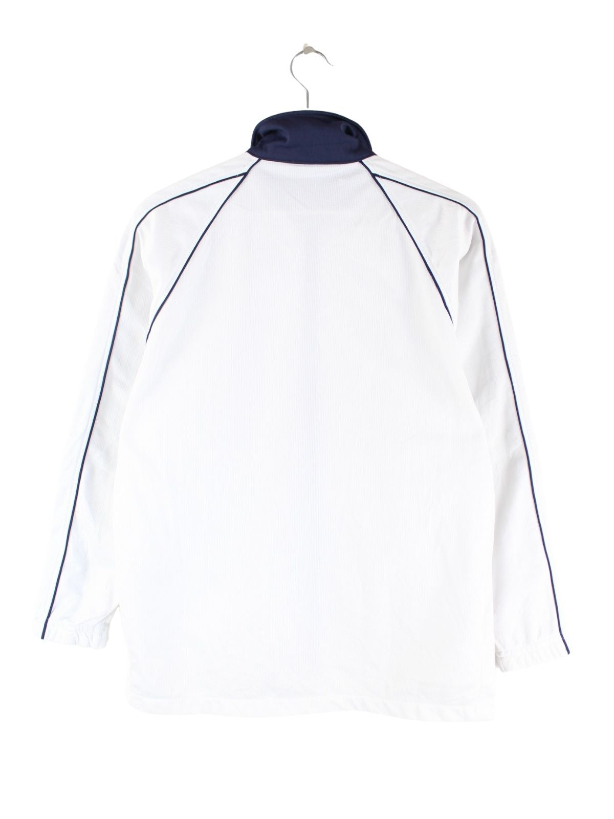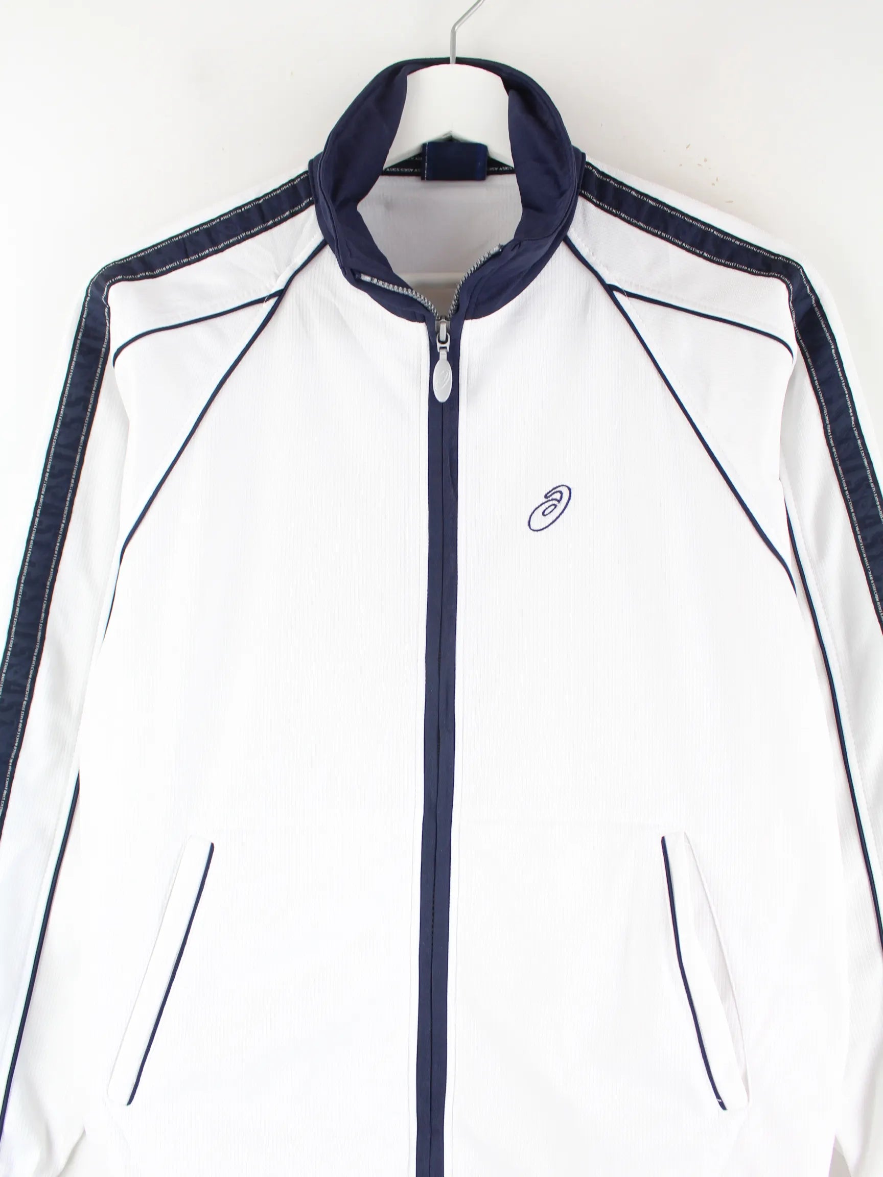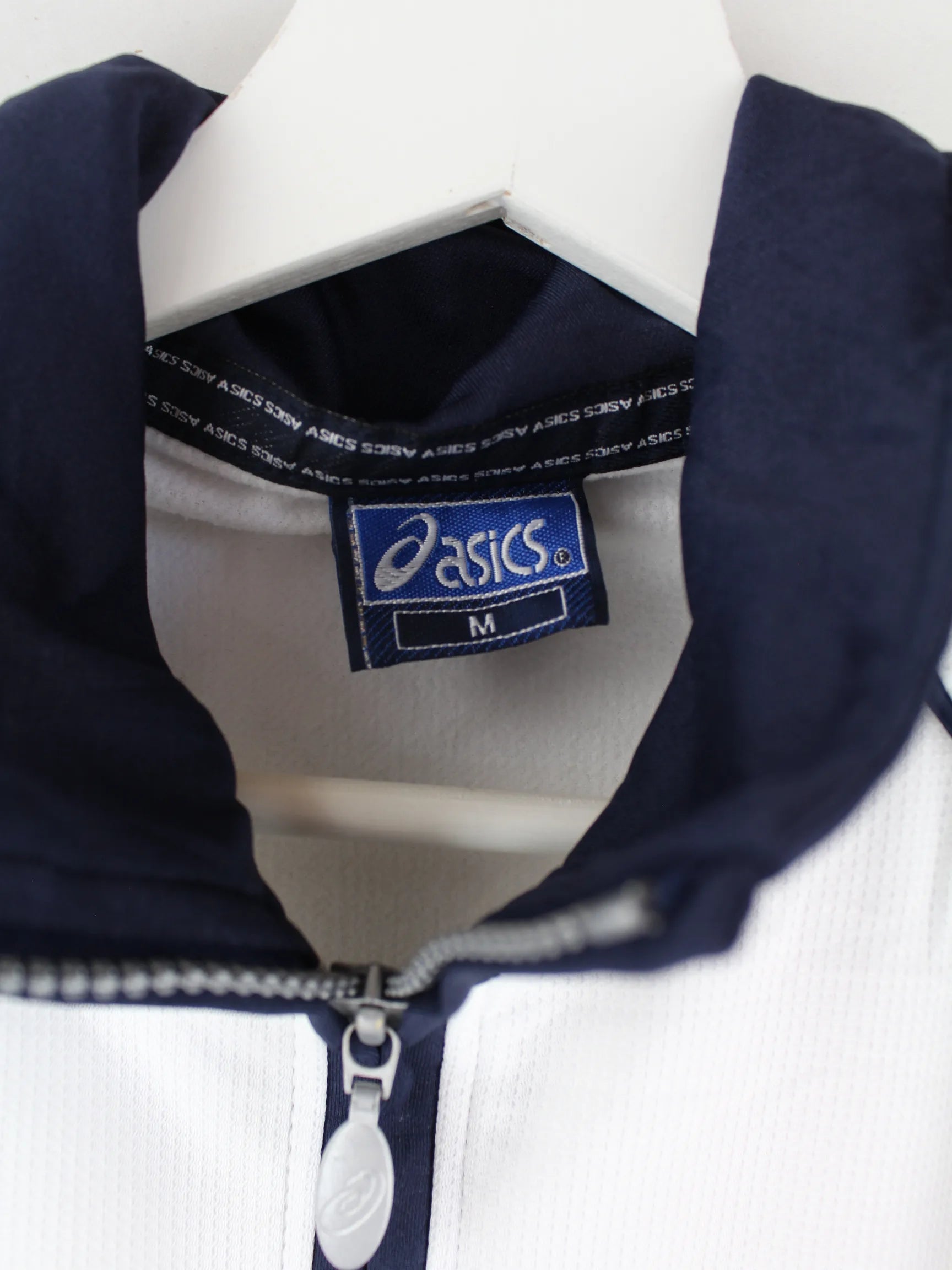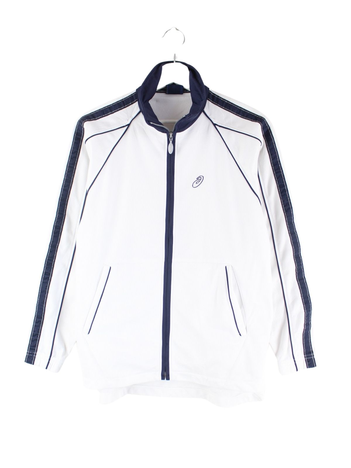 Weiße Trainingsjacke der Brand Asics in Größe M. Sie ist aus Synthetik und in sehr gutem Zustand auf Lager.