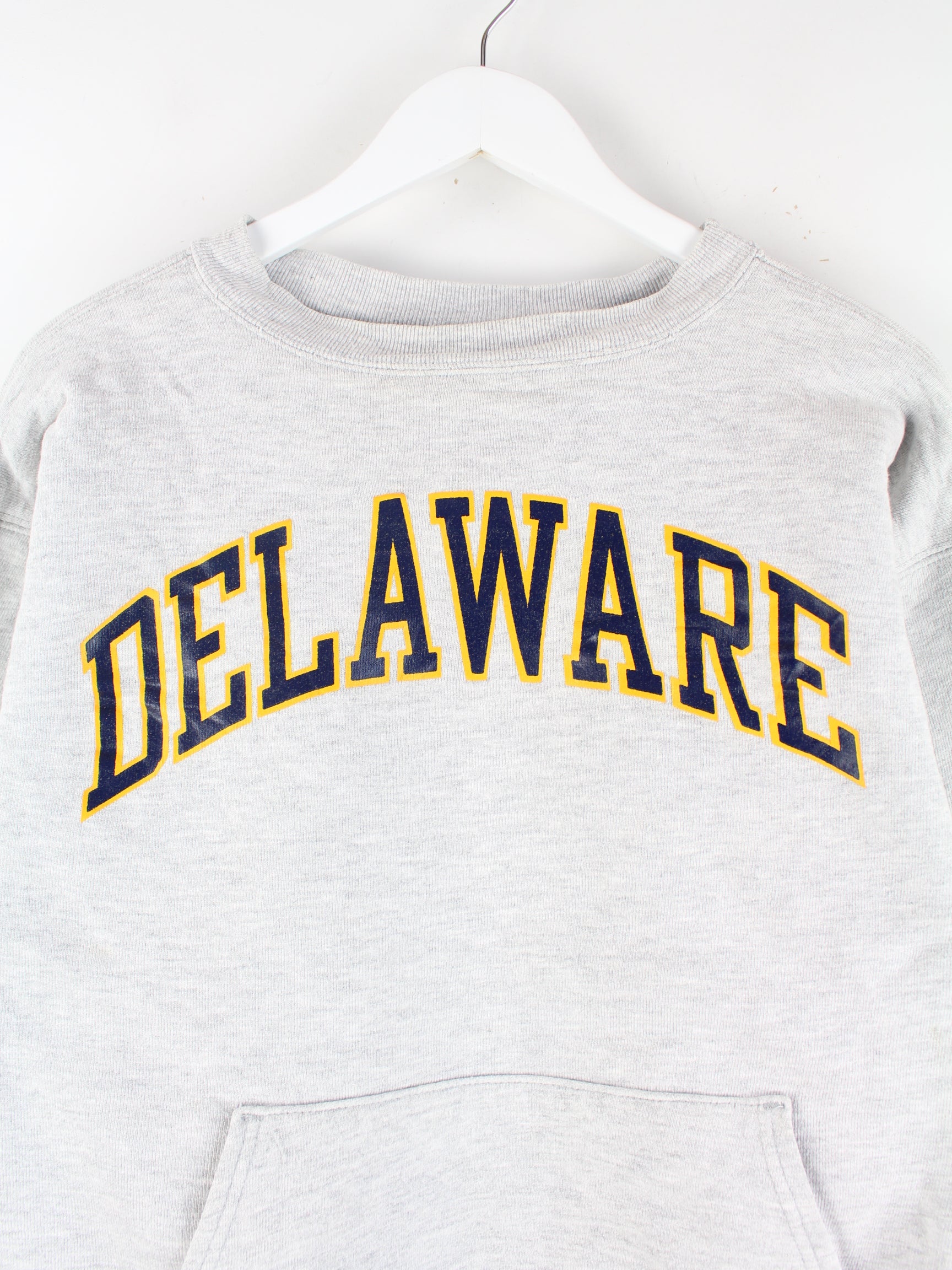 Sweater der Marke Champion in Größe XXS. Er ist aus einer Baumwollmischung und in Grau bei uns vorrätig. Mit tollem Delaware Print.