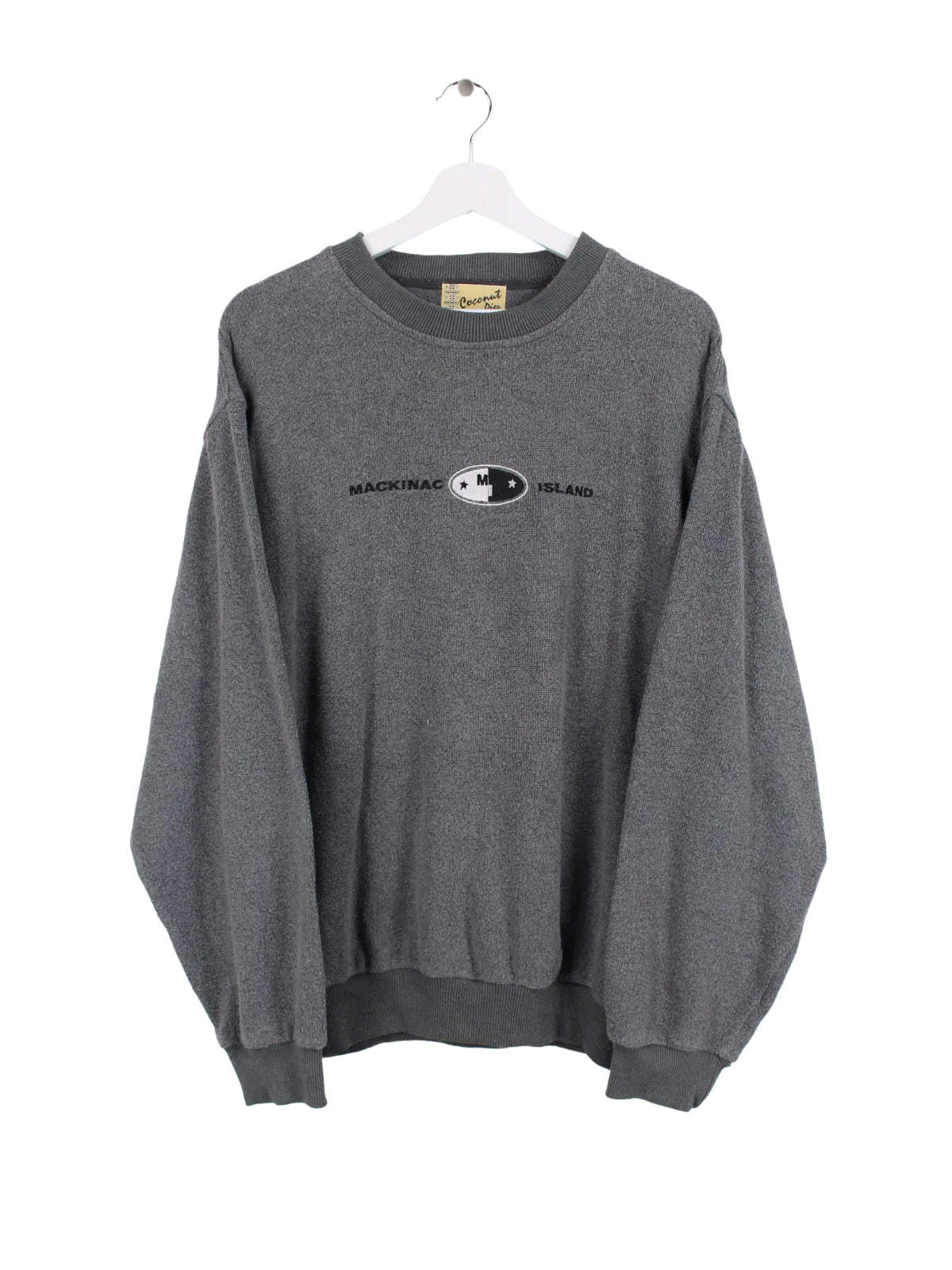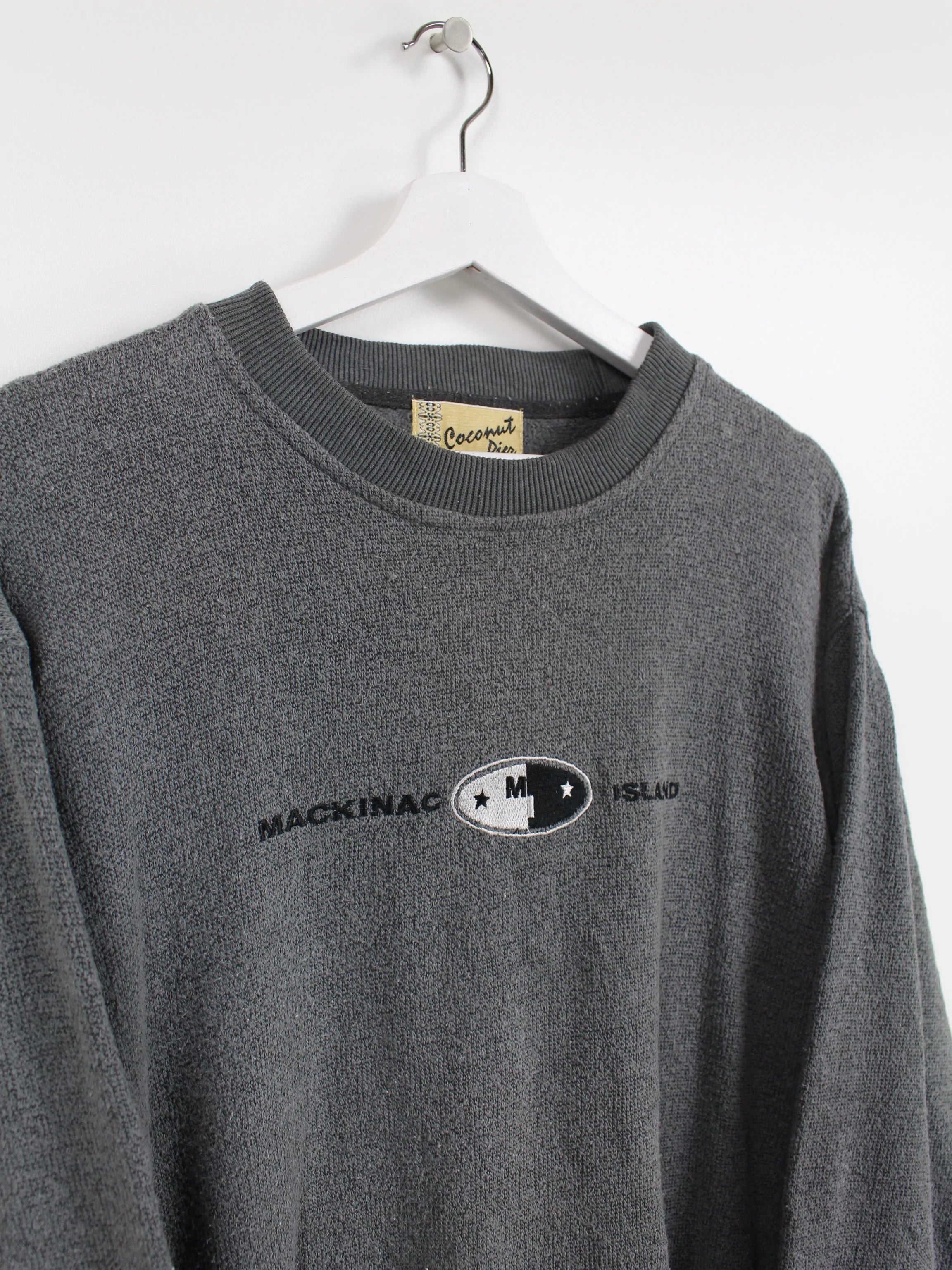 Grauer Mackinag Island Sweater mit gesticktem Schriftzug.