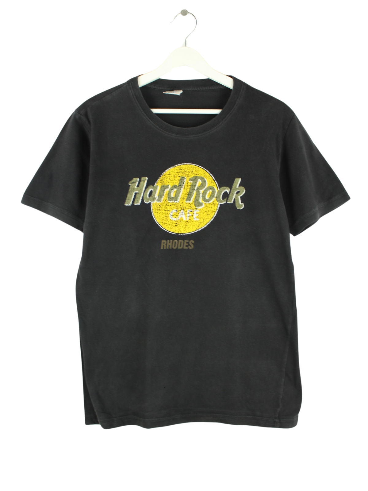 Schwarzes T-Shirt des Labels Hard Rock Cafe in Größe XS. Es ist aus Baumwolle hergestellt und in sehr gutem Zustand bei uns zu bekommen. Mit seltenem Rhodes Print.