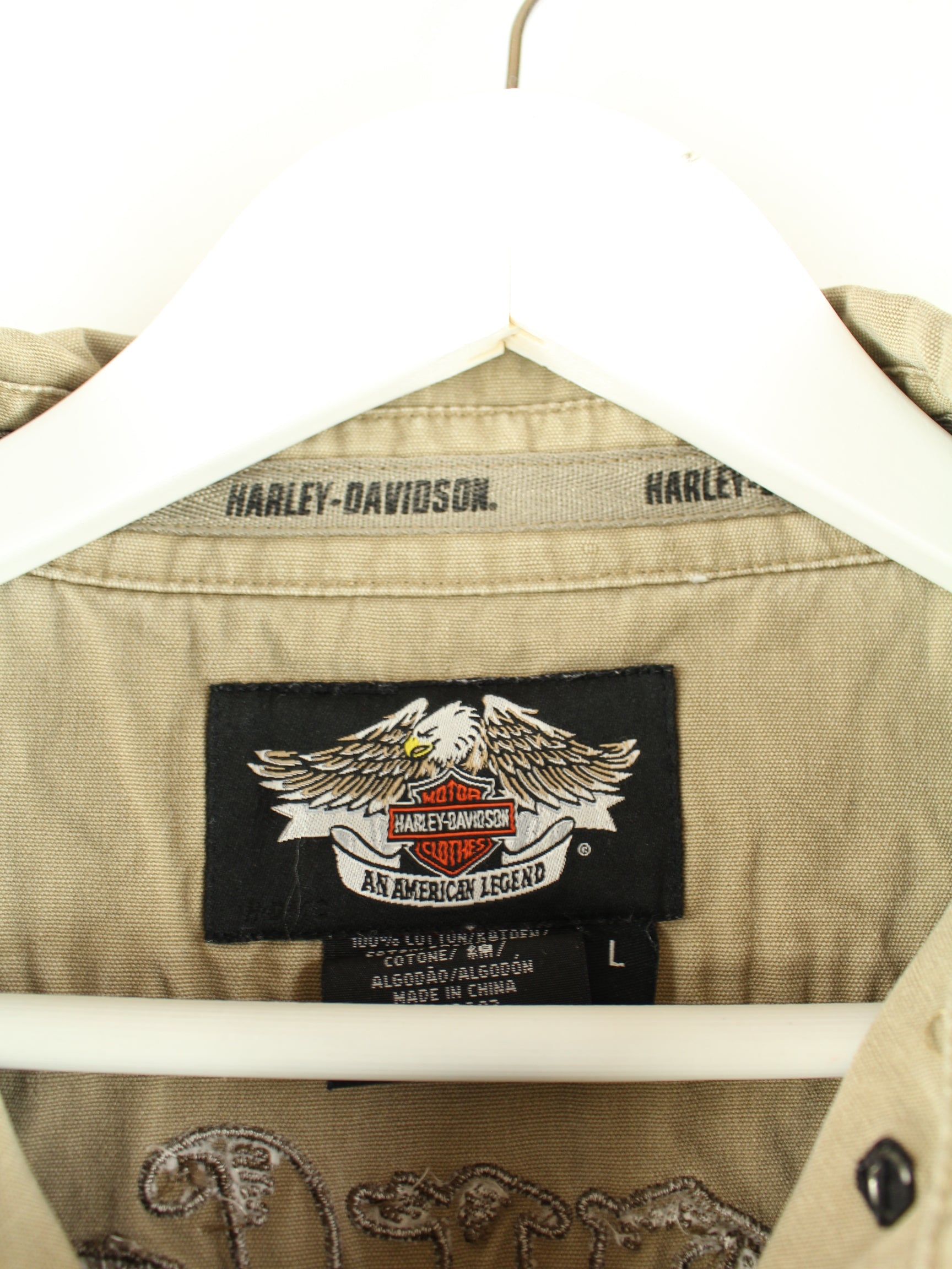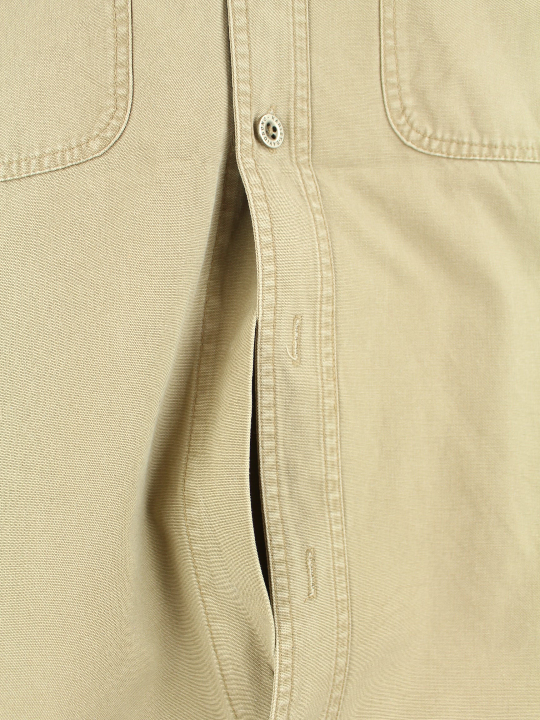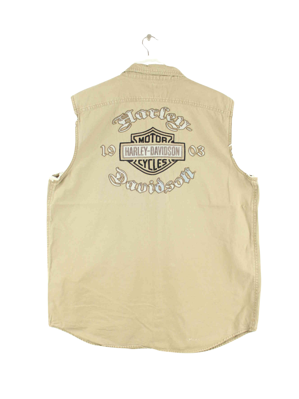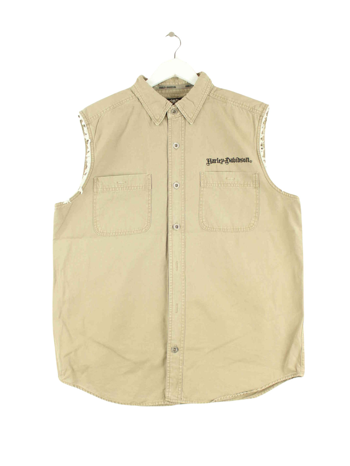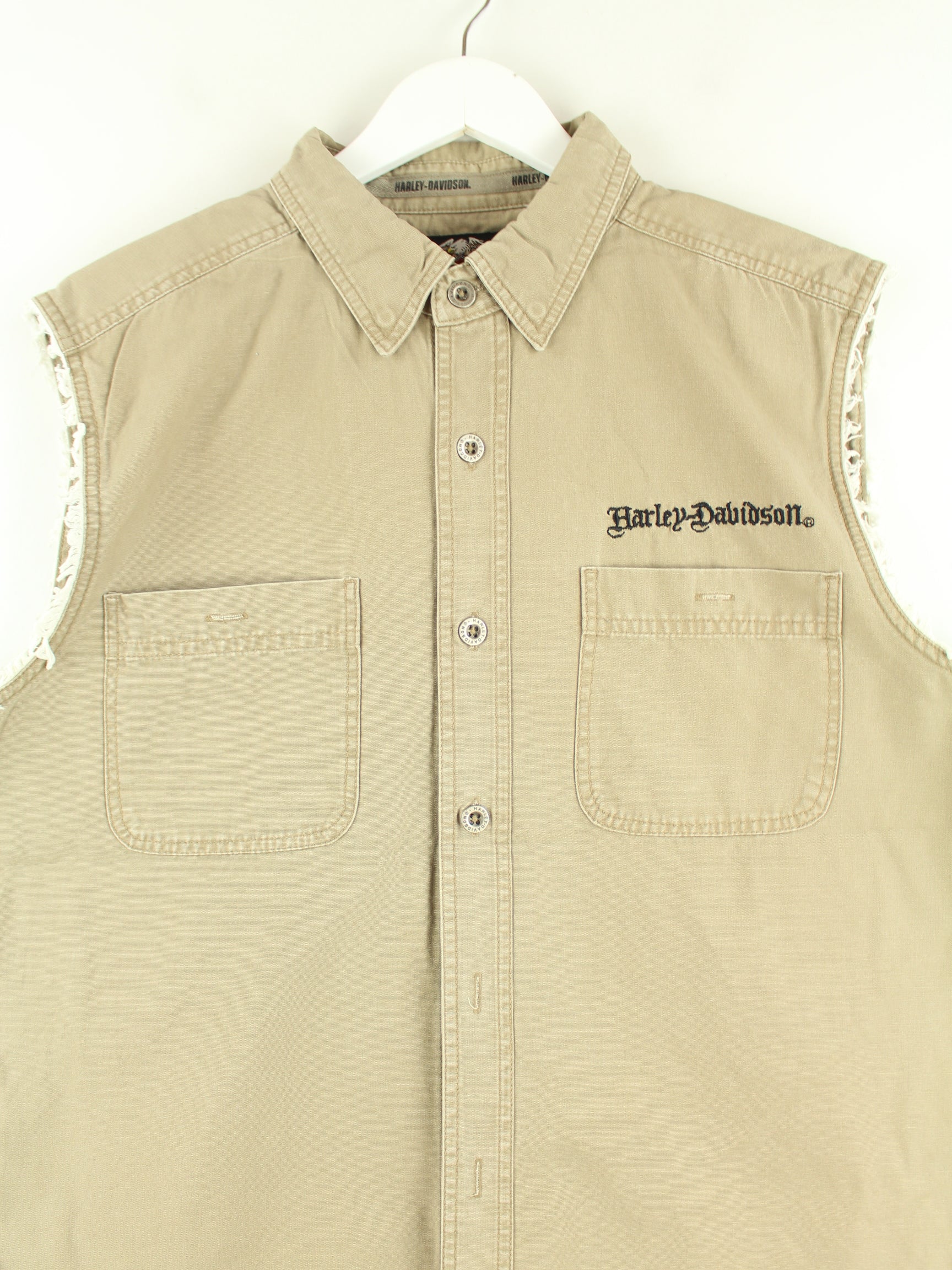 Beigefarbene Weste vom Label Harley Davidson aus den 90'ern in Größe L. Sie ist aus Baumwolle und in gutem Zustand zu haben.