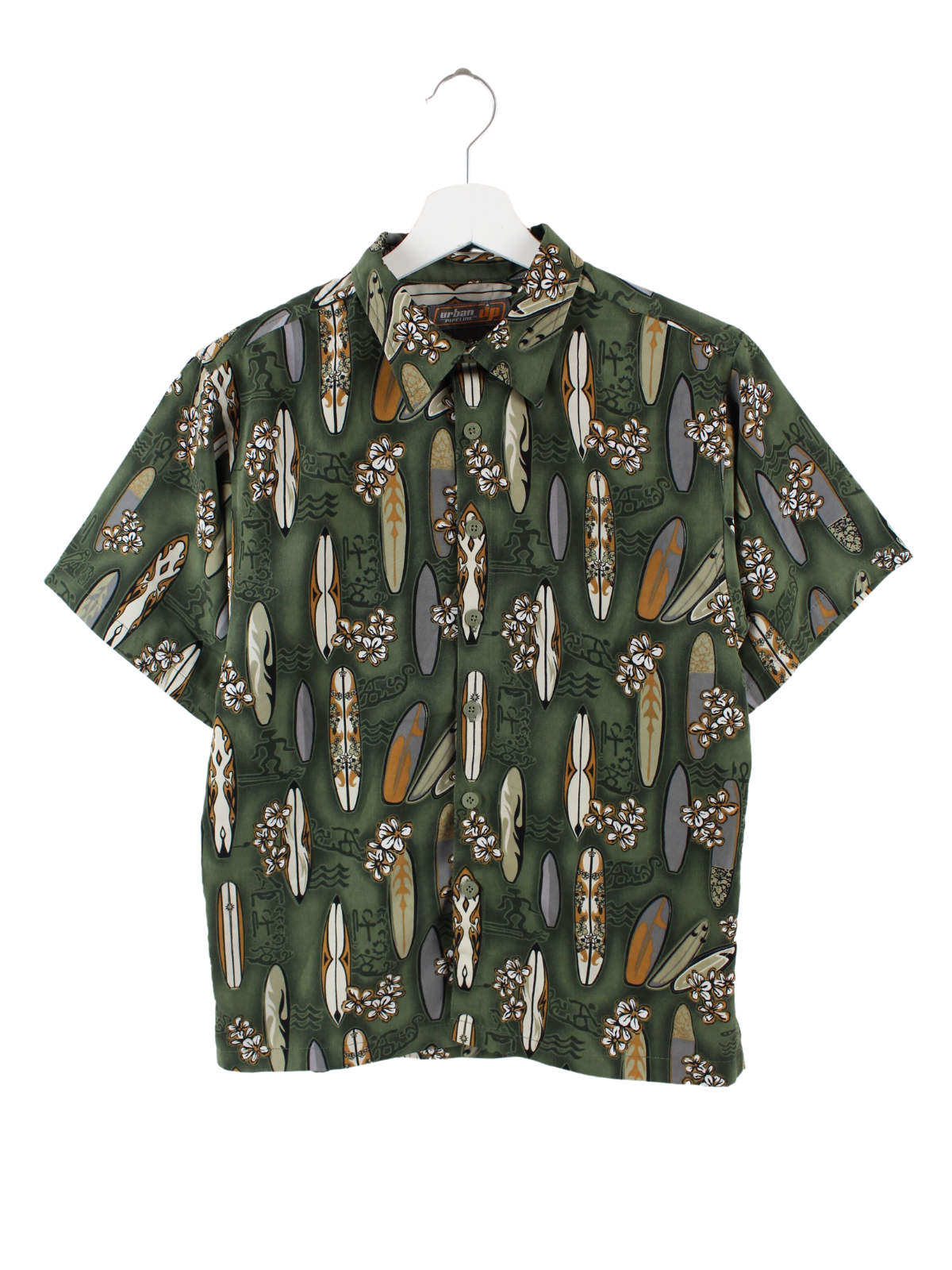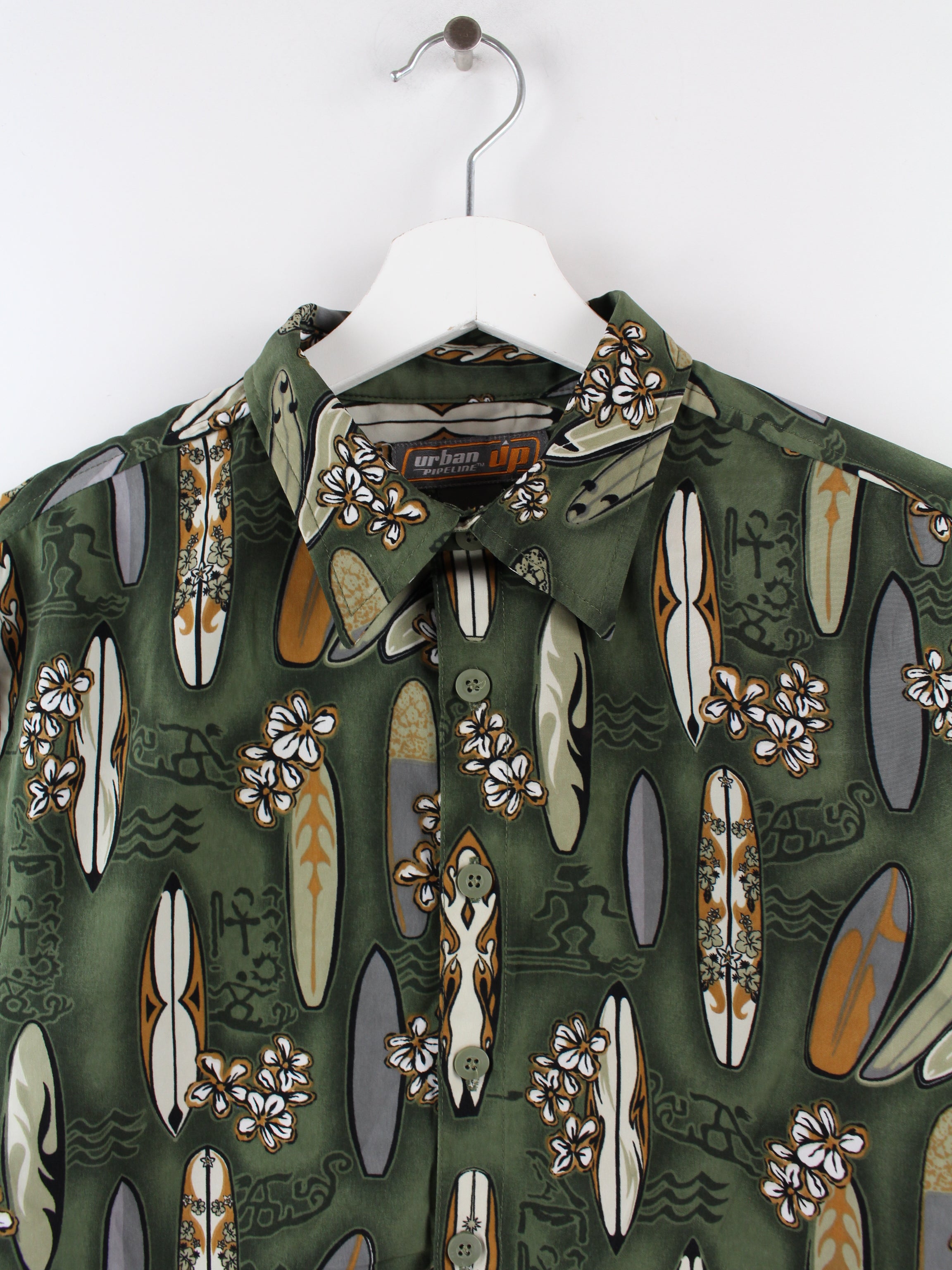Grünes Hawaii Hemd mit Surfboard Print.
