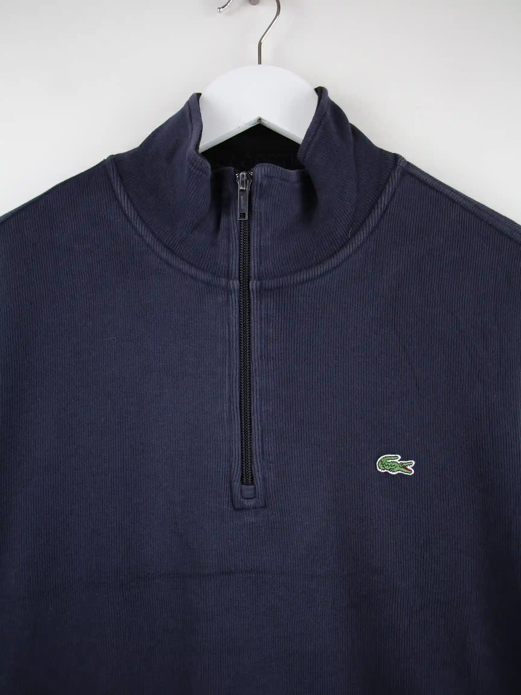 Blauer Sweater mit kurzem Reißverschluß vom Brand Lacoste in Größe XL. Er ist aus einer Baumwollmischung und in gutem Zustand lieferbar.