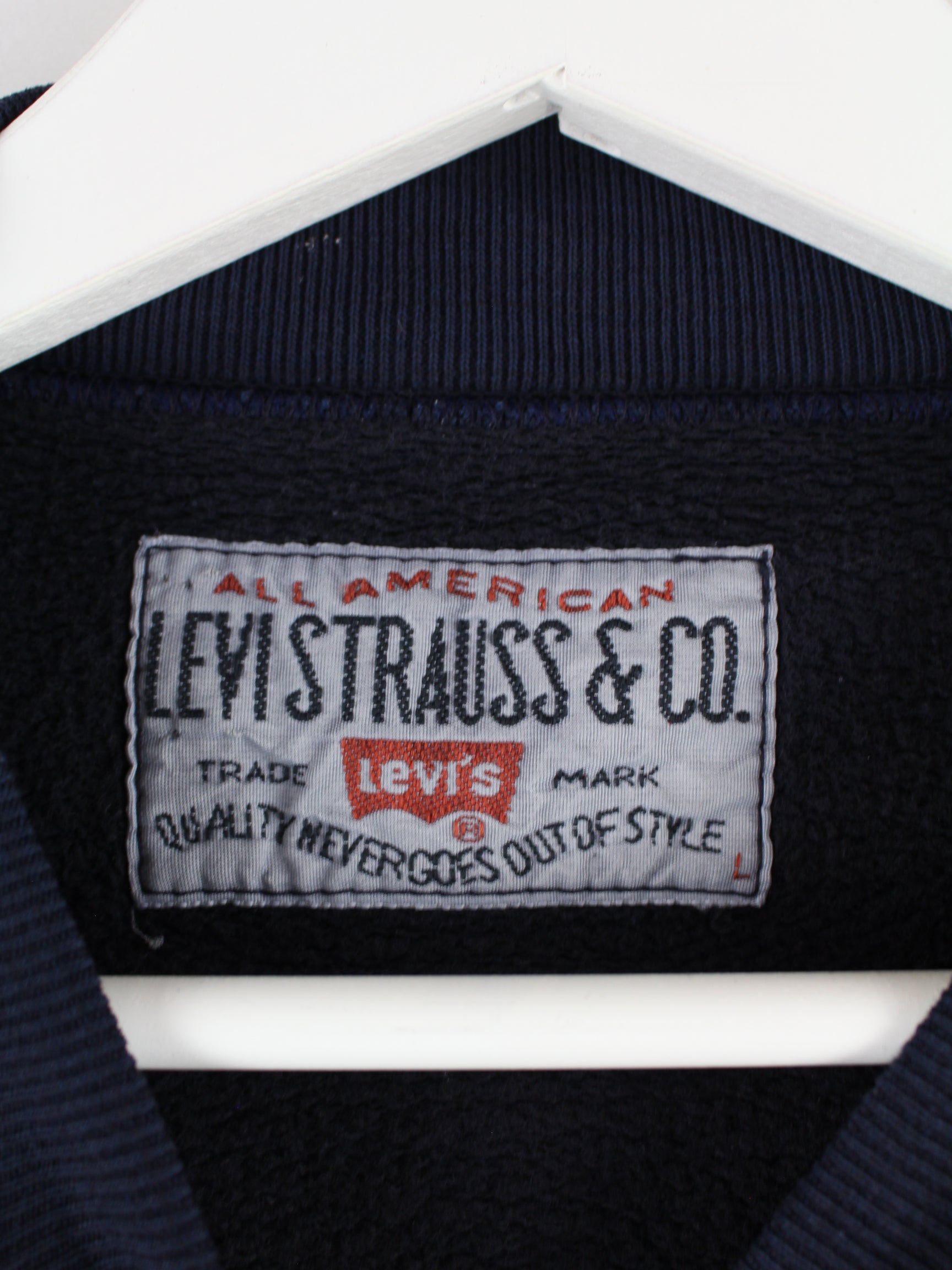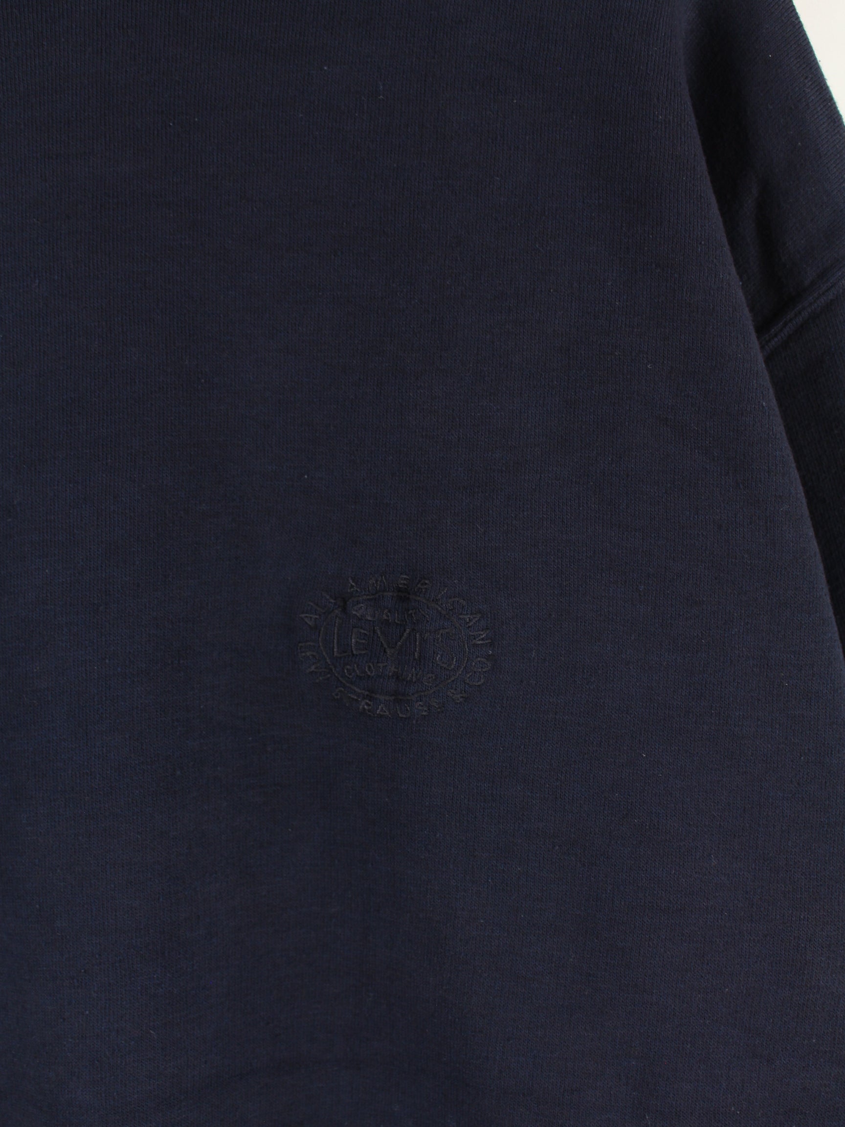 Sweater des Labels Levi's mit gestickten Motiven in Größe L. Er ist aus einer Baumwollmischung und in Blau lieferbar.