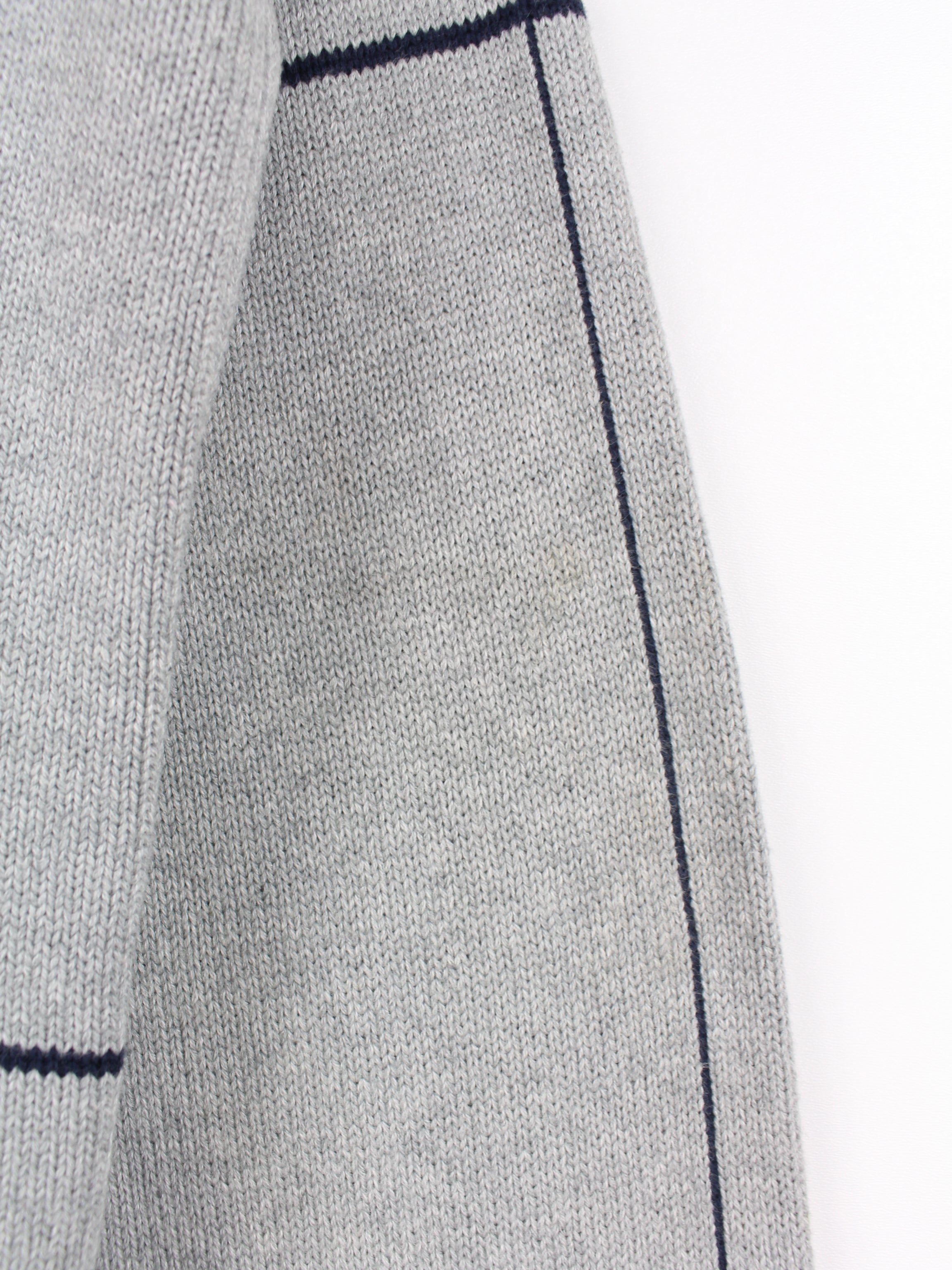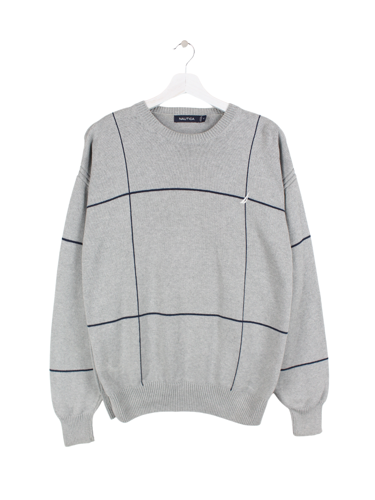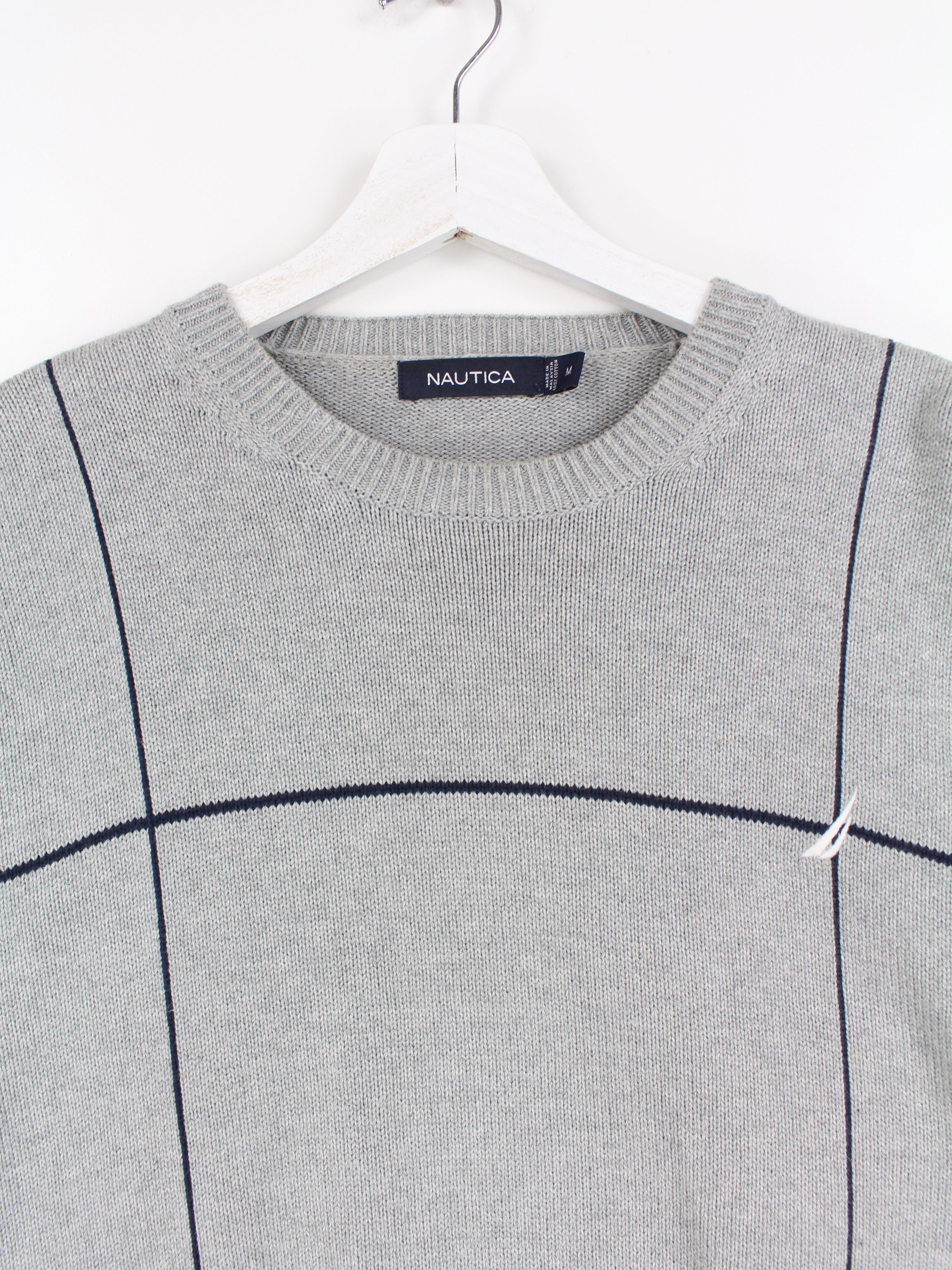 Grauer Nautica Strickpullover mit schwarzen Streifen.