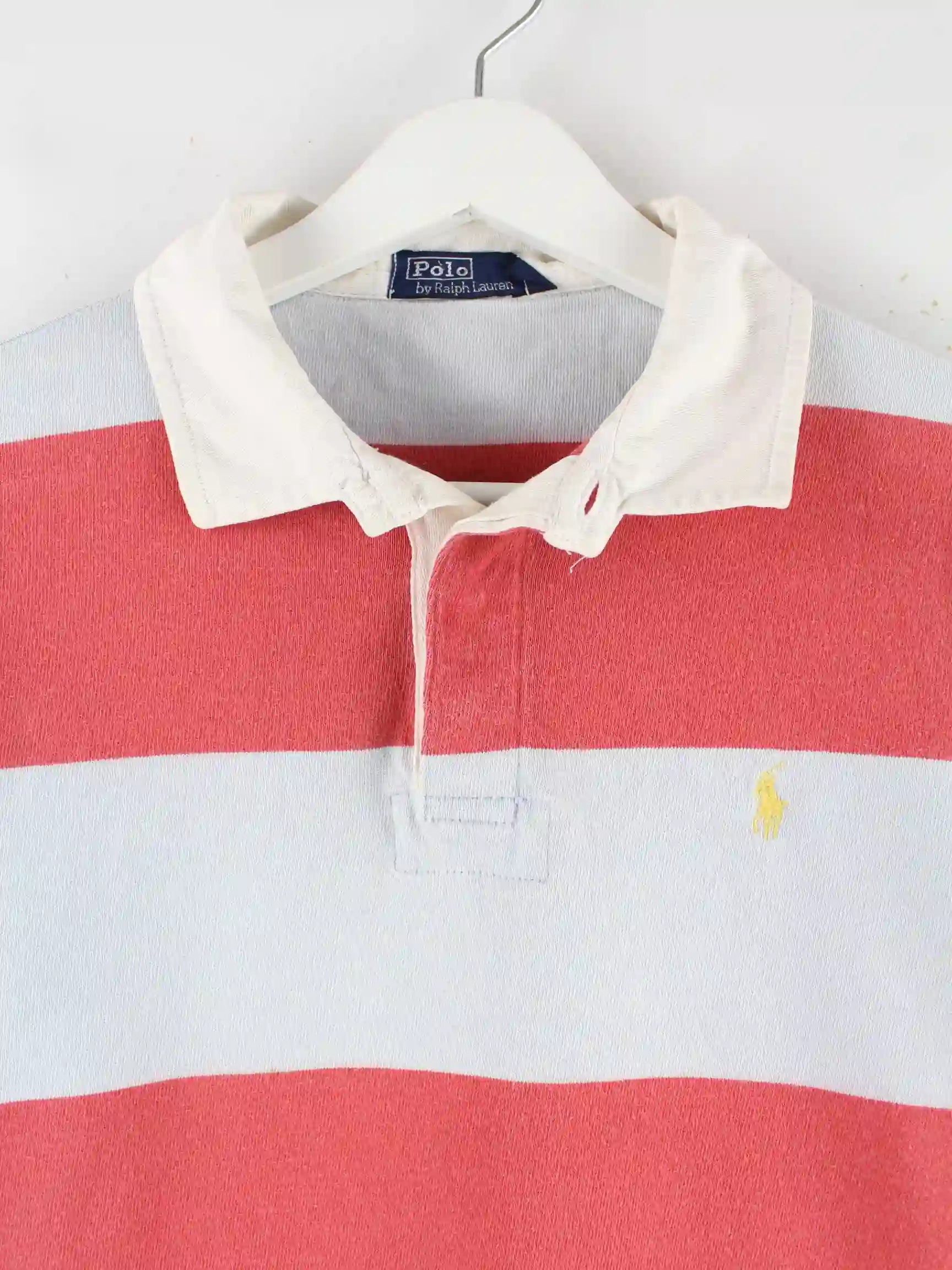 Rotes Poloshirt aus dem Hause Ralph Lauren aus den 90'ern in Größe S. Es ist aus Baumwolle angefertigt. Den Zustand würden wir als 'In Ordnung' bezeichnen (vergl. Bilder).